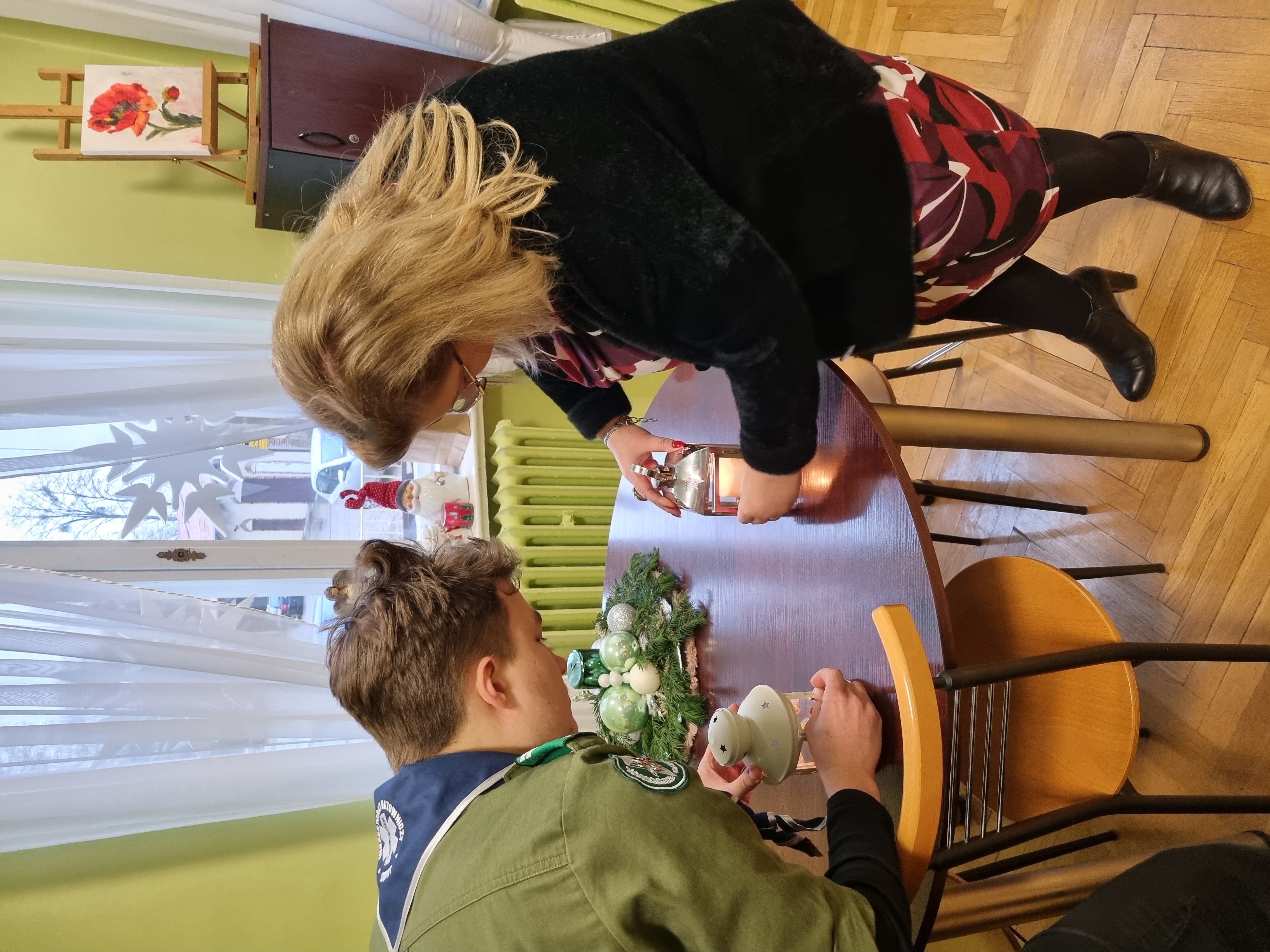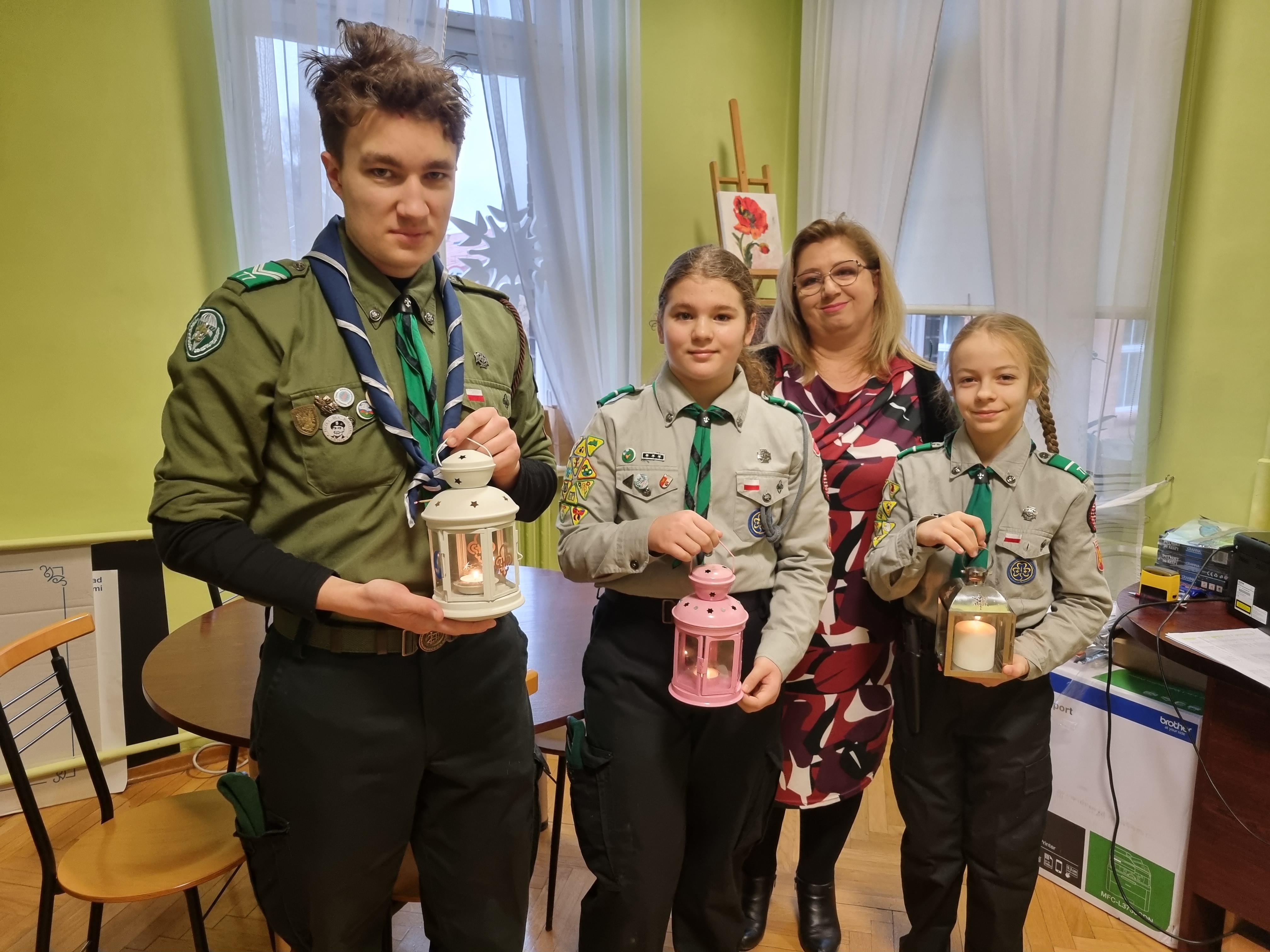 Dnia 21.12.2022 roku jedna z naszych uczennic Zosia Moś która prywatnie jest harcerką w 77 WDH im. "Harcerskiego Batalionu Szturmowego Zośka" wraz ze swoimi kolegami harcerką Emilią i harcerzem Józefem przynieśli do nas BETLEJEMSKIE ŚWIATŁO POKOJU.