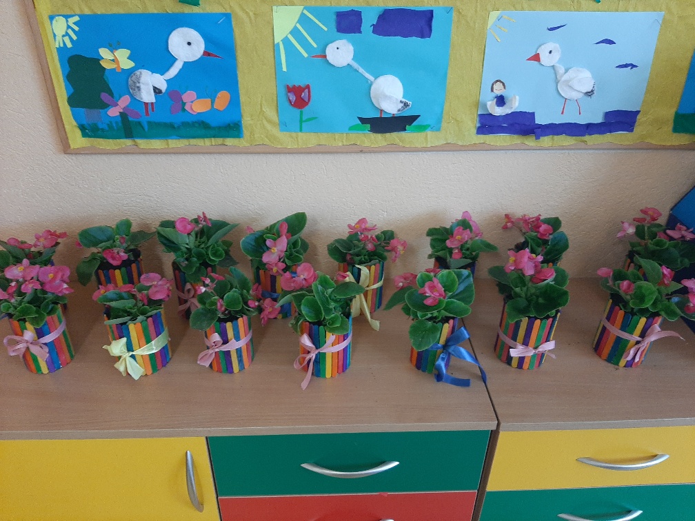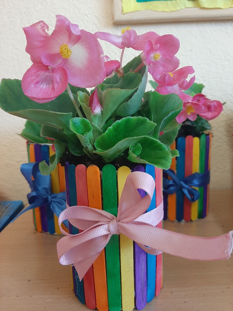 Z okazji Dnia Mamy uczniowie wykonali ekologiczne upominki z puszek po żywności oraz z kolorowych patyczków po lodach.