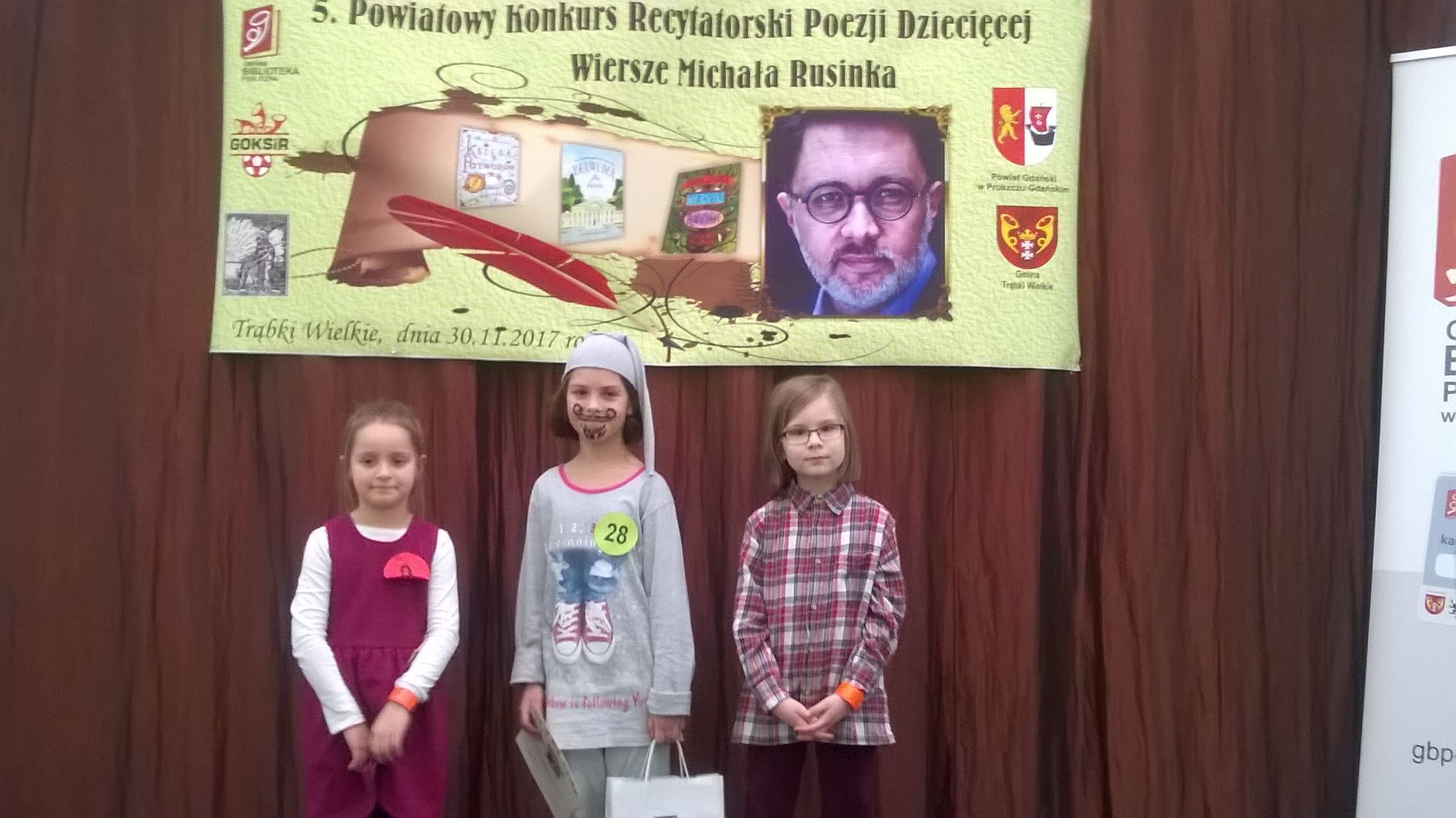 W finale V Powiatowego Konkursu Recytatorskiego odbywającego się w Trąbkach Wielkich naszą szkołę reprezentowały: Fatima Zielke - kl. I, Zoja Stacewicz z kl. II oraz Diana Błaszczuk z kl. III. W konkursie udział wzięło 42 uczestników, którzy przyjechali wraz ze swoimi opiekunami z 13 szkół powiatu gdańskiego. Dzieci recytowały wybrany przez siebie wiersz z repertuaru Michała Rusinka. Wspomagały się rekwizytami, stosowną mimiką, odpowiednią modulacją głosu, a czasami nawet uzasadnionym strojem. Poziom, jaki zaprezentowały dzieci był bardzo wysoki. Długi czas oczekiwania na werdykt komisji konkursowej uprzyjemnił dzieciom słodki poczęstunek oraz zabawy z klaunem Wojtkiem. Wszyscy uczestnicy otrzymali nagrody pocieszenia. Nasza uczennica Diana Błaszczuk na poziomie klas III zajęła I miejsce. Diana otrzymała dyplom oraz książkę z dedykacją poety Michała Rusinka oraz udzieliła wywiadu redaktorowi gazety ,,Wieści Pruszcza''. Wszystkim uczestnikom gratulujemy i życzymy dalszych sukcesów.