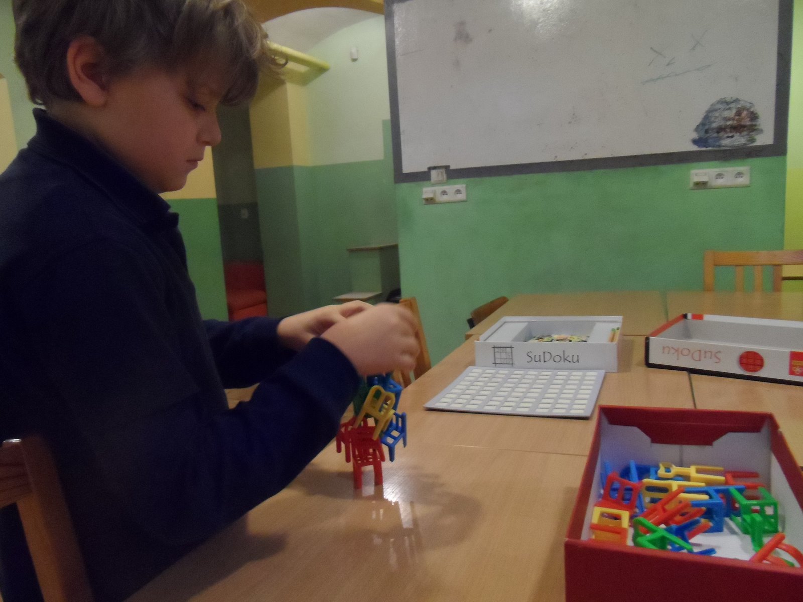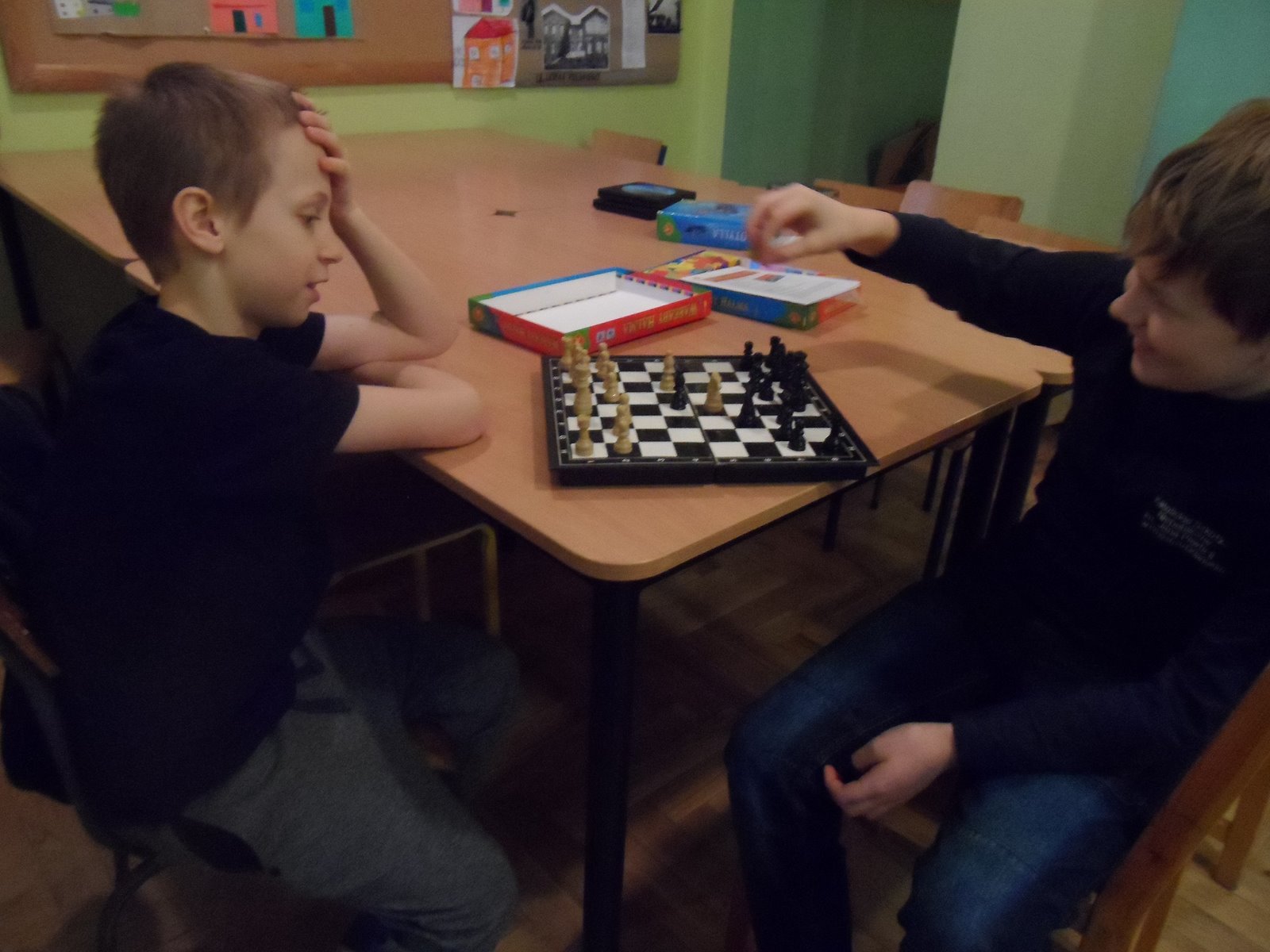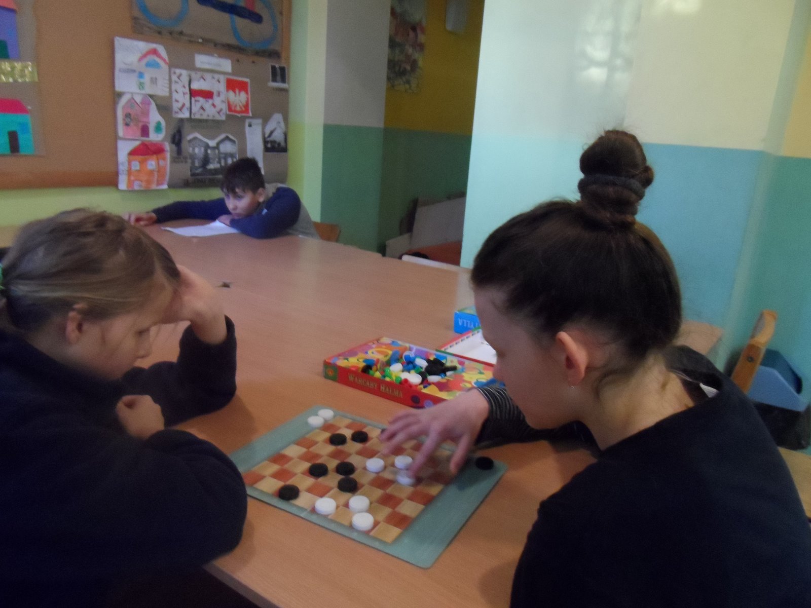 O zaletach gier planszowych nie trzeba nikogo przekonywać. Gry pomagają w przyswajaniu reguł, także w życiu codziennym, uczą współpracy, komunikowania się, uwalniają od stresu itp. Uczniowie najchętniej grają w warcaby i statki. TANGRAM ćwiczy koncentrację, pomysłowość, pamięć spostrzeżeniowo-wzrokową. Na świetlicy dostepne są dwie nowe gry MISTAKOS i HALMA. MISTAKOS - to ustawianie konstrukcji z krzesełek. Janek z klasy VI wykonał konstrukcję ze wszystkich elementów. Gra w szachy - Janek z klasy IV może pochwalić się znajomością tej gry.