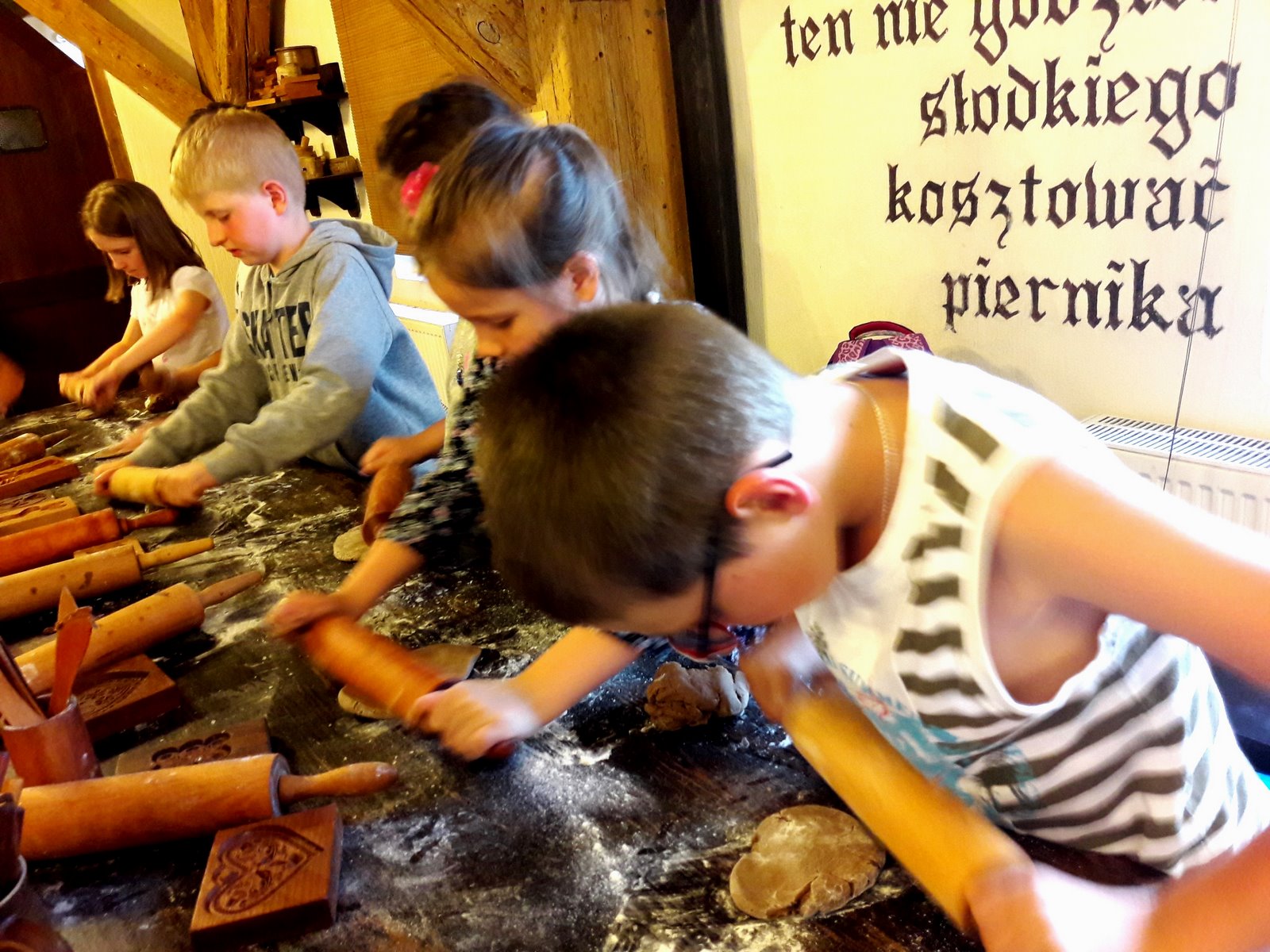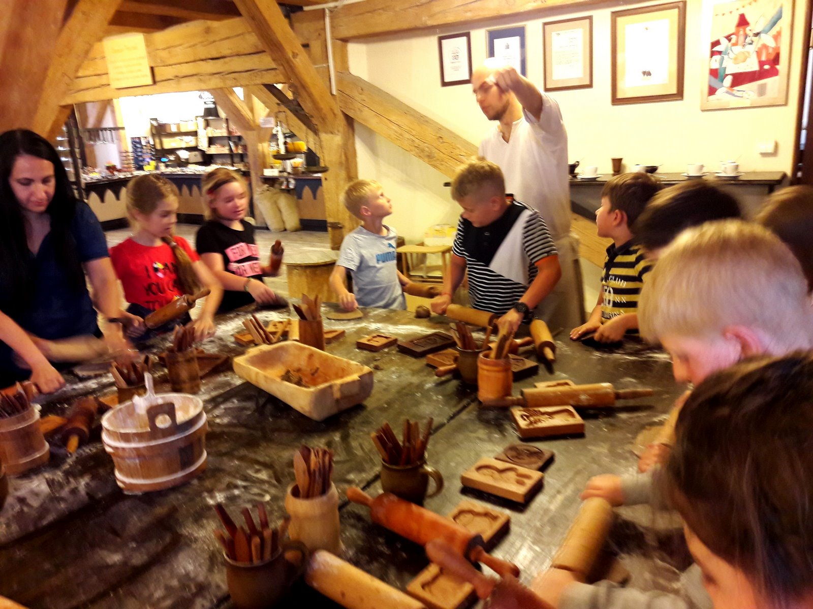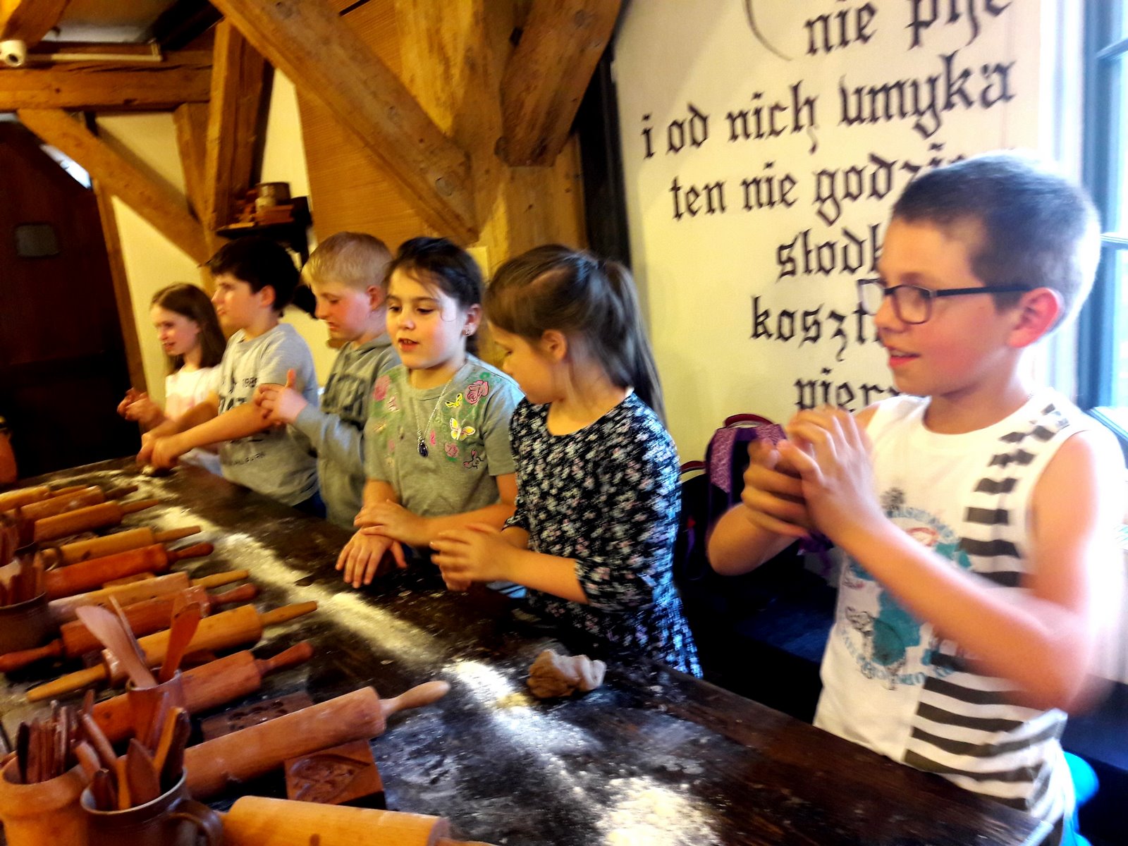 W pierwszym dniu udaliśmy się do Planetarium na seans pt. „Cudowna podróż” oraz do Teatru Baj na spektakl musicalowy „Jaś i Małgosia”, gdzie spotkaliśmy najsłynniejsze postacie baśni Braci Grimm. Zwiedziliśmy ruiny zamku krzyżackiego, a na zakończenie dnia udaliśmy się do Żywego Muzeum Piernika, gdzie poznaliśmy historię toruńskiego piernikarstwa oraz wypiekliśmy własny piernik dekoracyjny. Dla niektórych własny piernik stał się najpiękniejszą pamiątką, a dla niektórych najsmaczniejsząJ. Po trudach dnia, uczniowie znaleźli czas na integrację klasową urządzając w jednym z pokoi spotkanie koszyczkowe. Było dużo smakołyków i zabawy. Z radością oczekiwaliśmy na następny dzień.