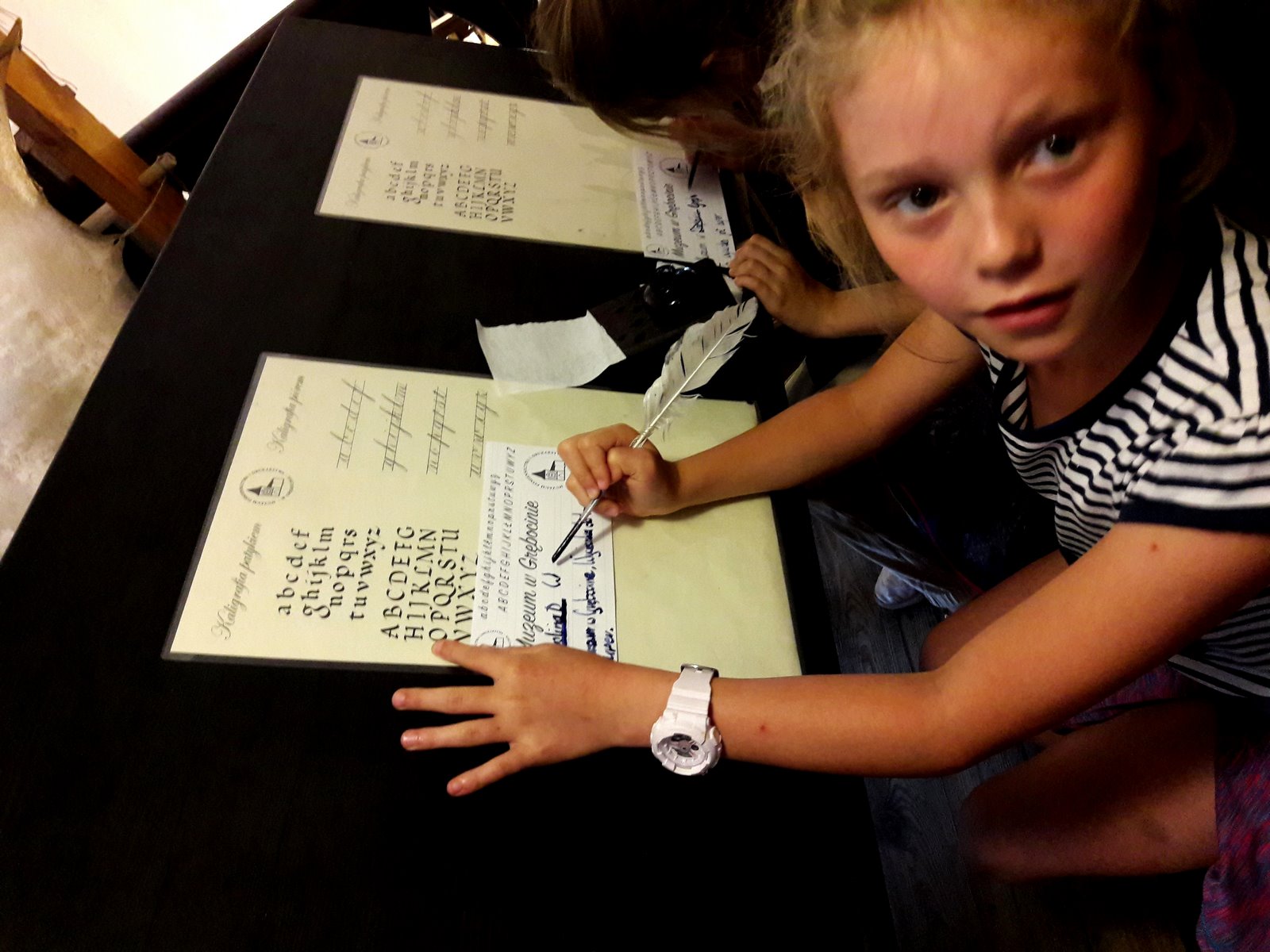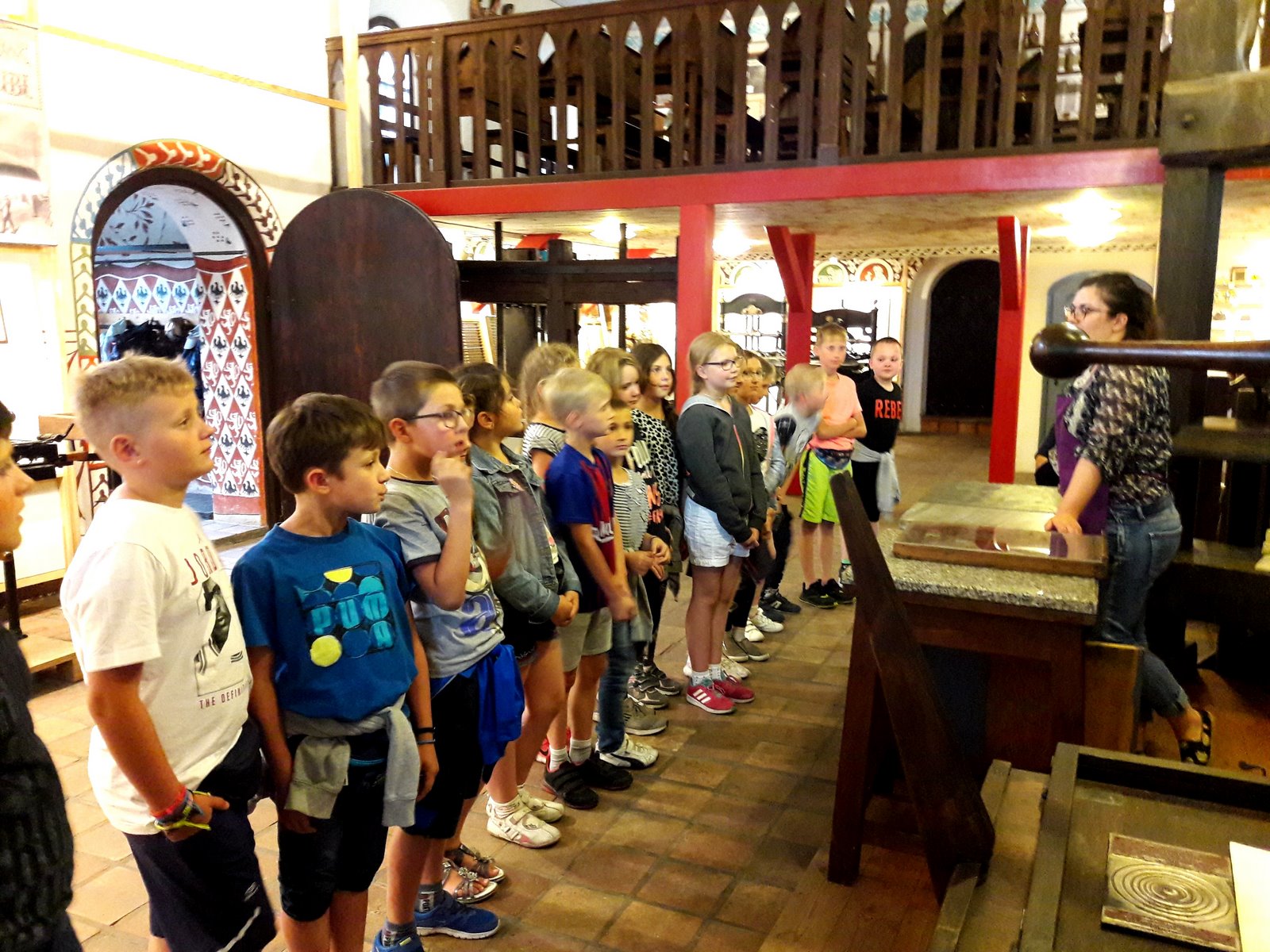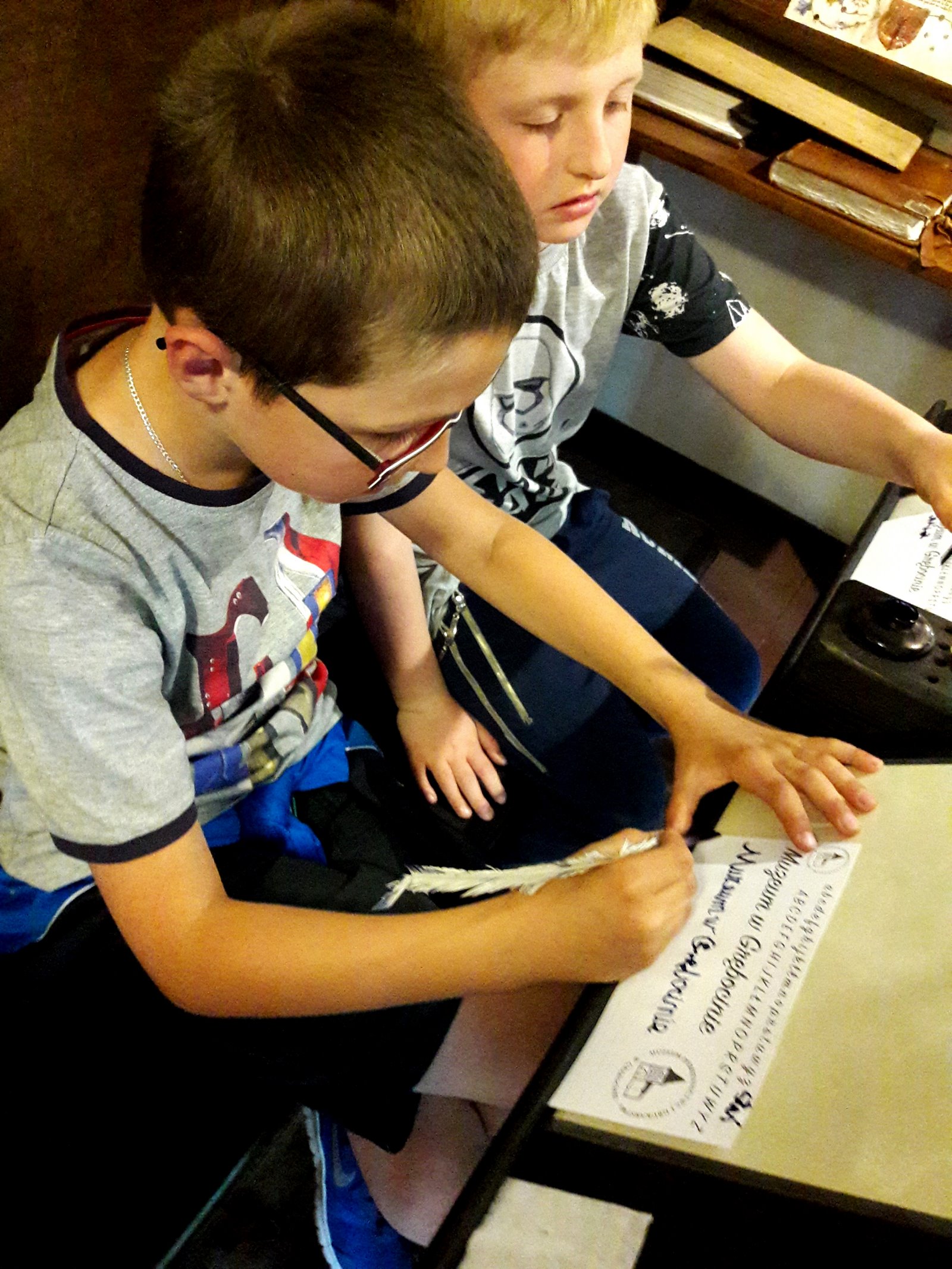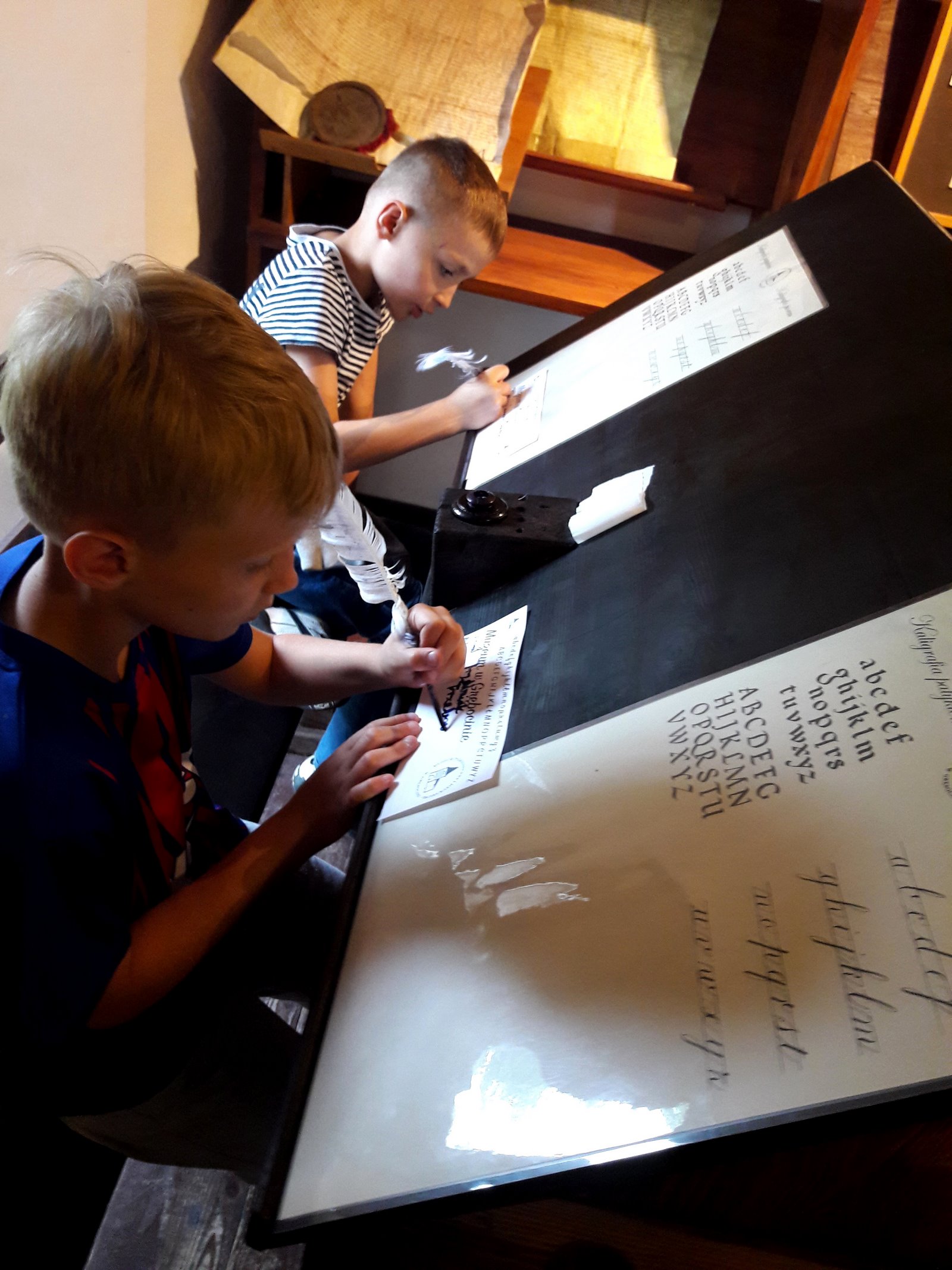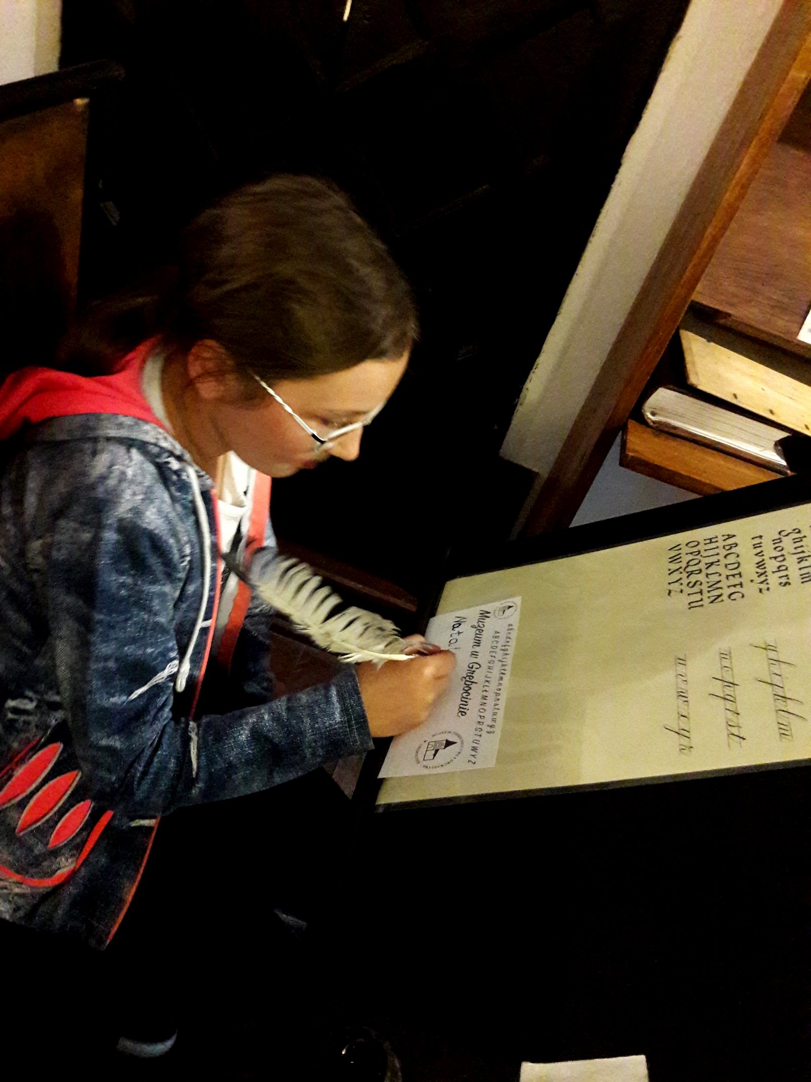 Po obiedzie udaliśmy się do Muzeum Piśmiennictwa i Drukarstwa w Grębocinie na interaktywne warsztaty, gdzie zapoznaliśmy się z historią materiałów piśmienniczych: papieru i pergaminu. Samodzielnie próbowaliśmy kaligrafii gęsim piórem oraz ręcznie czerpaliśmy kartkę papieru. Każdy uczestnik otrzymał certyfikat uczestnictwa na wydrukowanej XIX - wiecznej prasie drukarskiej.