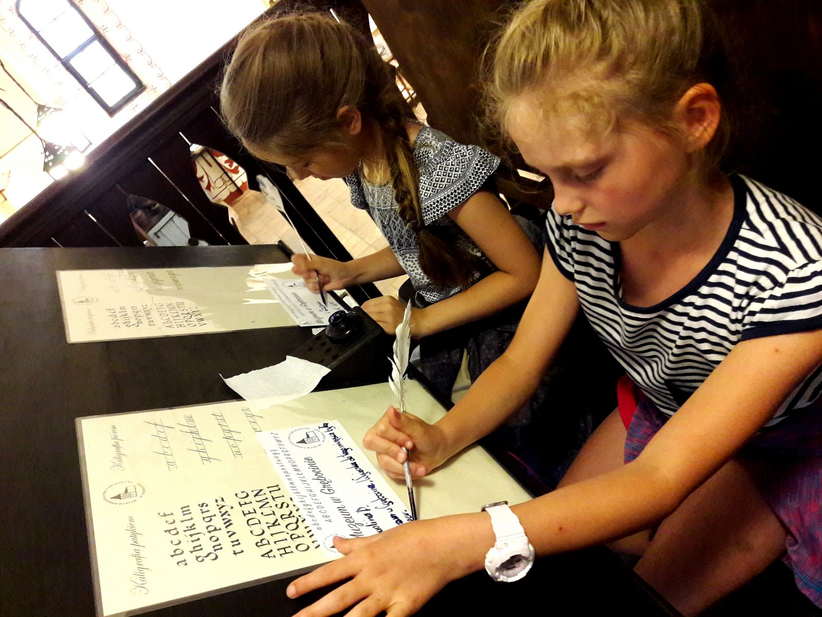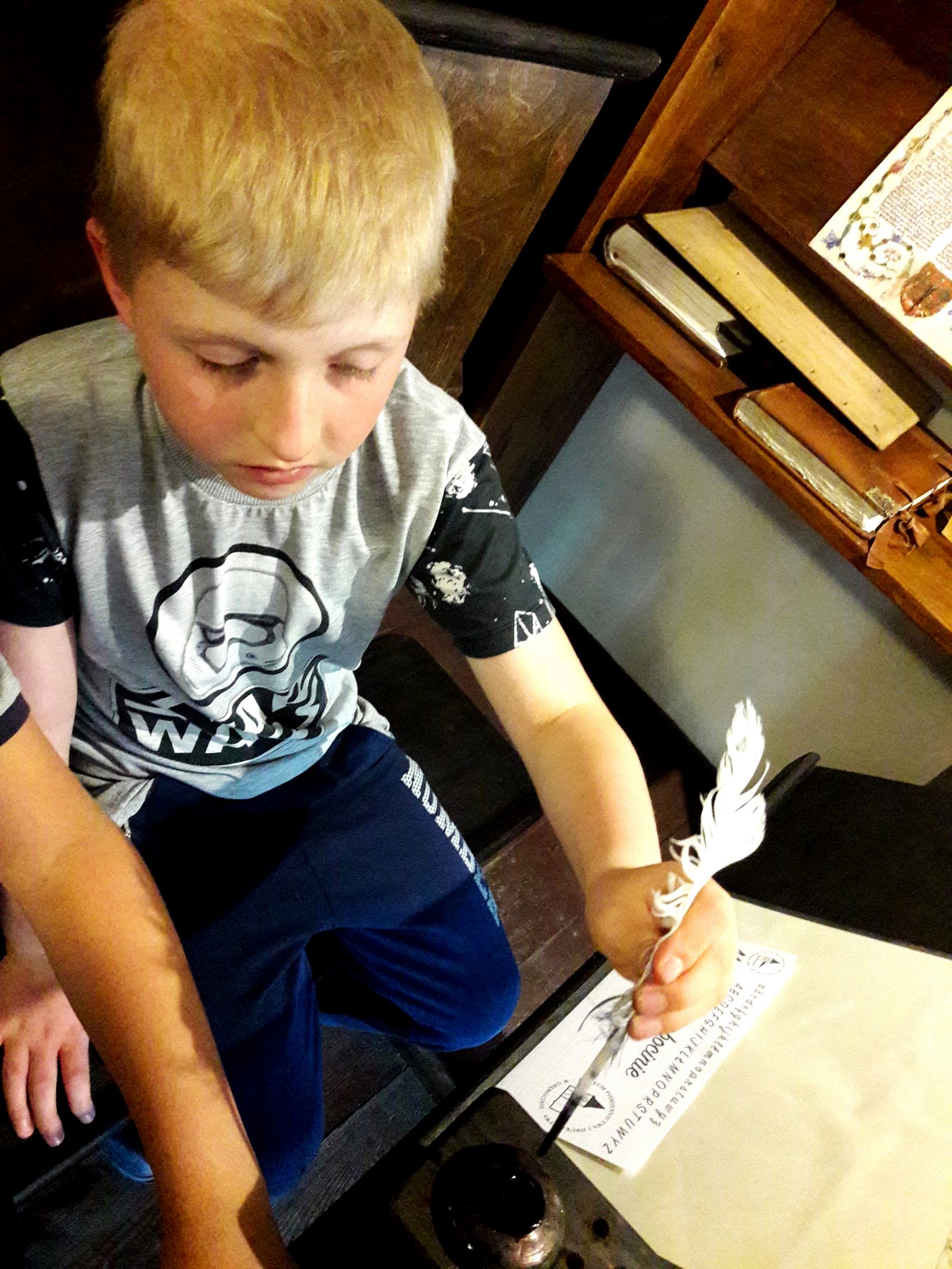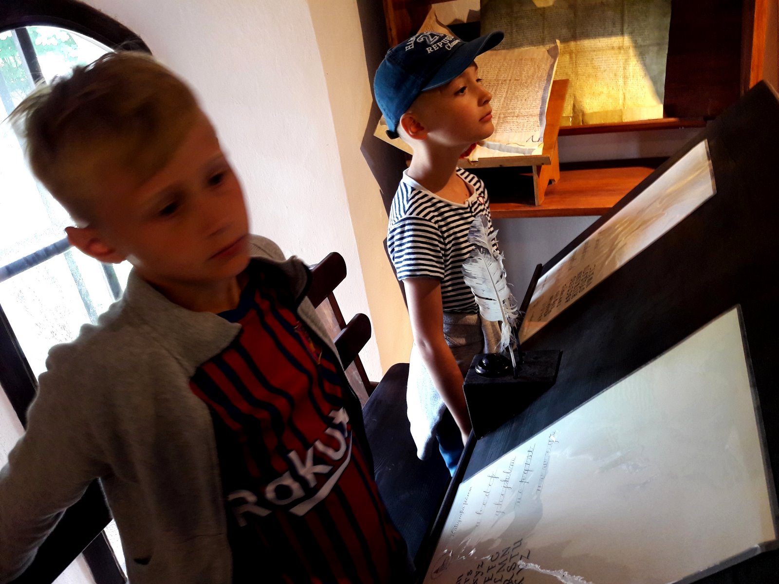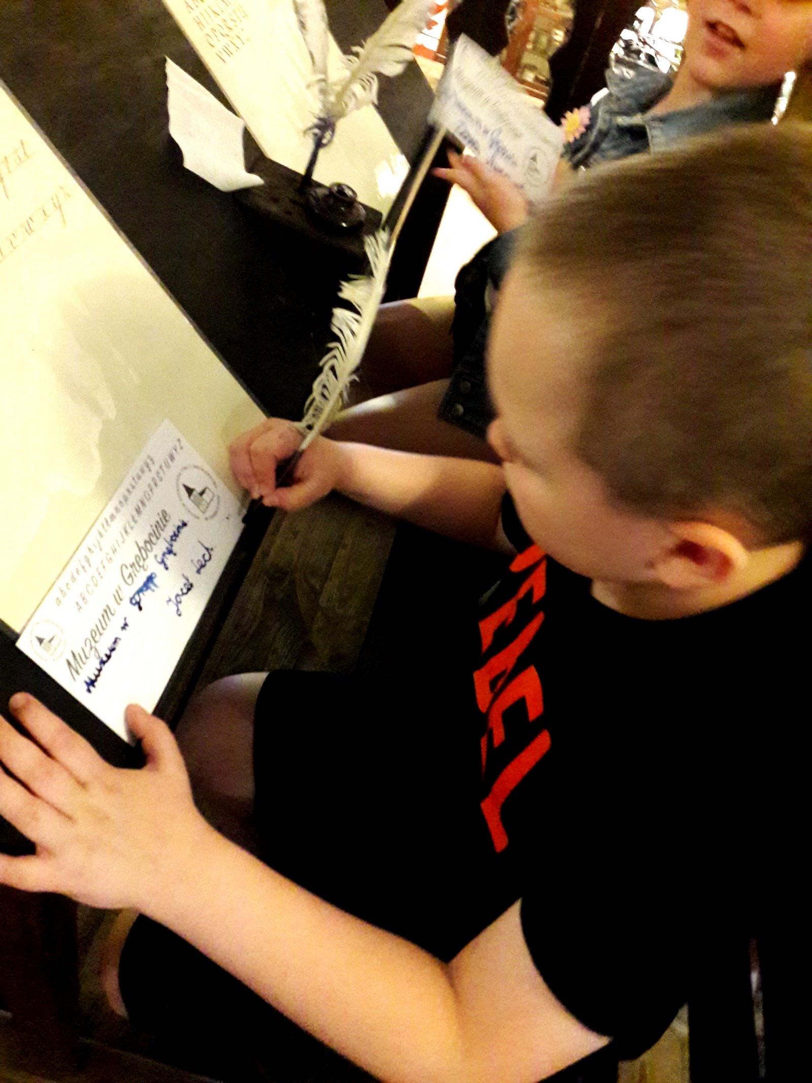Po obiedzie udaliśmy się do Muzeum Piśmiennictwa i Drukarstwa w Grębocinie na interaktywne warsztaty, gdzie zapoznaliśmy się z historią materiałów piśmienniczych: papieru i pergaminu. Samodzielnie próbowaliśmy kaligrafii gęsim piórem oraz ręcznie czerpaliśmy kartkę papieru. Każdy uczestnik otrzymał certyfikat uczestnictwa na wydrukowanej XIX - wiecznej prasie drukarskiej.