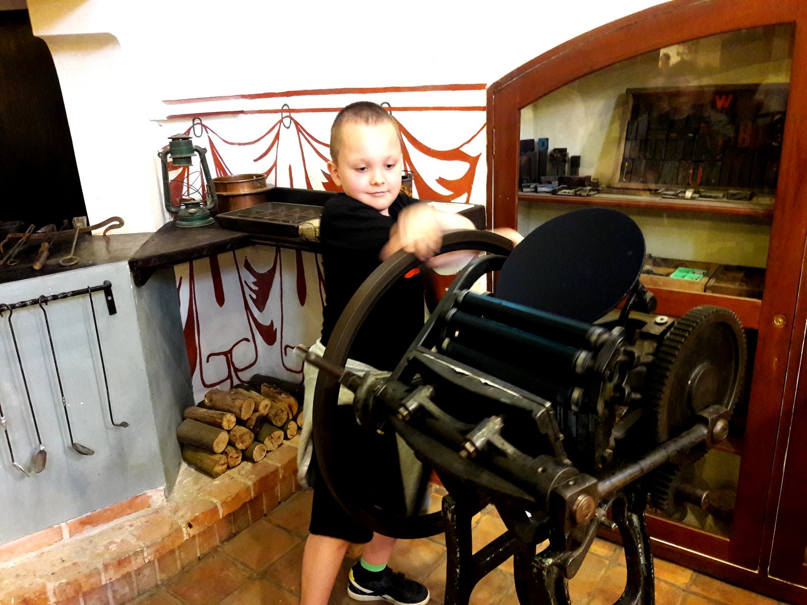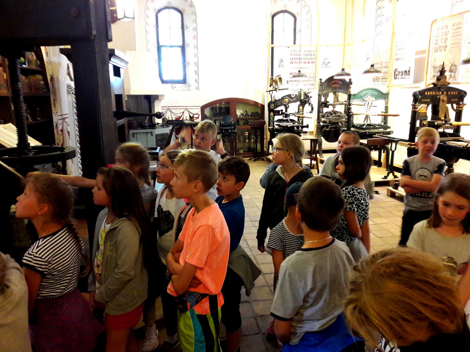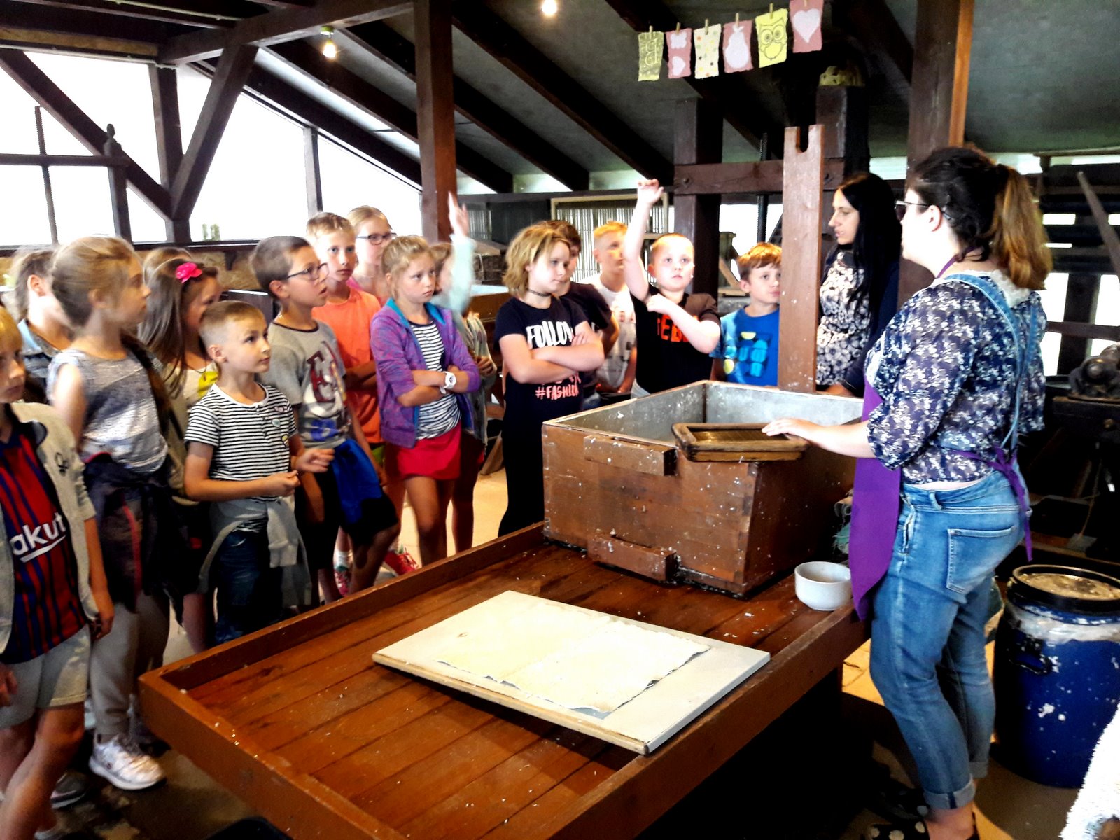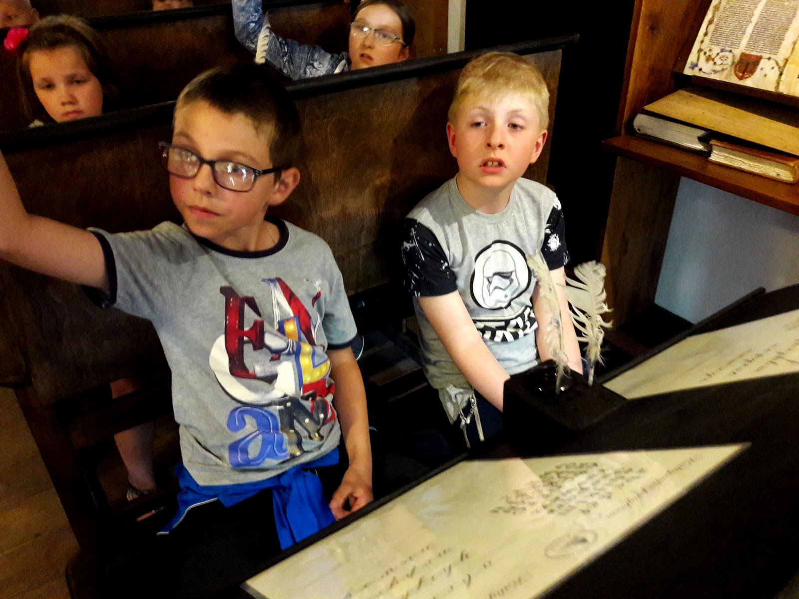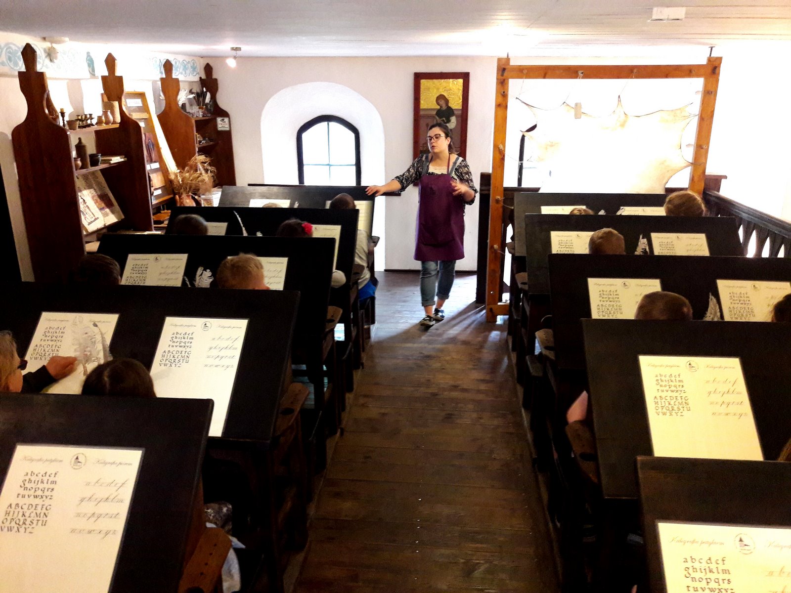 Po obiedzie udaliśmy się do Muzeum Piśmiennictwa i Drukarstwa w Grębocinie na interaktywne warsztaty, gdzie zapoznaliśmy się z historią materiałów piśmienniczych: papieru i pergaminu. Samodzielnie próbowaliśmy kaligrafii gęsim piórem oraz ręcznie czerpaliśmy kartkę papieru. Każdy uczestnik otrzymał certyfikat uczestnictwa na wydrukowanej XIX - wiecznej prasie drukarskiej.