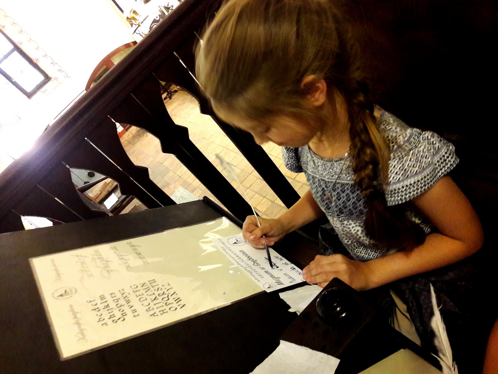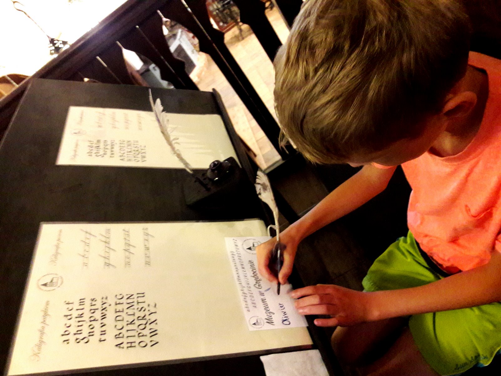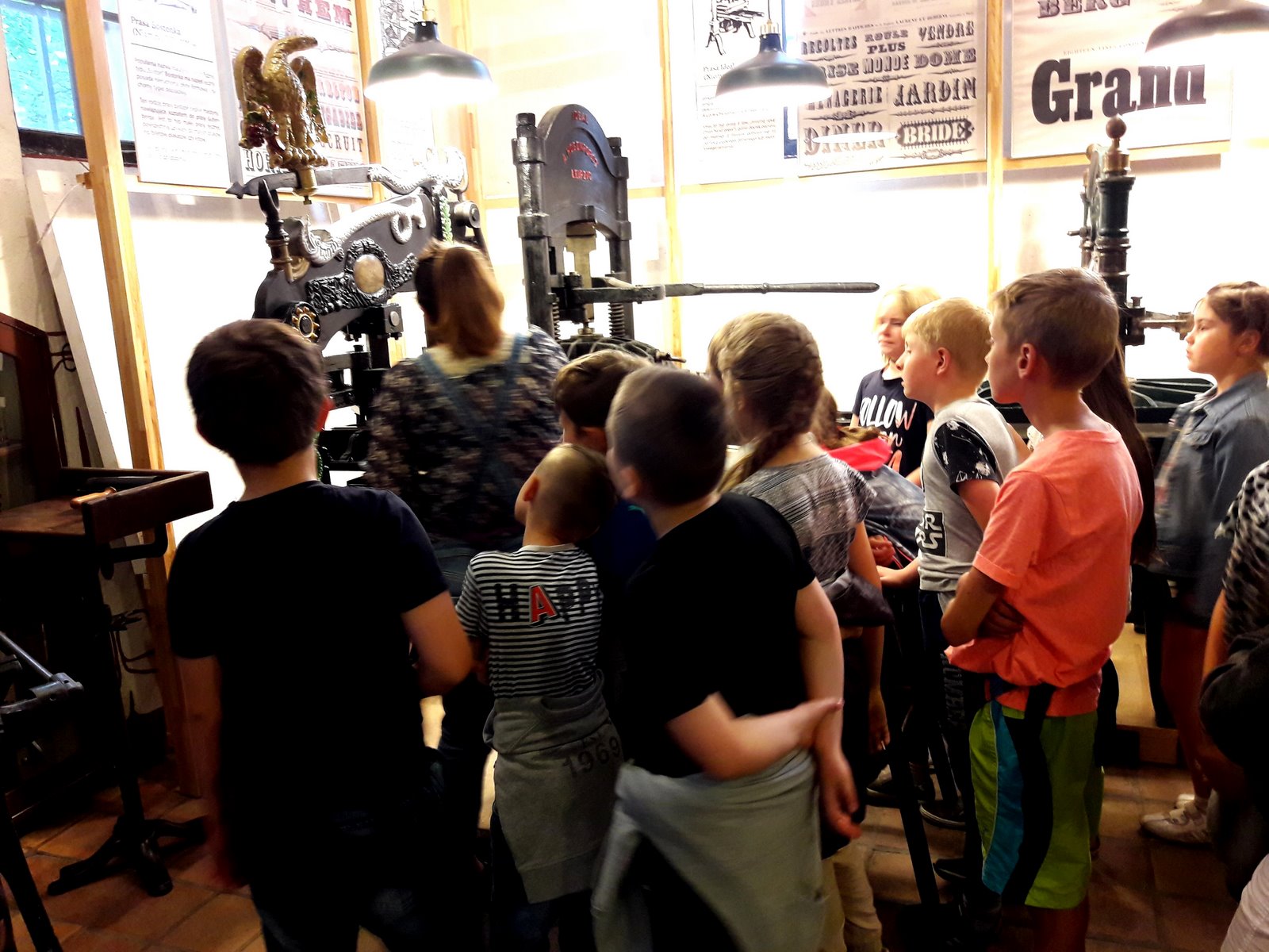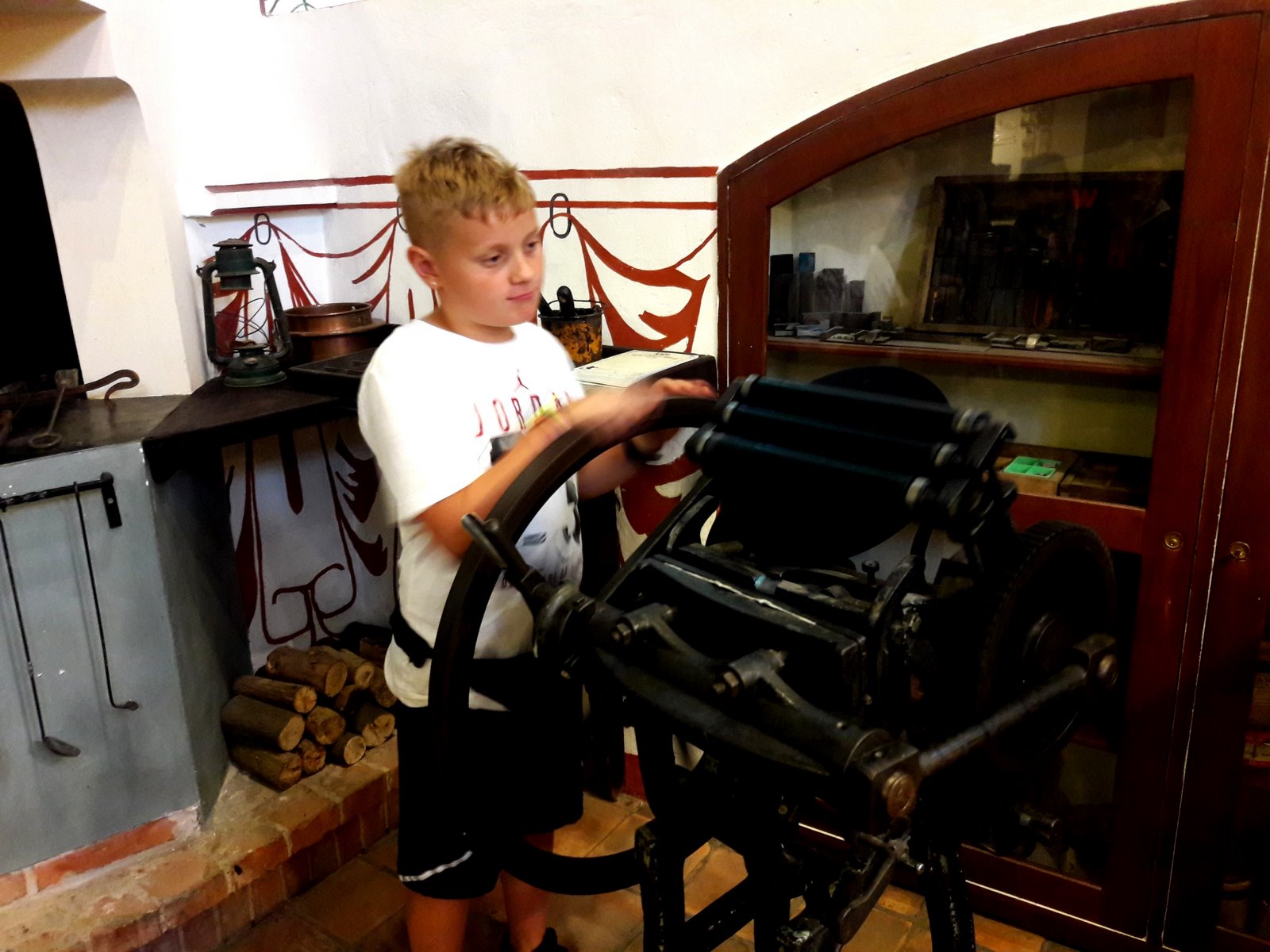 Po obiedzie udaliśmy się do Muzeum Piśmiennictwa i Drukarstwa w Grębocinie na interaktywne warsztaty, gdzie zapoznaliśmy się z historią materiałów piśmienniczych: papieru i pergaminu. Samodzielnie próbowaliśmy kaligrafii gęsim piórem oraz ręcznie czerpaliśmy kartkę papieru. Każdy uczestnik otrzymał certyfikat uczestnictwa na wydrukowanej XIX - wiecznej prasie drukarskiej.