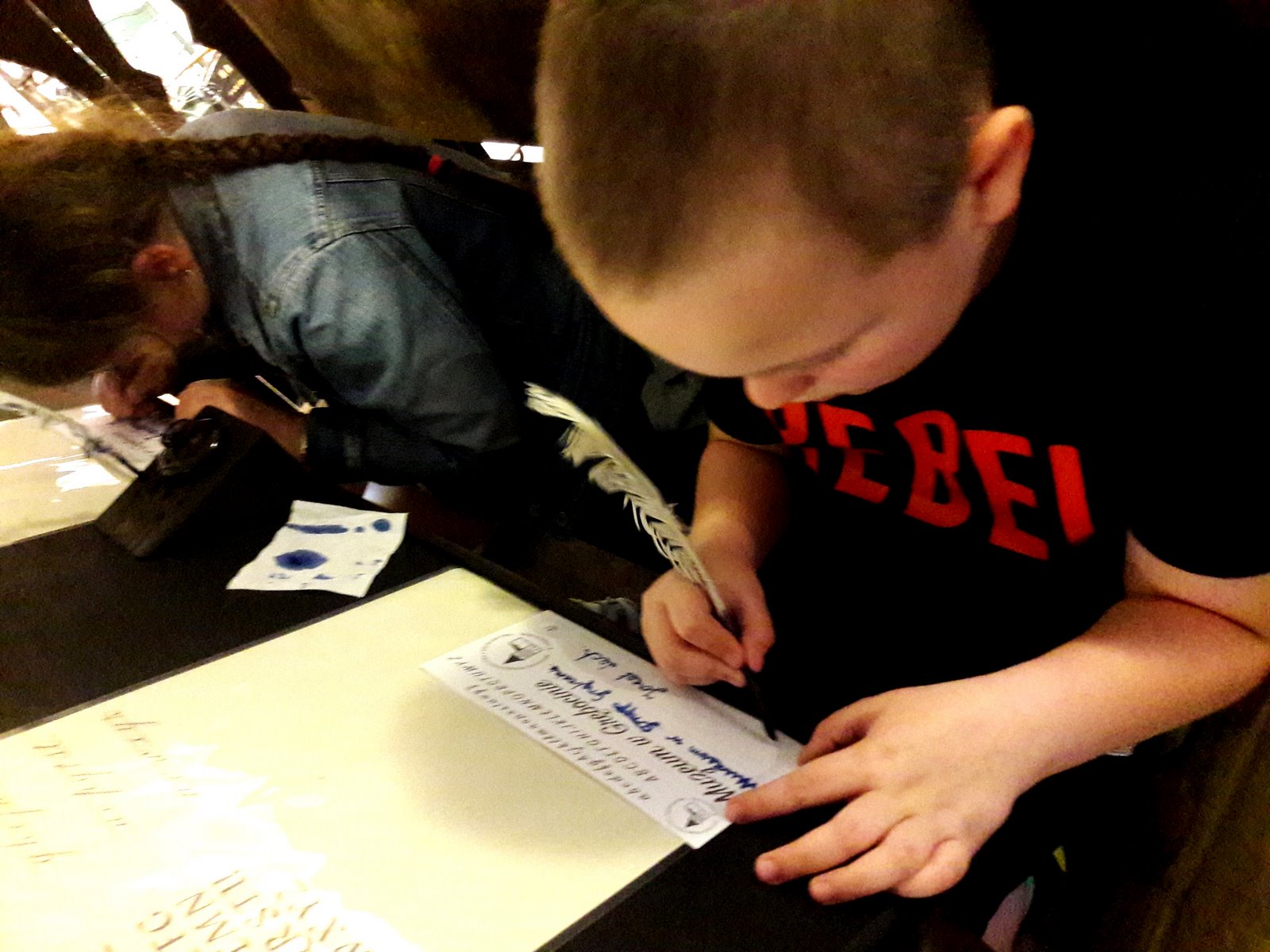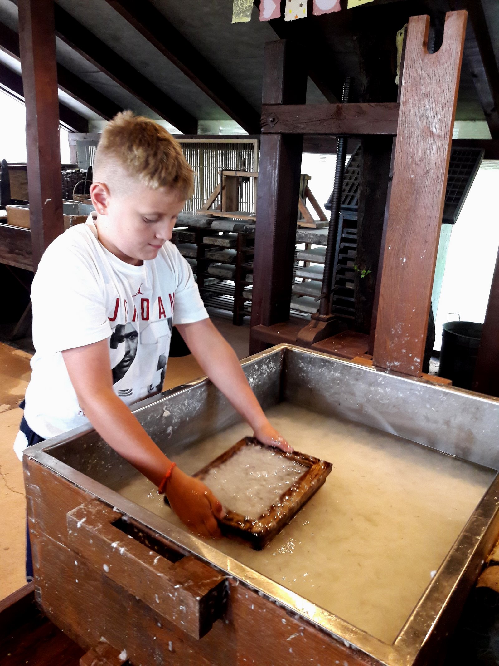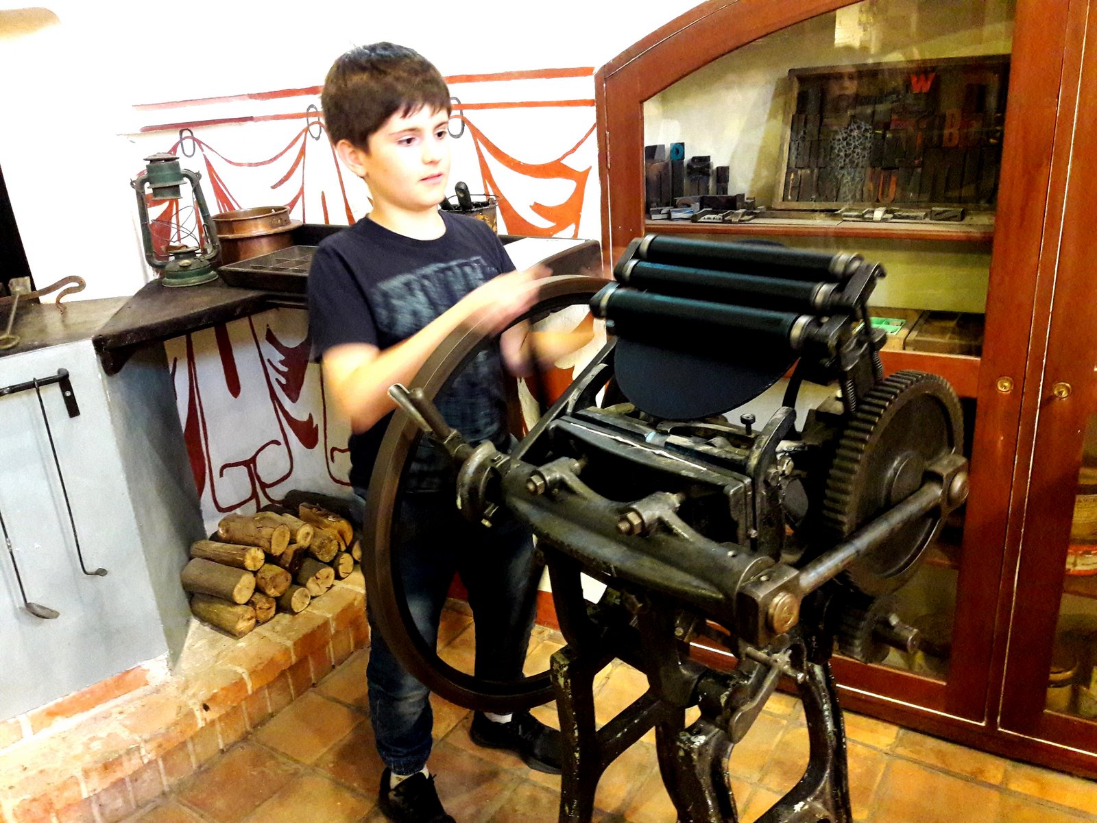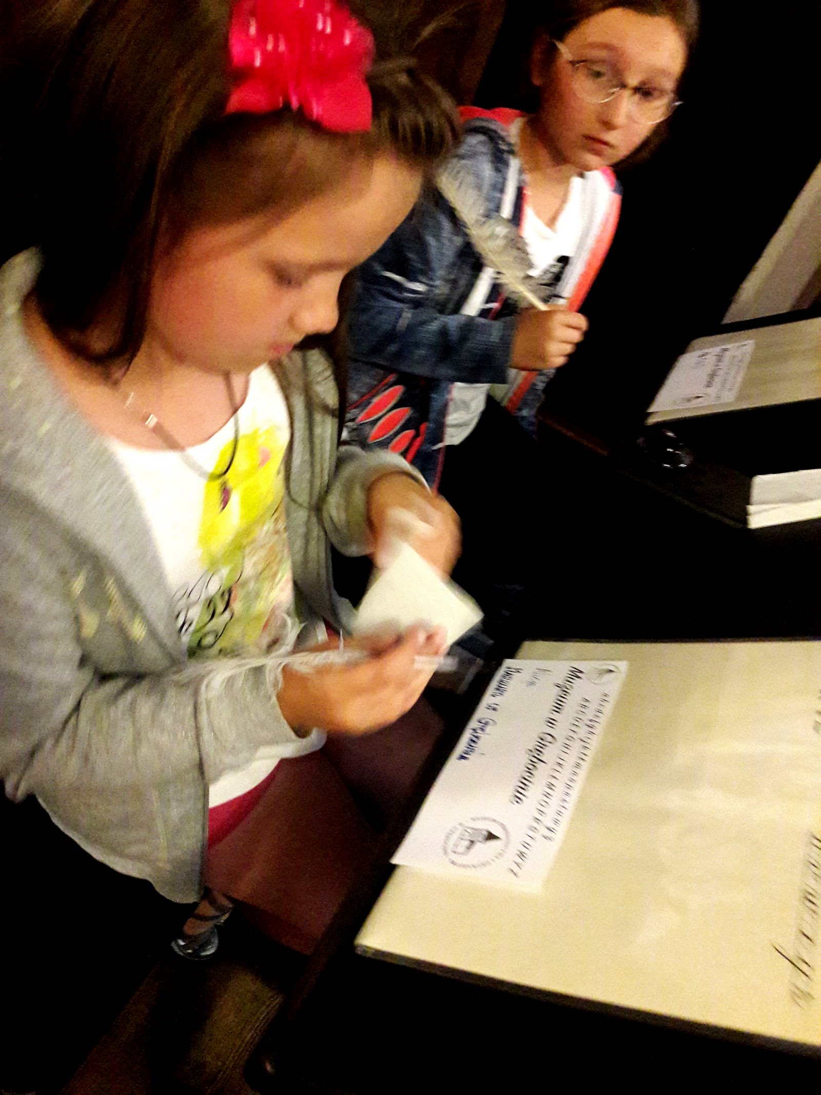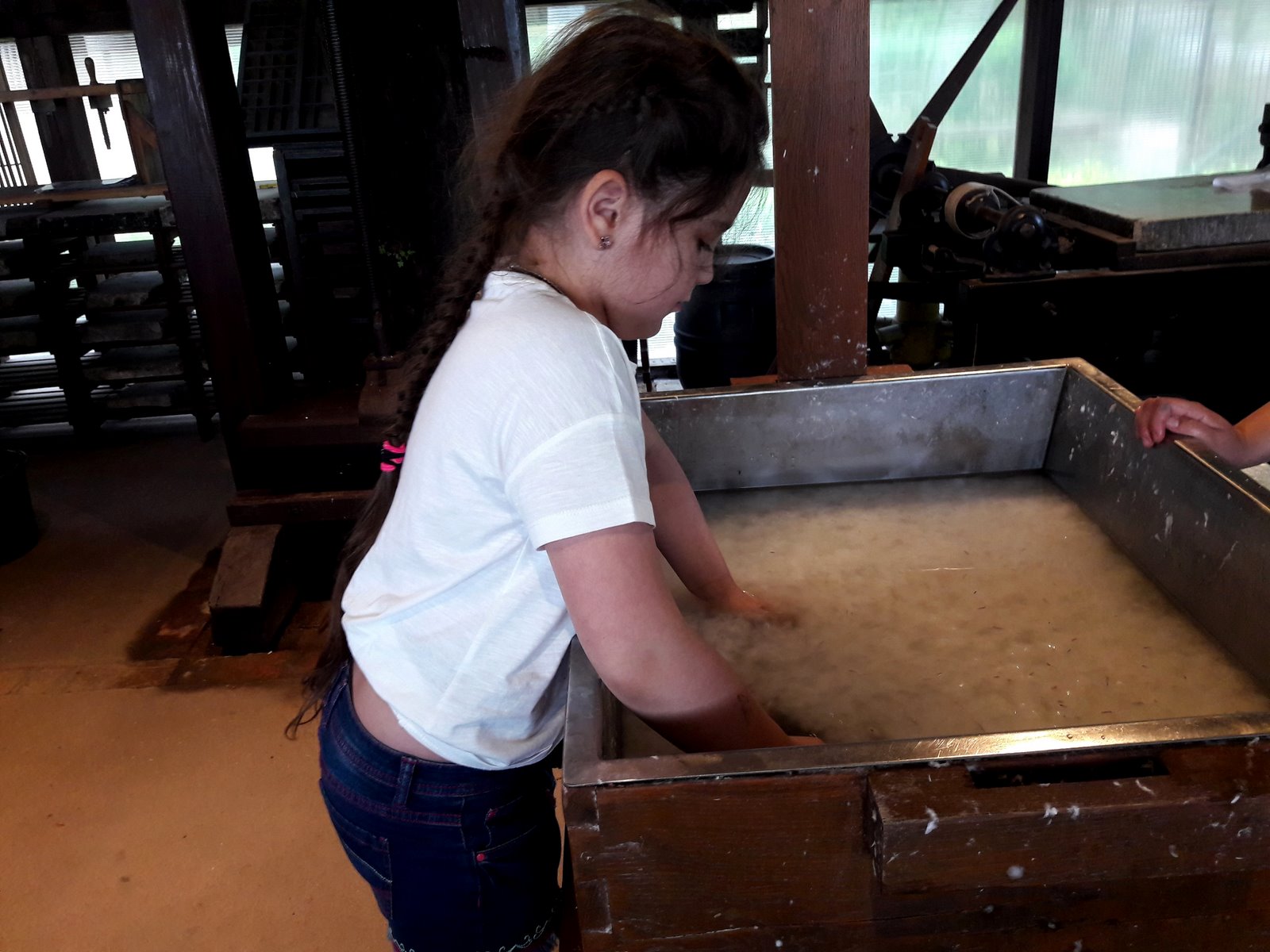 Po obiedzie udaliśmy się do Muzeum Piśmiennictwa i Drukarstwa w Grębocinie na interaktywne warsztaty, gdzie zapoznaliśmy się z historią materiałów piśmienniczych: papieru i pergaminu. Samodzielnie próbowaliśmy kaligrafii gęsim piórem oraz ręcznie czerpaliśmy kartkę papieru. Każdy uczestnik otrzymał certyfikat uczestnictwa na wydrukowanej XIX - wiecznej prasie drukarskiej.