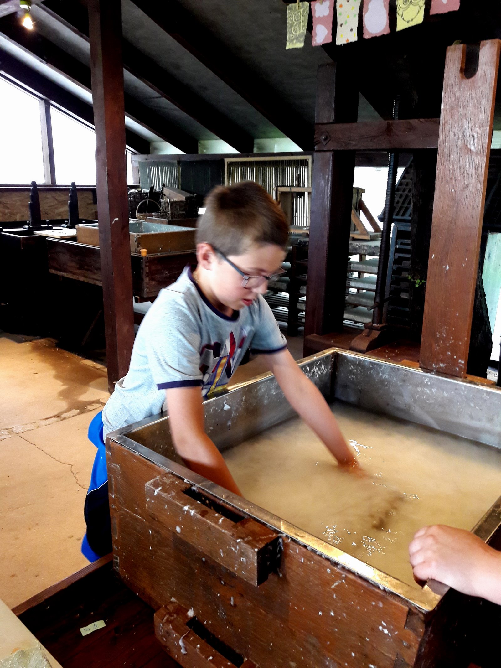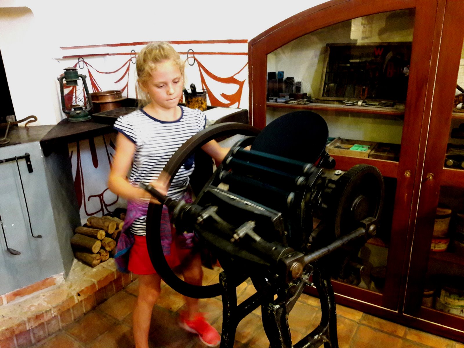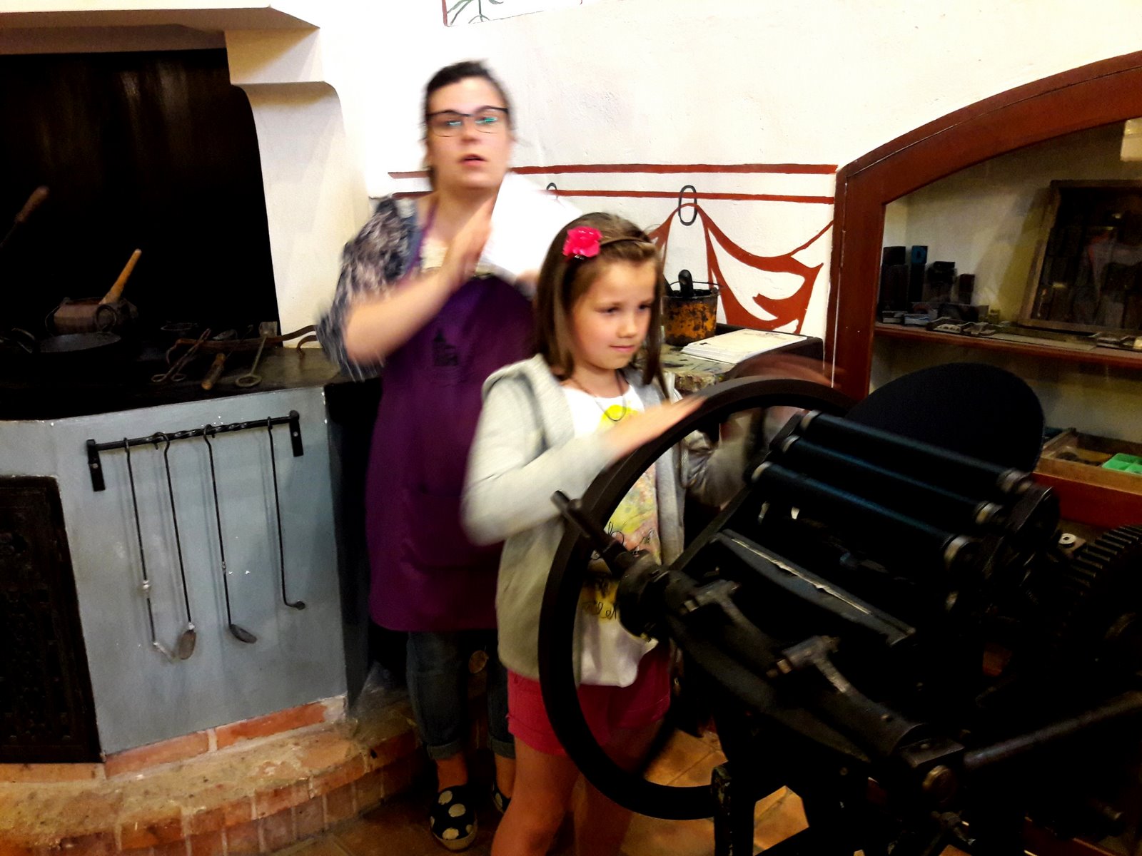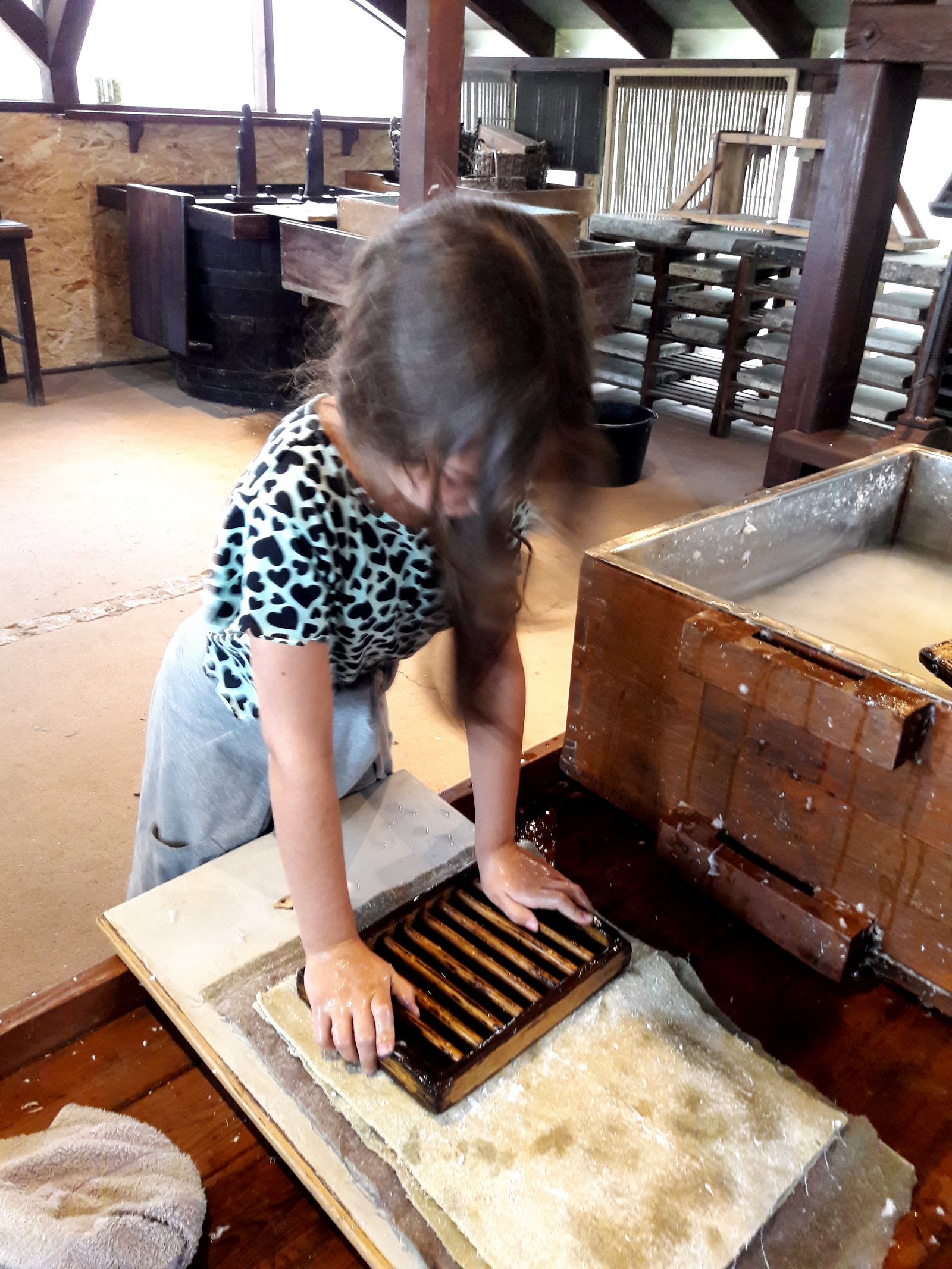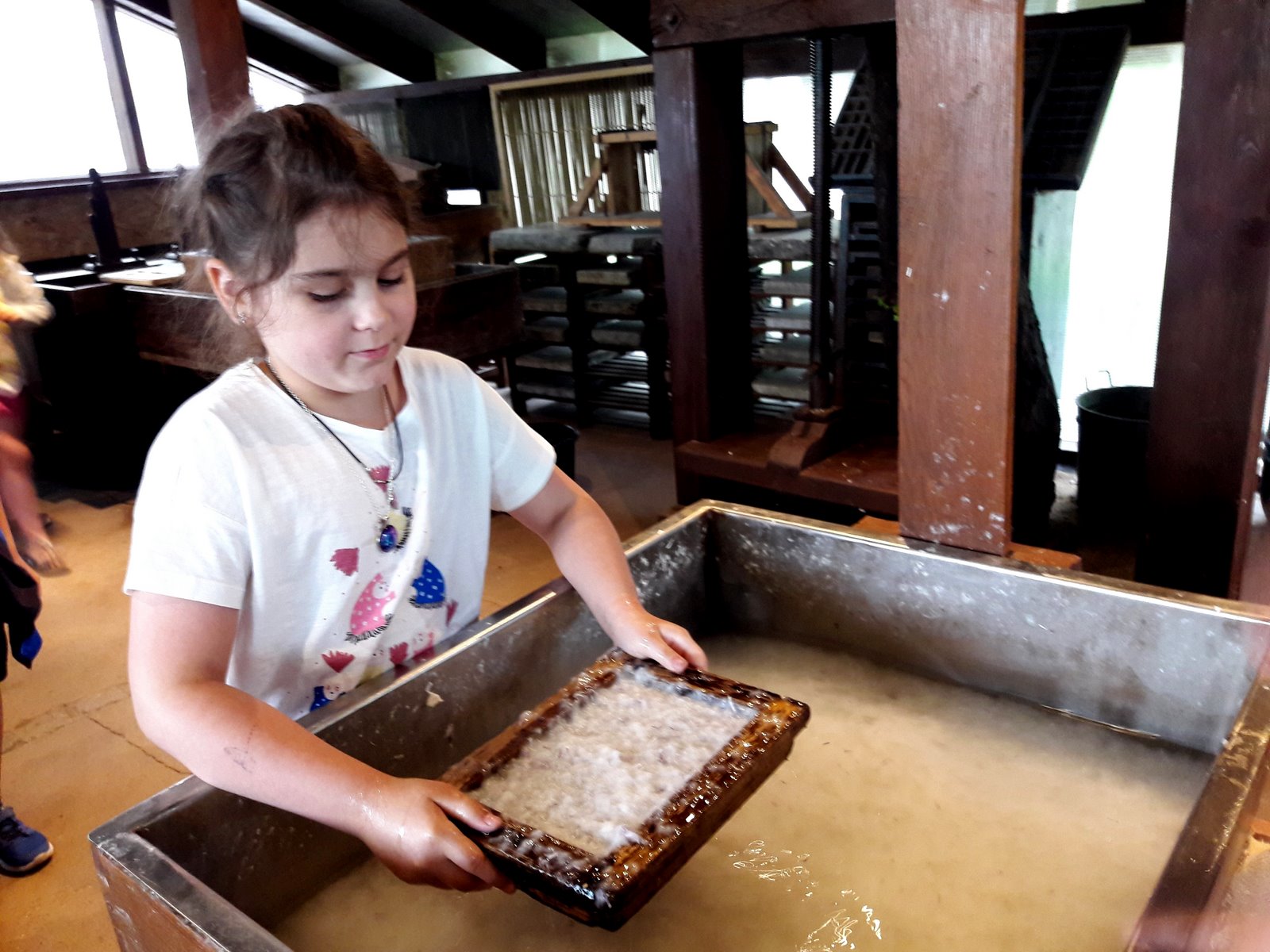 Po obiedzie udaliśmy się do Muzeum Piśmiennictwa i Drukarstwa w Grębocinie na interaktywne warsztaty, gdzie zapoznaliśmy się z historią materiałów piśmienniczych: papieru i pergaminu. Samodzielnie próbowaliśmy kaligrafii gęsim piórem oraz ręcznie czerpaliśmy kartkę papieru. Każdy uczestnik otrzymał certyfikat uczestnictwa na wydrukowanej XIX - wiecznej prasie drukarskiej.