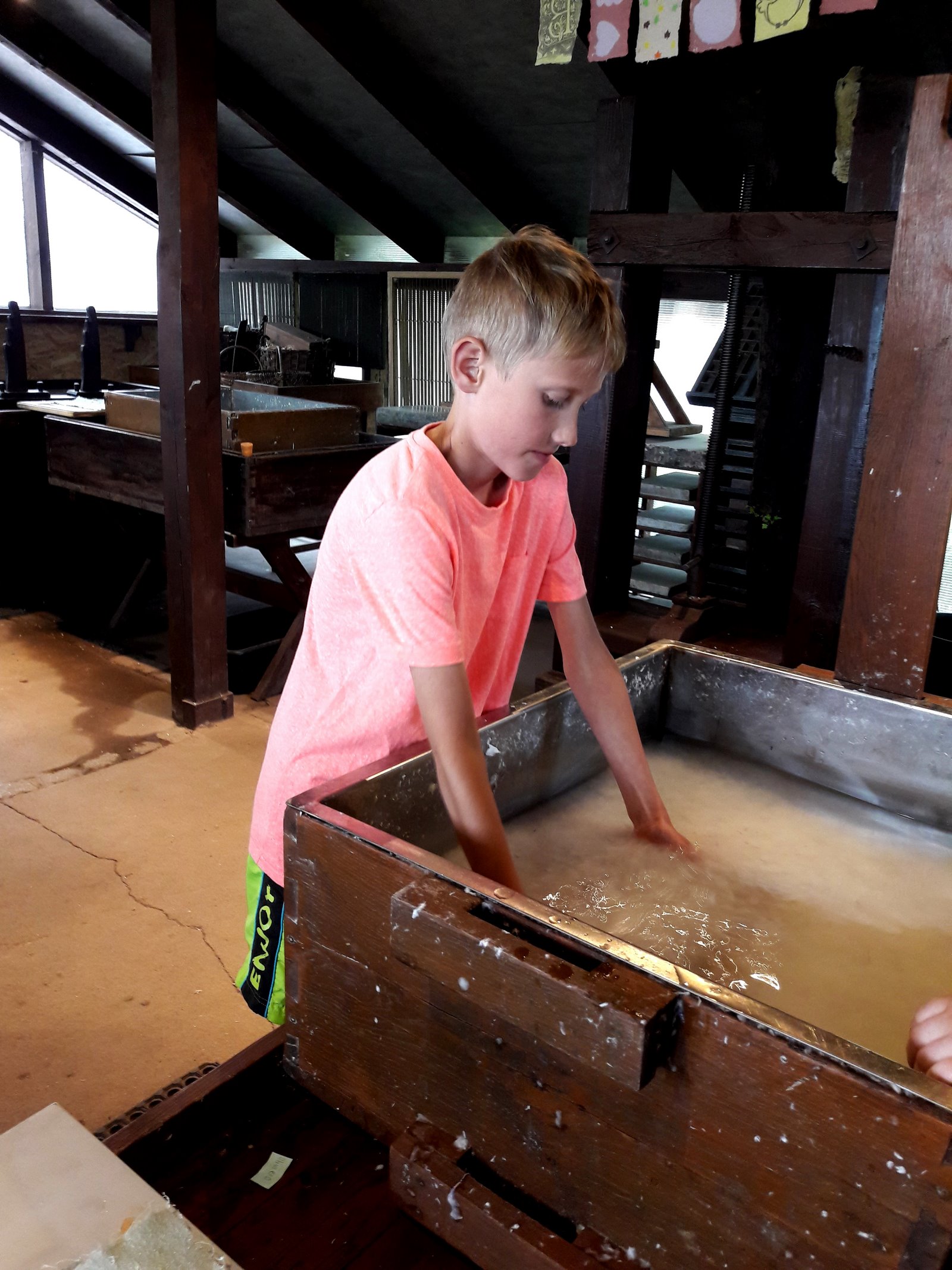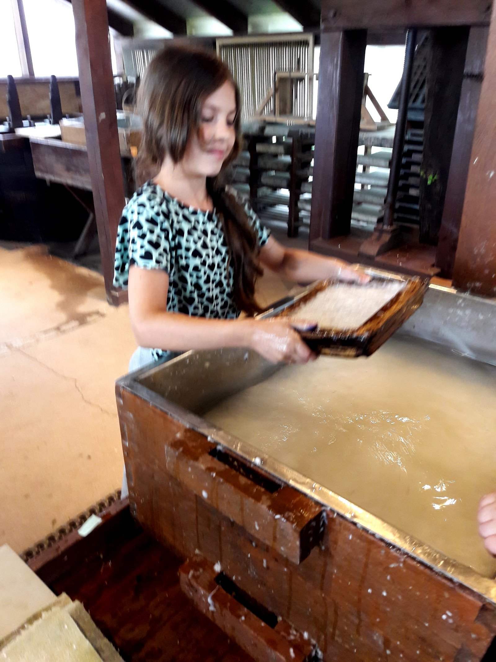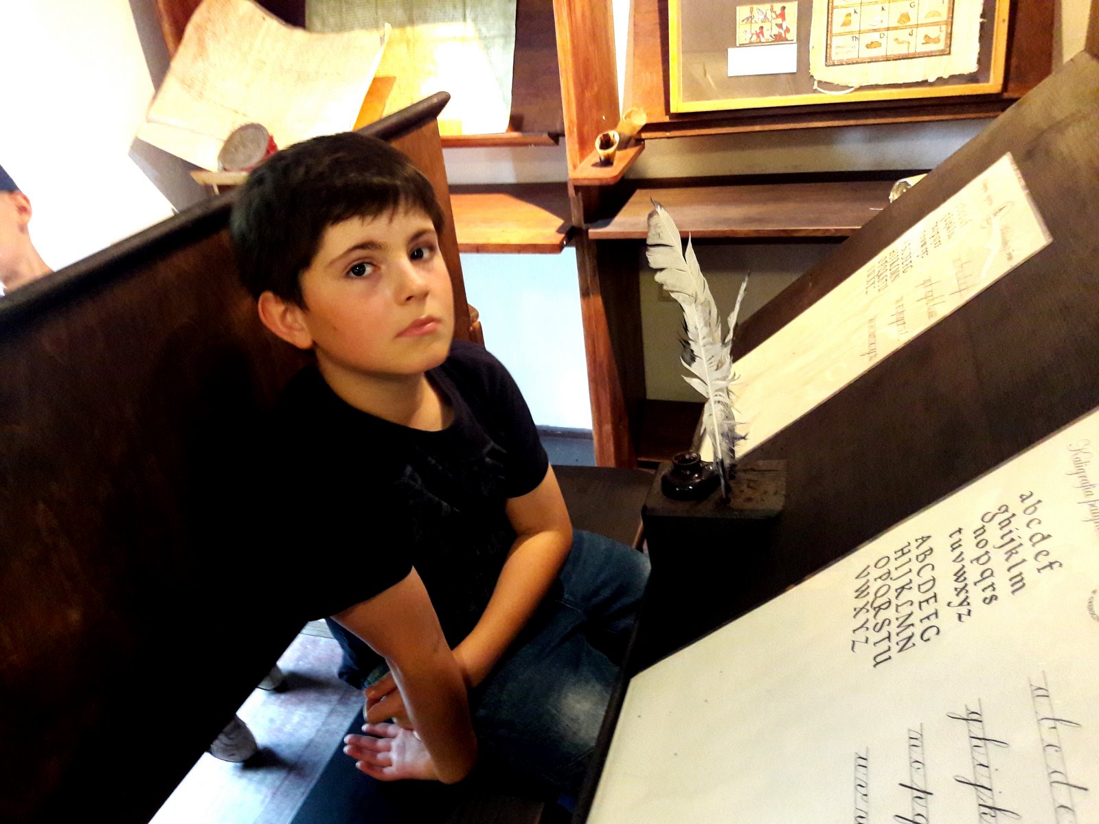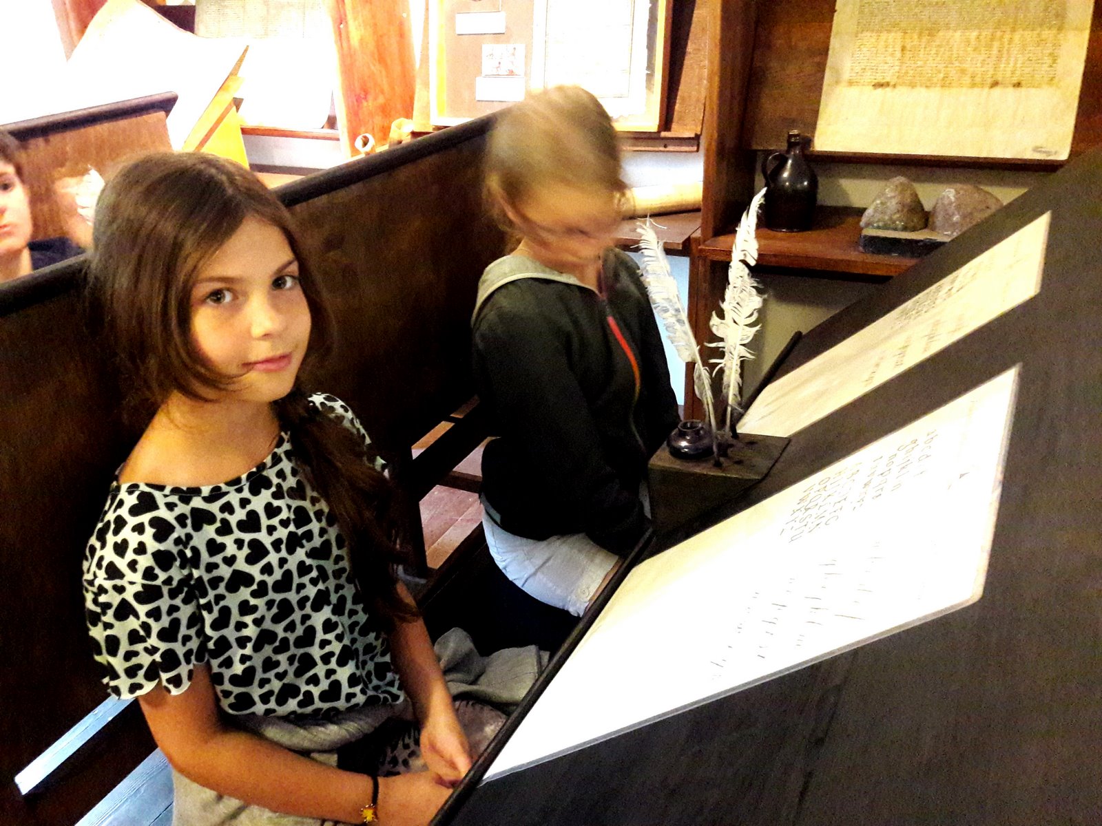 Po obiedzie udaliśmy się do Muzeum Piśmiennictwa i Drukarstwa w Grębocinie na interaktywne warsztaty, gdzie zapoznaliśmy się z historią materiałów piśmienniczych: papieru i pergaminu. Samodzielnie próbowaliśmy kaligrafii gęsim piórem oraz ręcznie czerpaliśmy kartkę papieru. Każdy uczestnik otrzymał certyfikat uczestnictwa na wydrukowanej XIX - wiecznej prasie drukarskiej.