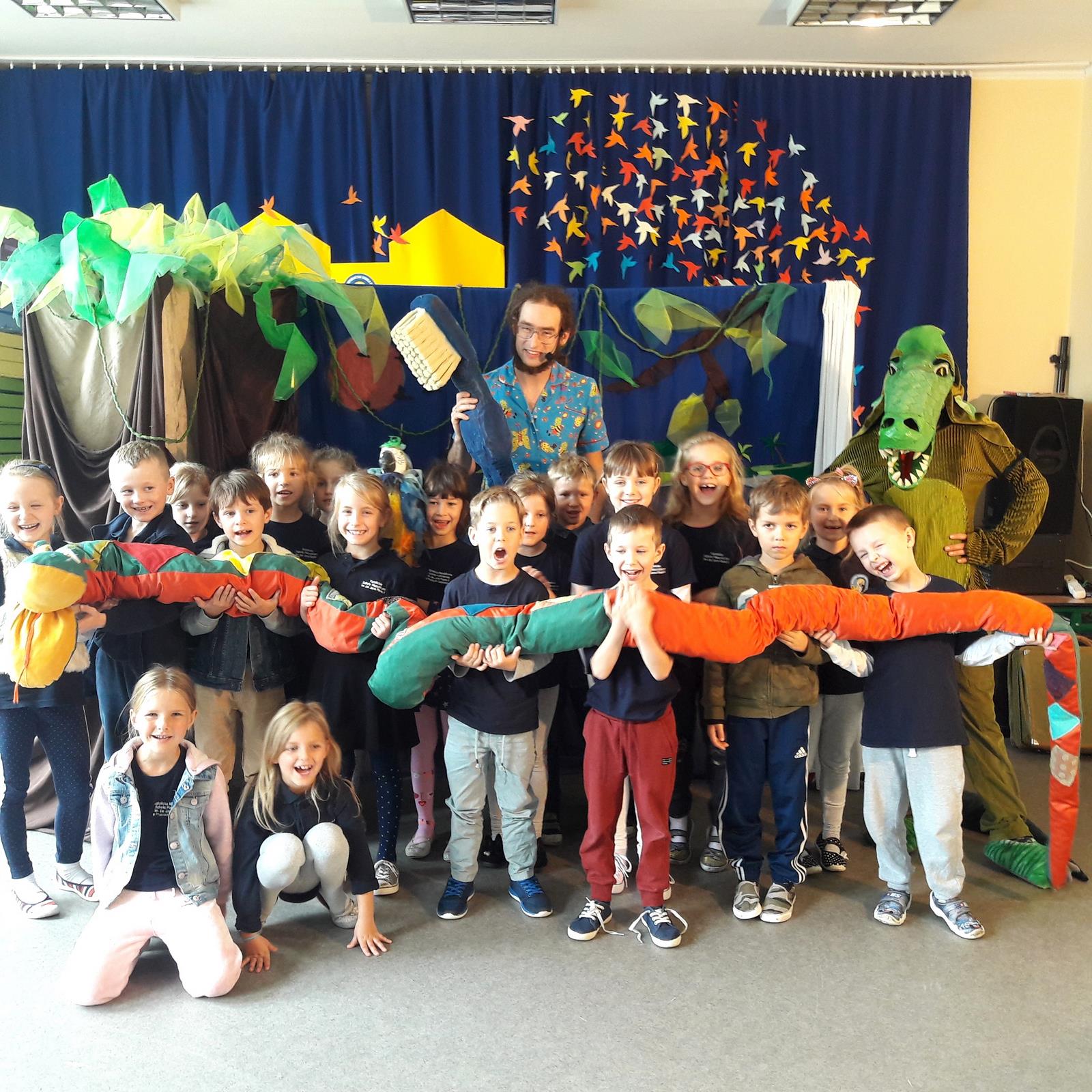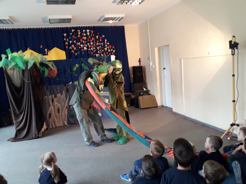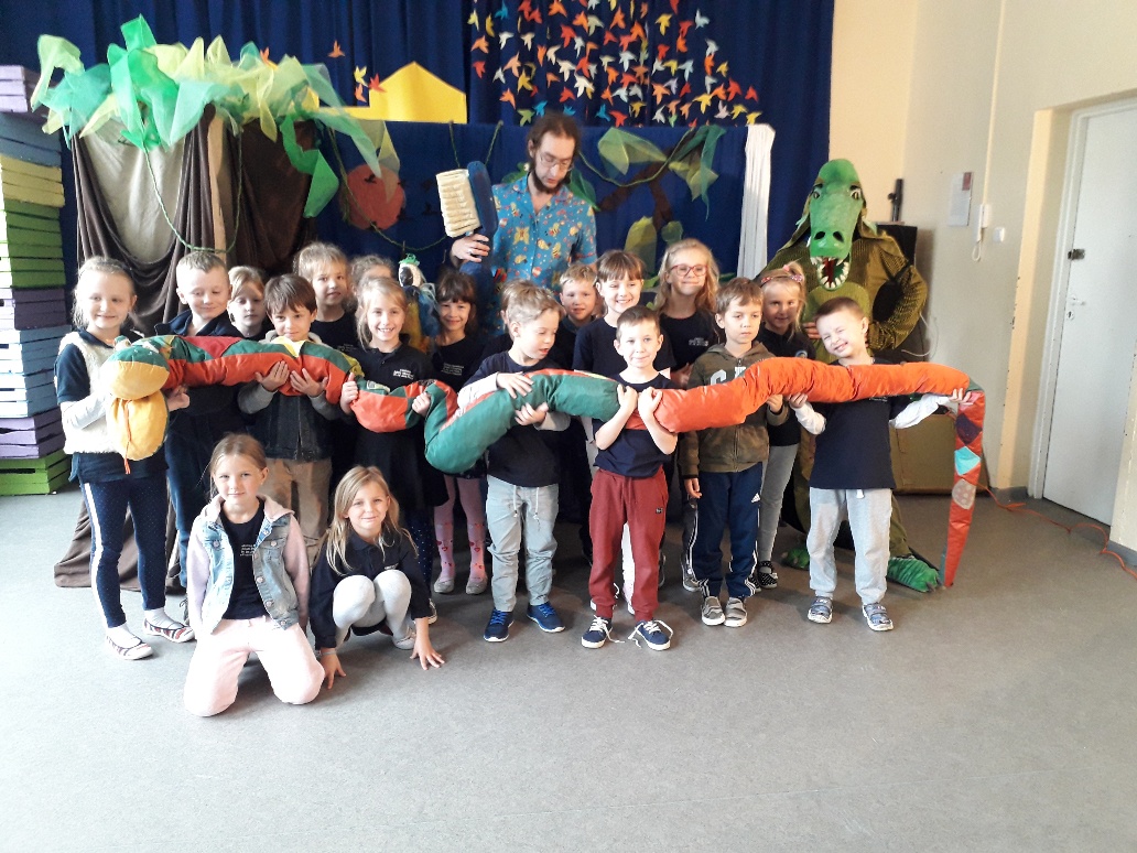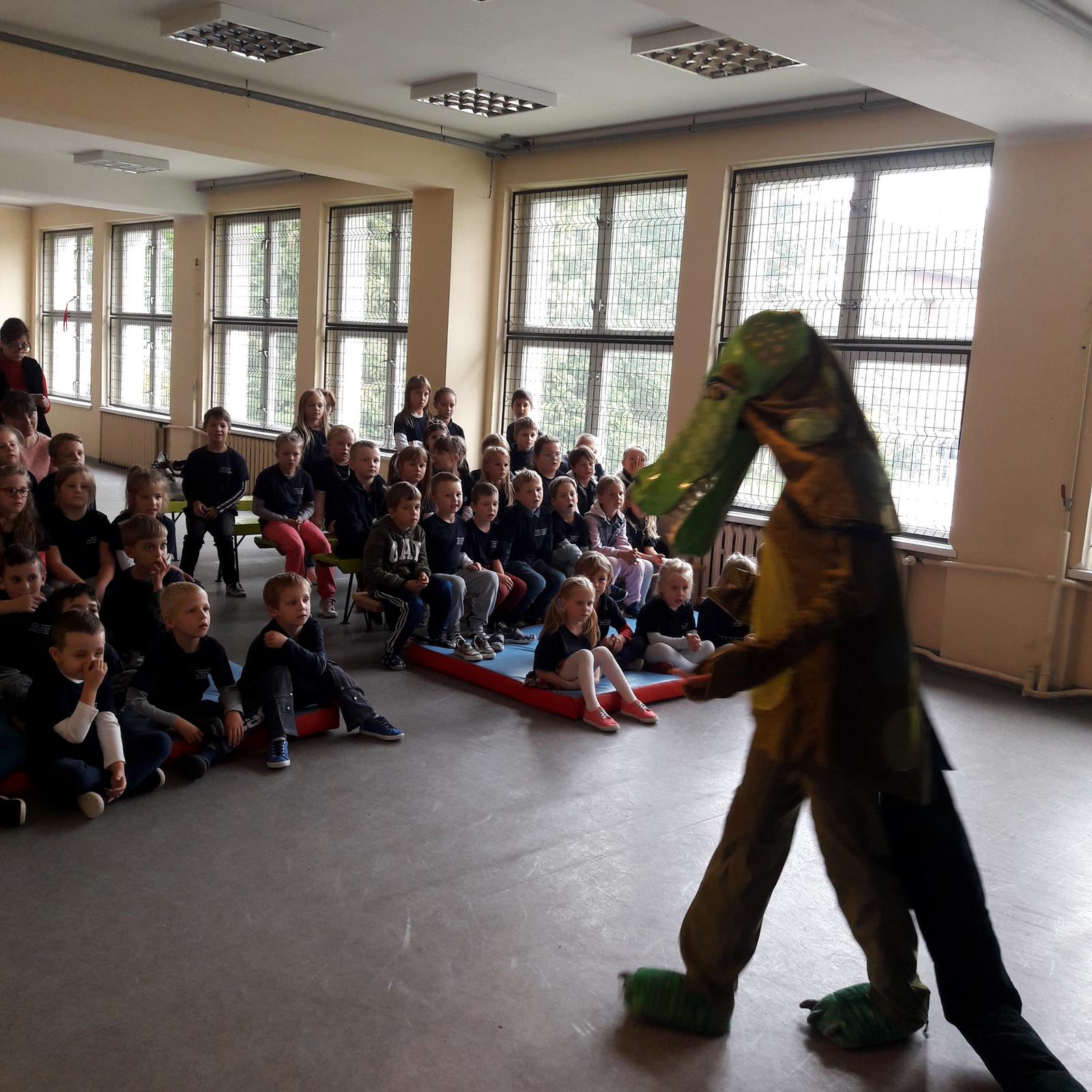 1 października klasy 0-3 odwiedził Teatr Obieżyświat z przedstwieniem "Krokodyle łzy, czyli z wizytą u dentysty". Główny bohater - krokodyl Pako miał problem ze swoimi zębami , jednak nie chciał iść do dentysty, bo bardzo się go bał. Z pomocą przyszli przyjaciele, którzy próbowali wyleczyć jego zęby swoimi sposobami, które niestety okazały się nieskuteczne. Koniecznością była wizyta u dentysty, która jak się okazało wcale nie była taka straszna i pomogła rozwiązać problem zębów. Nasi uczniowie z dużym zainteresowaniem obejrzeli przedstawienie i wiedzą, aby mieć zdrowe ząbki należy odpowiednio o nie dbać i nie trzeba bać się dentysty.