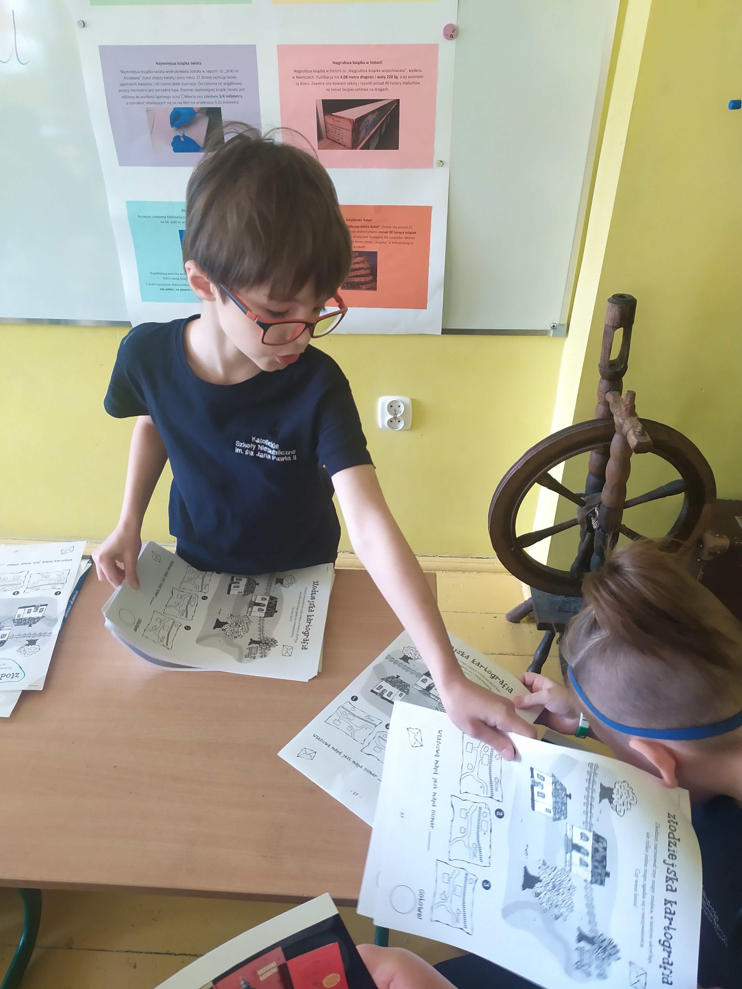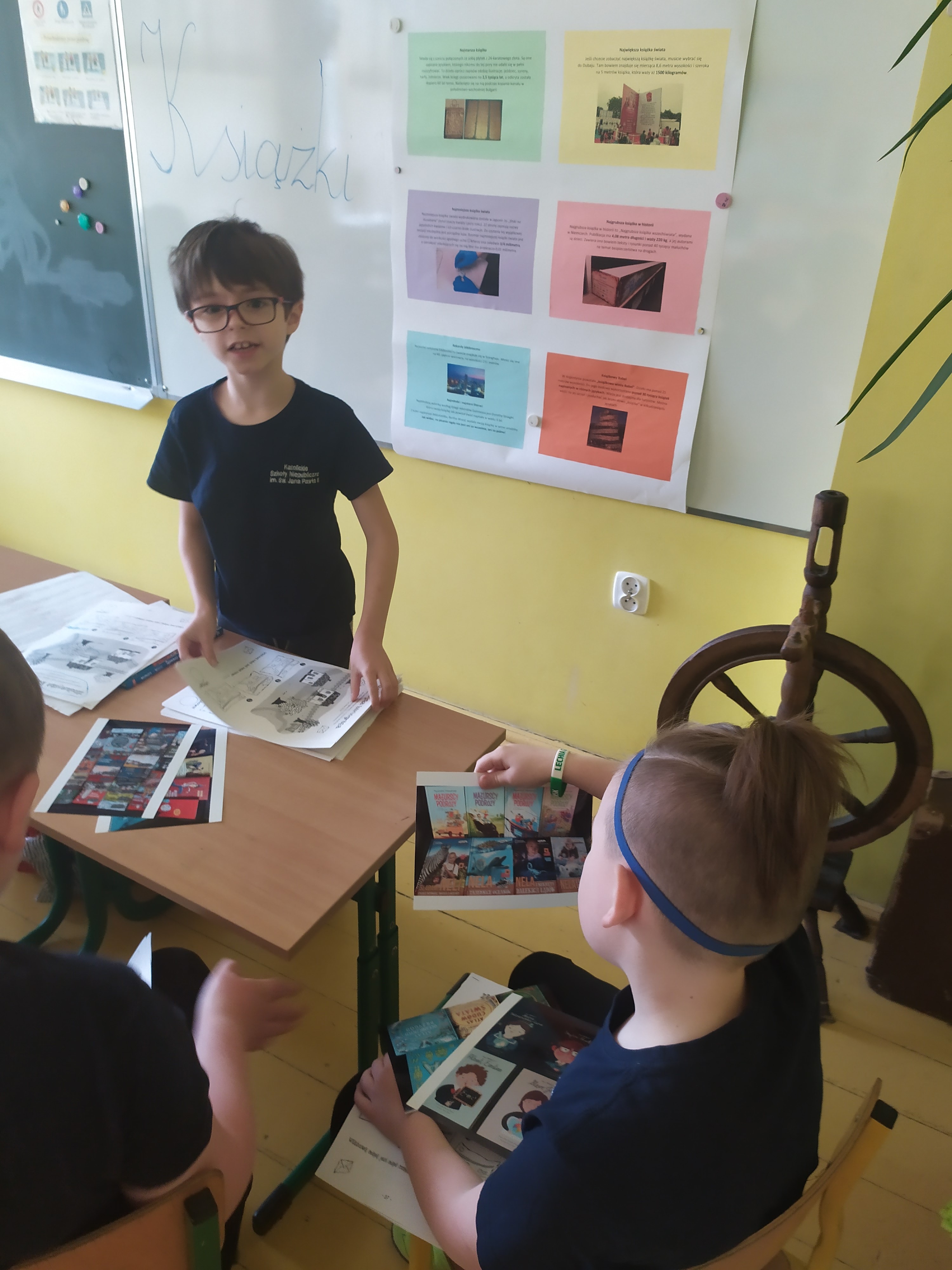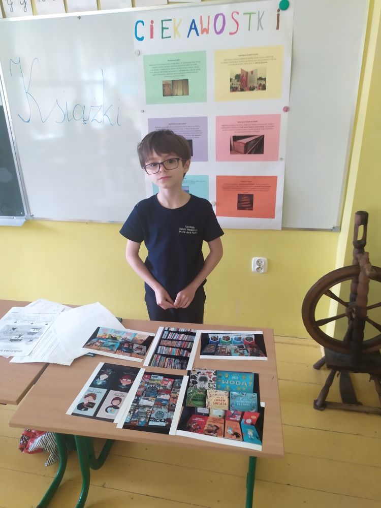 ''Witam cię kartek szelestem, Tytułem na pierwszej stronie, witam !'' (S..Szymański) Nasz kolega Antek podczas przygotowanej przez siebie lekcji opwiedział nam wiele ciekawostek dotyczących książek. Teraz już wiemy dlaczego warto sięgać po książki? . Byliśmy zdumieni ilością książek w jego bibioteczce- to już pokźna biblioteka.