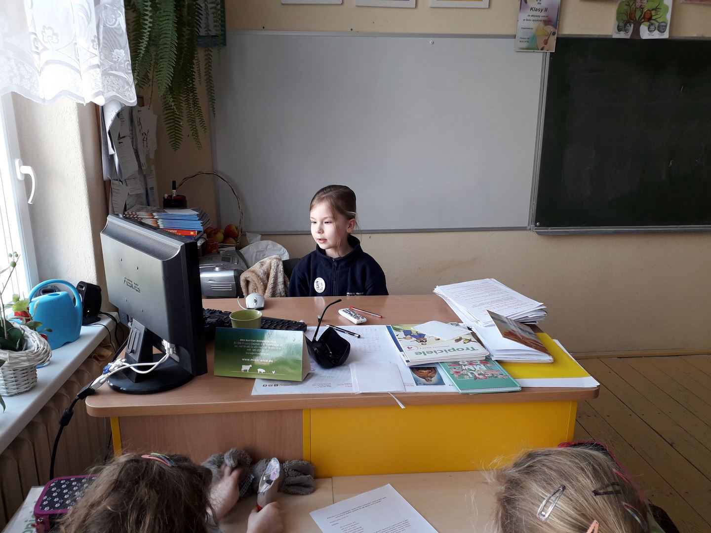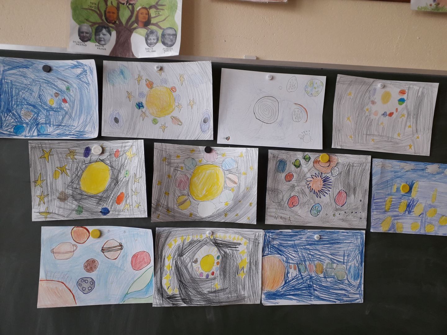 Dzisiaj mieliśmy przyjemność uczestniczyć w zajęciach, które przeprowadziła uczennica klasy drugiej Zoja Stacewicz. Przygotowała ciekawą prezentację oraz przekazała swoim rówieśnikom wiele ciekawostek o planetach. Na koniec zajęć dzieci miały za zadanie wykonać rysunek pt.„Jak wyobrażasz sobie kosmos?”. Wyobraźnia poszła w ruch. Z przepięknych rysunków powstała wystawa klasowa.