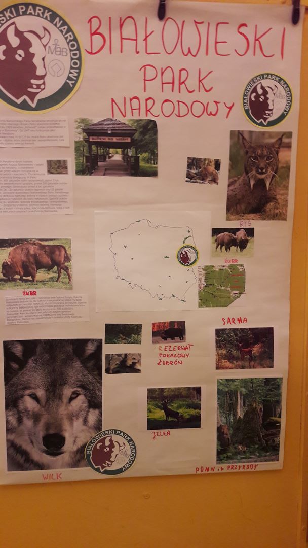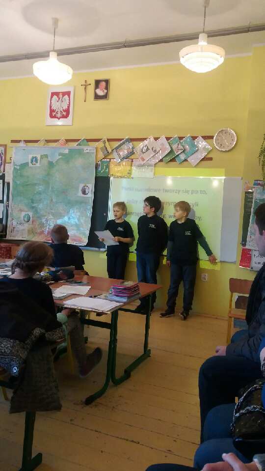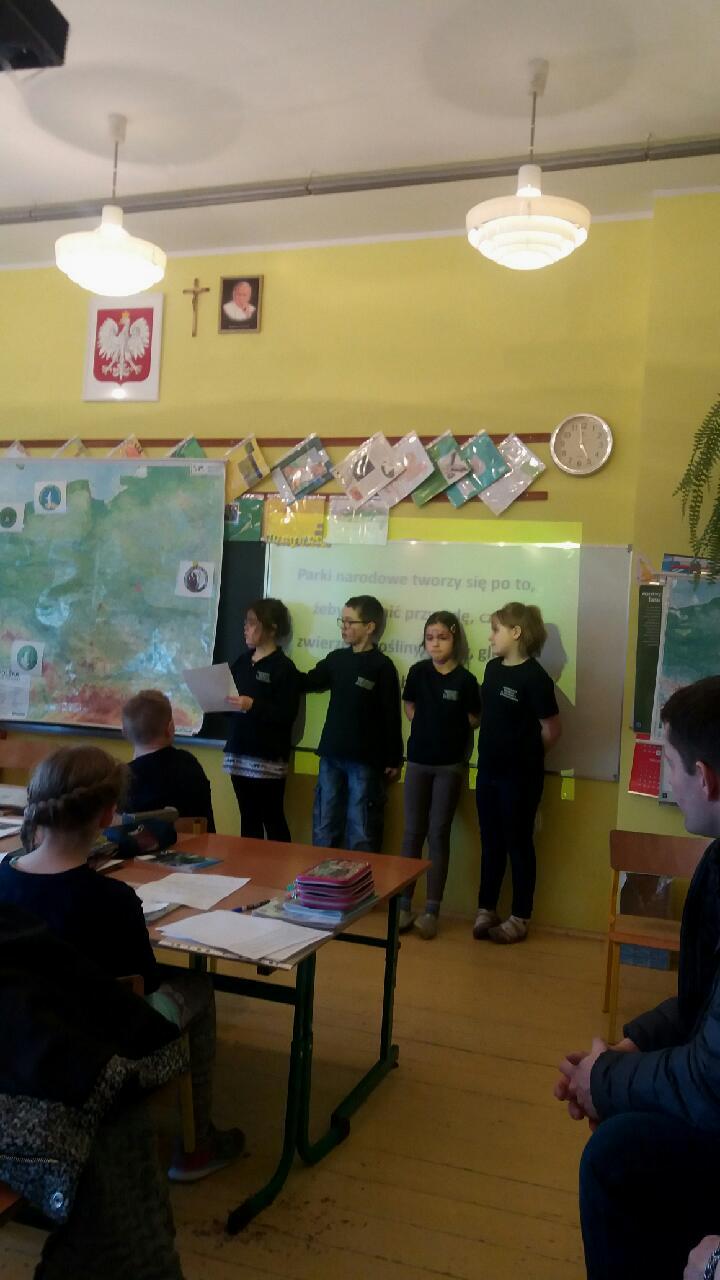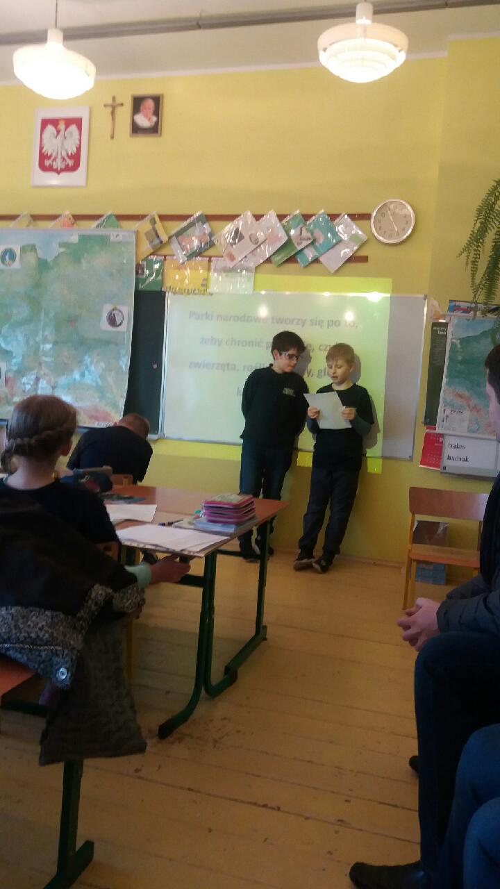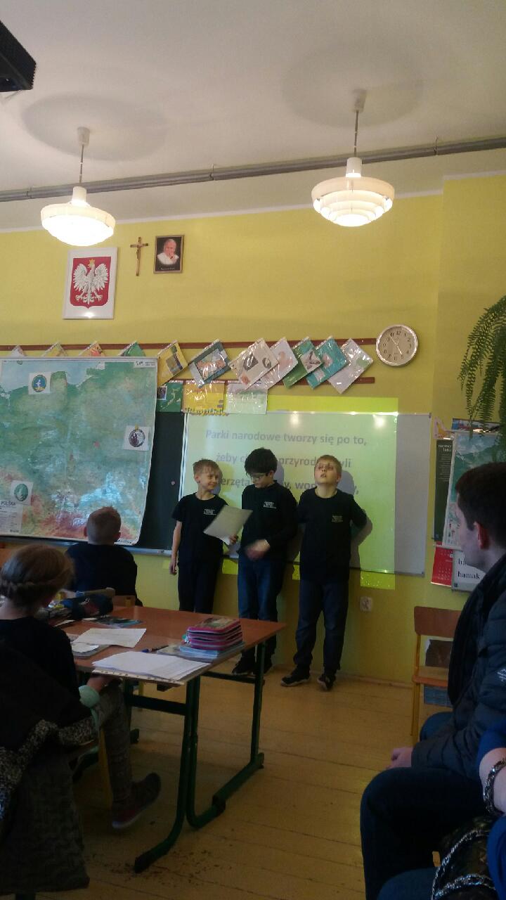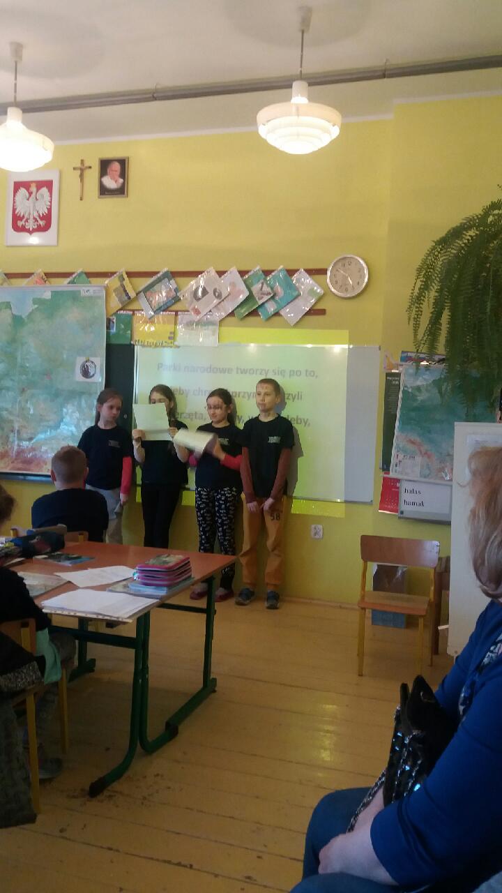 19 marca odbyła się lekcja otwarta dla rodziców. Na lekcji robiliśmy plakaty o parkach narodowych. Byliśmy podzieleni na cztery grupy i każda z nich miała napisać, gdzie się dany park znajduje, jaki ma symbol, czym się wyróżnia, jakie tam znajdują się rośliny i zwierzęta. Na plakacie mieliśmy umieścić wydrukowane zwierzęta z tego parku i mapę. Plakaty wykonywaliśmy razem z rodzicami. Na koniec dostaliśmy medale z napisem „Jestem przyjacielem przyrody”.