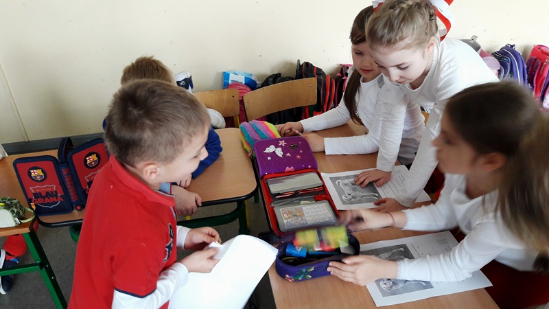Przygotował również karty pracy oraz słodkie nagrody za prawidłowe odpowiedzi. Lekcja była ciekawa, pełna niespodzianek i bardzo podobała się uczniom.