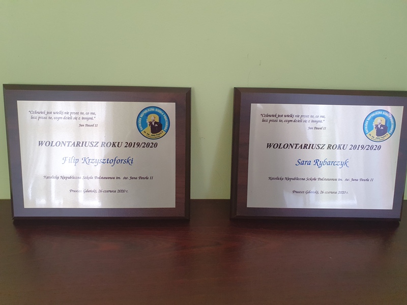 Ważną nagrodą w naszej szkole jest tytuł „WOLONTARIUSZA ROKU” – przyznajemy ją osobie z klasy najwyższej (w tym roku jest to klasa 8), która nie tylko podejmowała się różnych działań wolontarystycznych w szkole i poza nią, ale jest to przede wszystkim taka osoba, która dostrzega potrzebę niesienia pomocy, zawsze ma czas, jest empatyczna w stosunku do innych ludzi, ale też zwierząt. Jest to też osoba o wysokiej kulturze osobistej, na która mogą liczyć koleżanki, koledzy, ale też nauczyciele i wszyscy pracownicy szkoły.