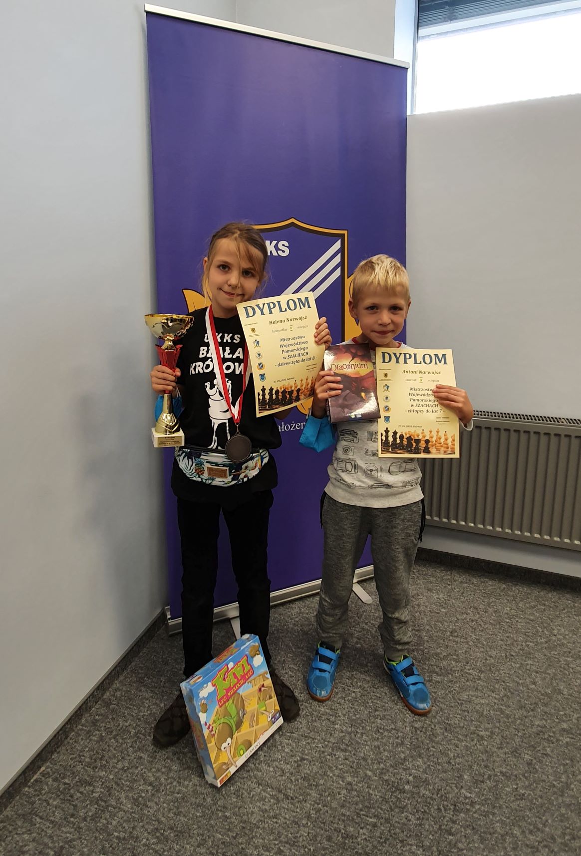 Z kolei w szachowych Mistrzostwach Województwa Pomorskiego do lat 7 i 8 Helenka zajęła zaszczytne II miejsce. Antek, Jej młodszy brat, idąc w ślady siostry, z tych samych mistrzostw wrócił jako laureat IV miejsca w grupie 7-latków.