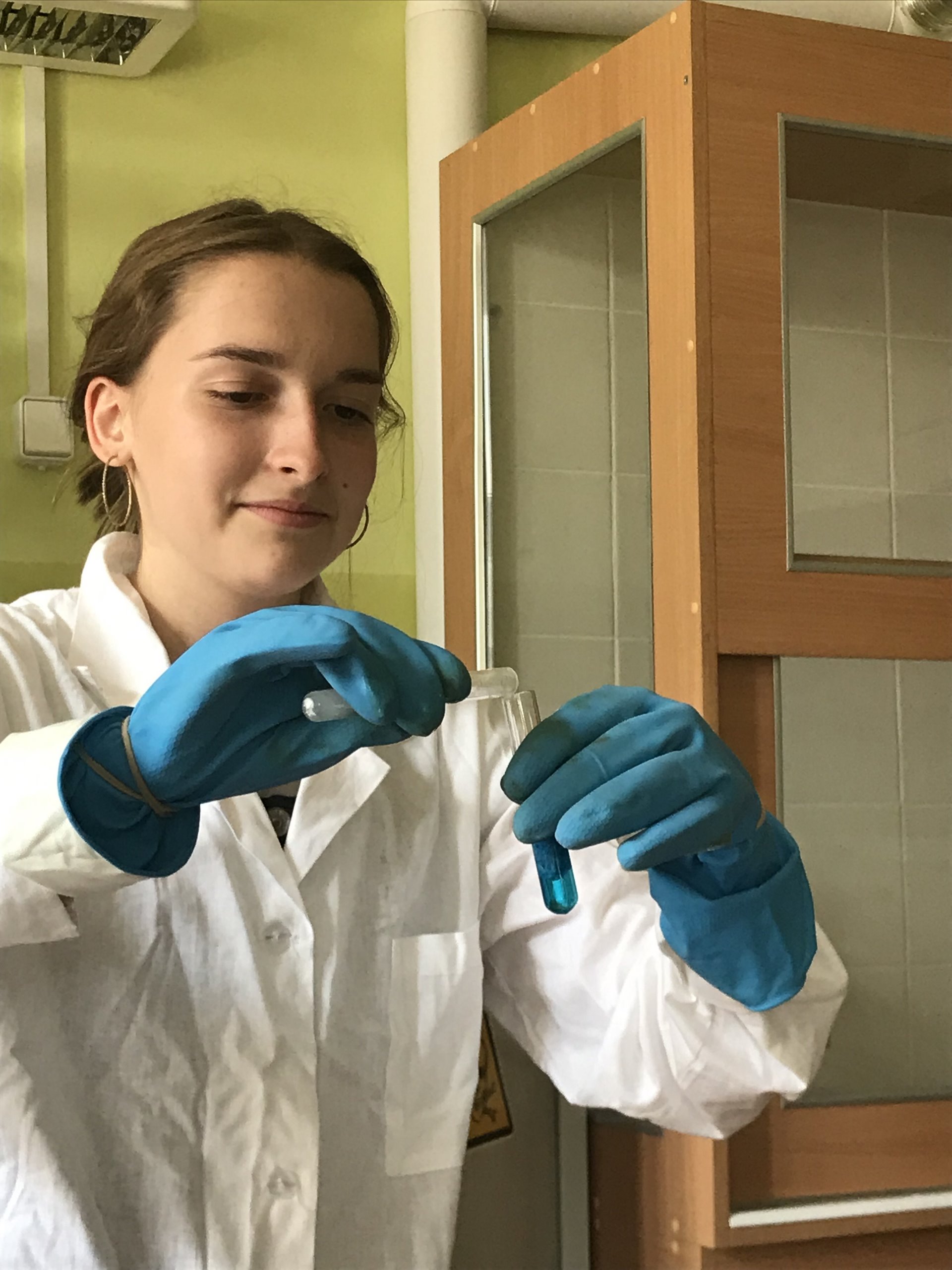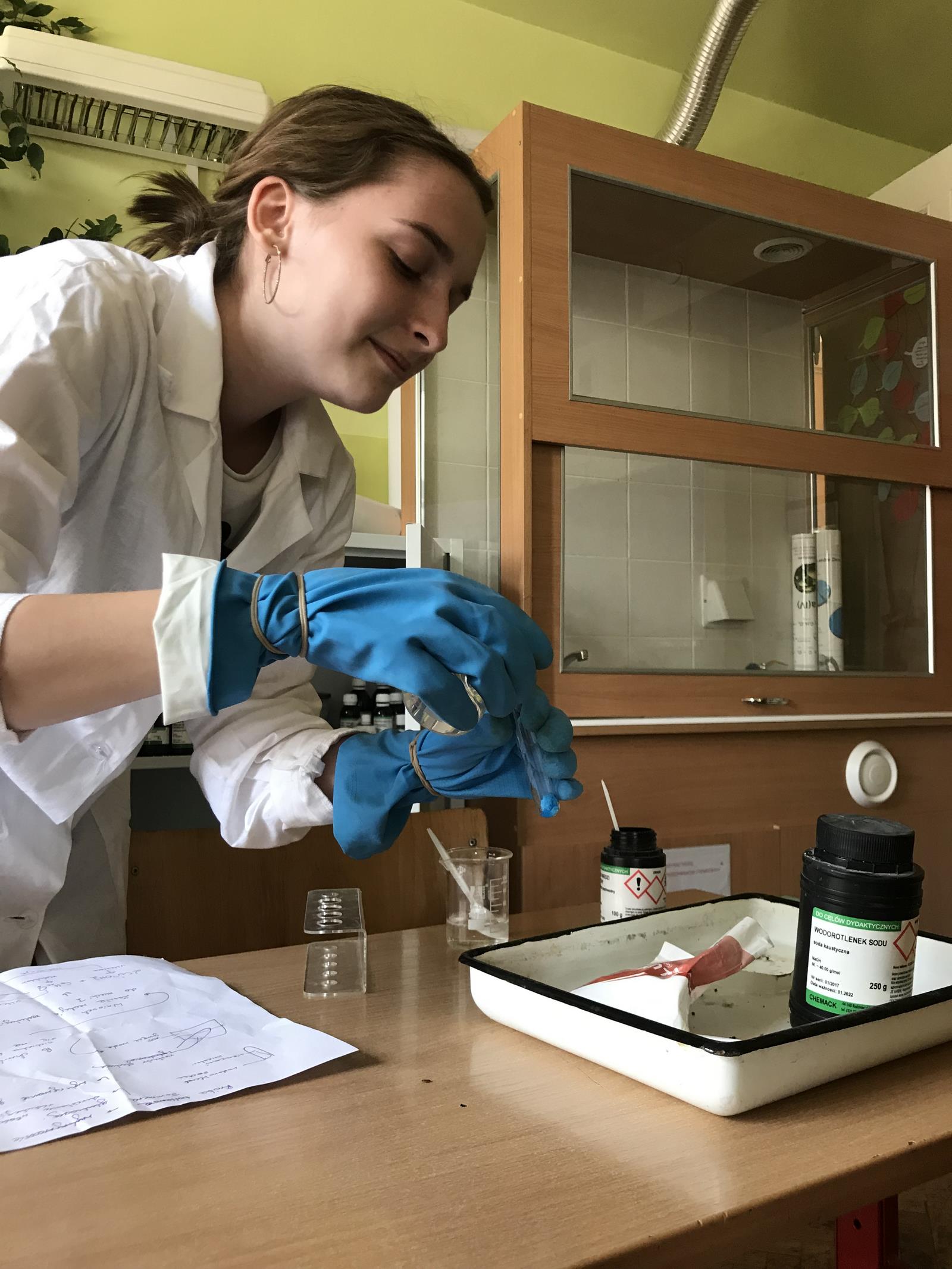 W czwartek 06.06.2019 r. na lekcji chemii w klasie III a gimnazjum Róża Włodkowska samodzielnie wykonywała próbę Trommera. Doświadczenie udało się i Róża trzymała wynik pozytywny tej próby, czyli ceglasty kolor. Róża na koniec podsumowała wykonane przez siebie zadanie - " Możliwość wykonania samodzielnie doświadczenia sprawiło mi wiele radości, a szczególnie, że interesuje się chemią. "