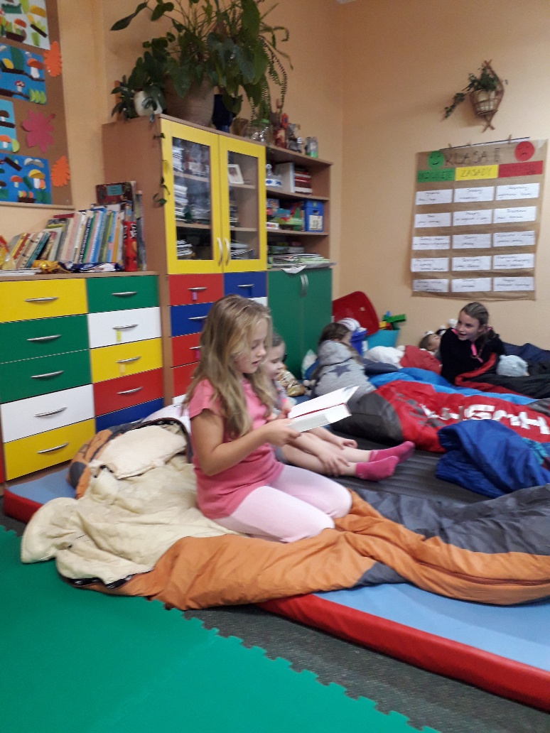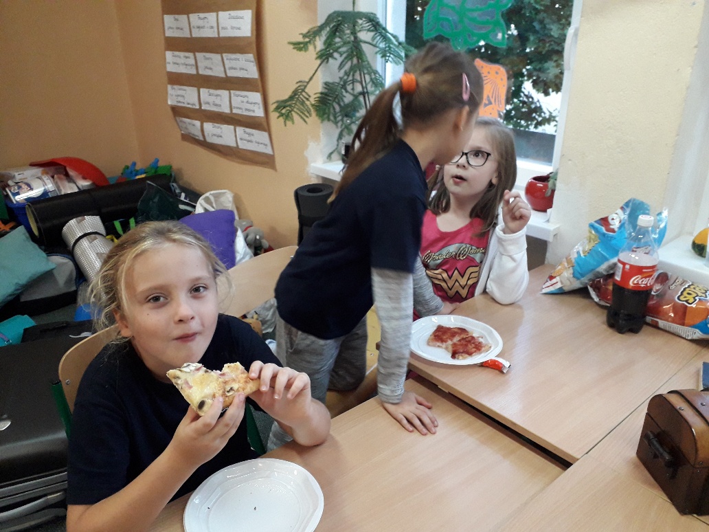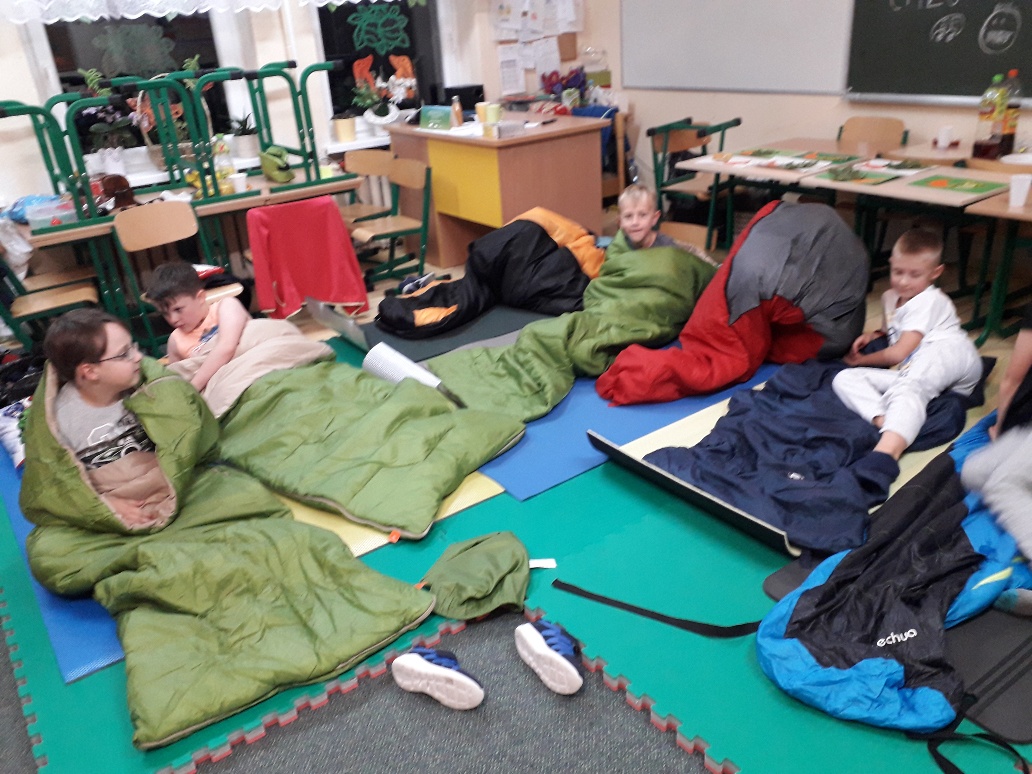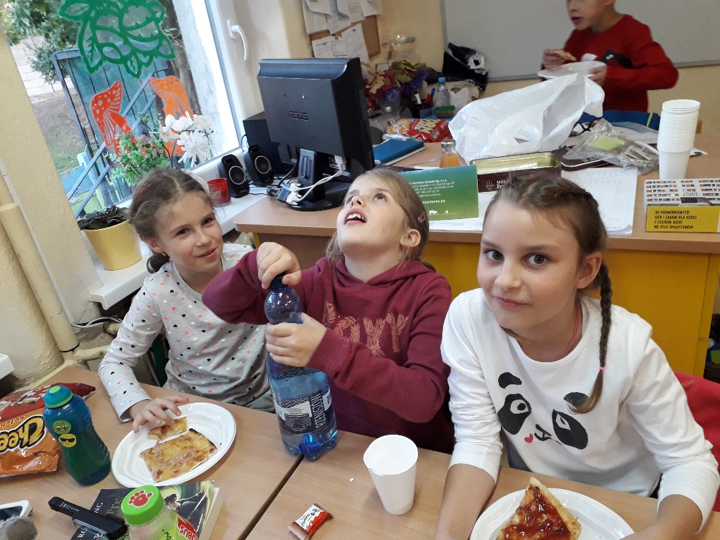 W ostatni piątek było super nocowaliśmy w szkole. Od rana wszyscy czekaliśmy na godzinę 17.00. Oto krótka relacja. Od czego tu zacząć...Najpierw dziewczynki odśpiewały chłopcom "Sto lat" z okazji Dnia Chłopaka,a następnie przygotowały sporo konkursów dla nich. Było bardzo wesoło. Chłopcy z naszej klasy otrzymali również upominki, ale to nie koniec atrakcji.Wieczorem zamówiliśmy pizzę, którą ze smakiem wszyscy zjedli. Odwiedził nas także miły gość. Przyszła do nas Pani Grażynka i przeczytała nam fragment książki z Maratonu Czytelniczego. Potem graliśmy w gry stolikowe i zrobiliśmy piękne wiewiórki. Zapraszamy do obejrzenia zdjęć...