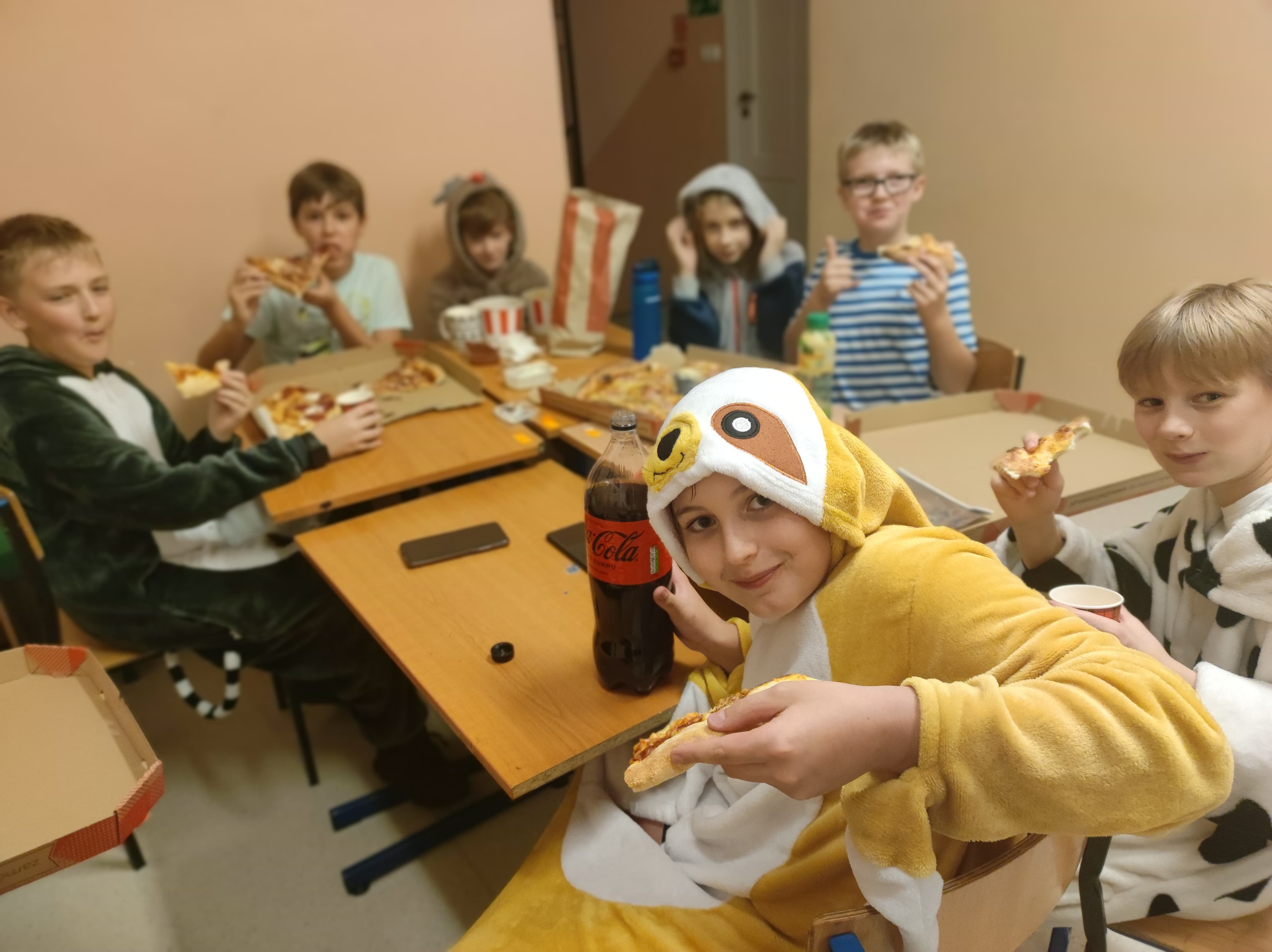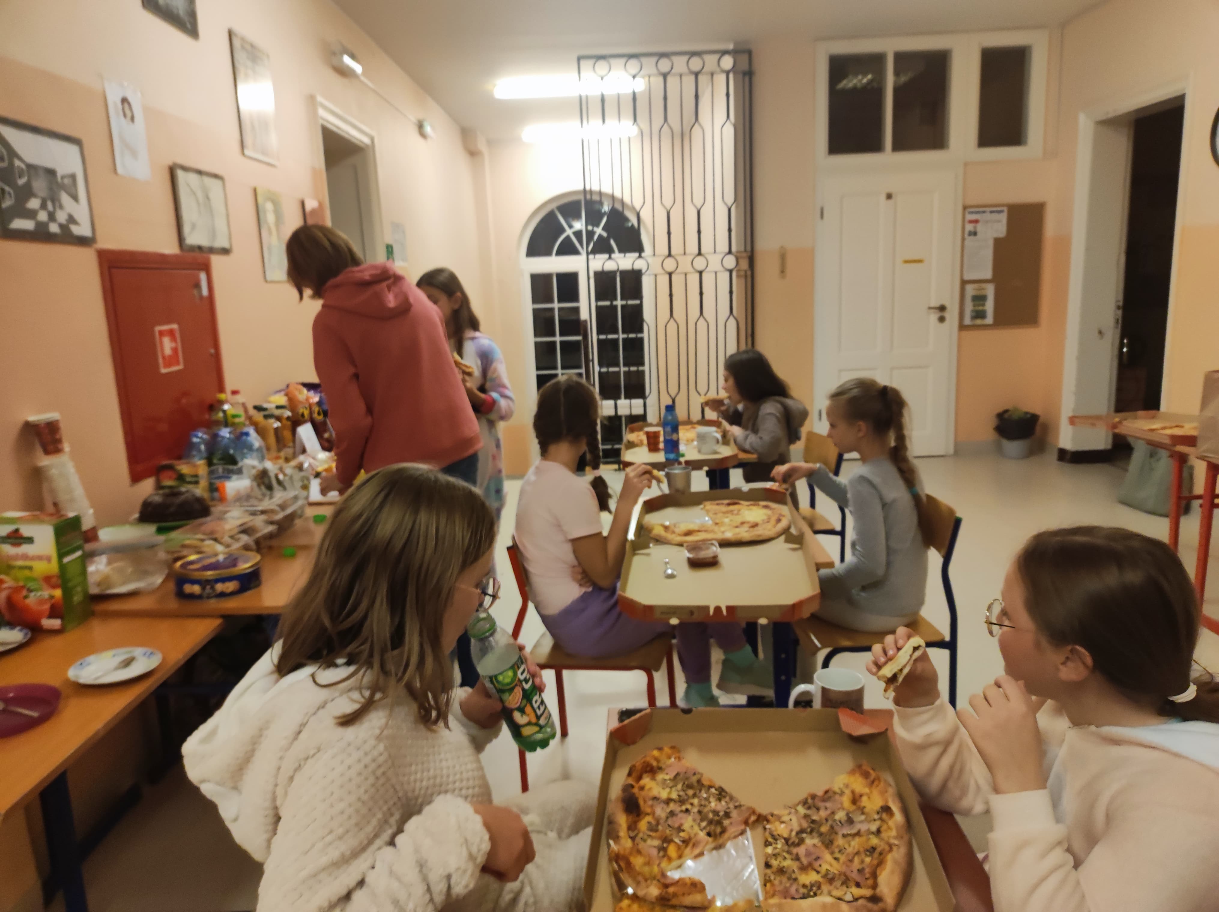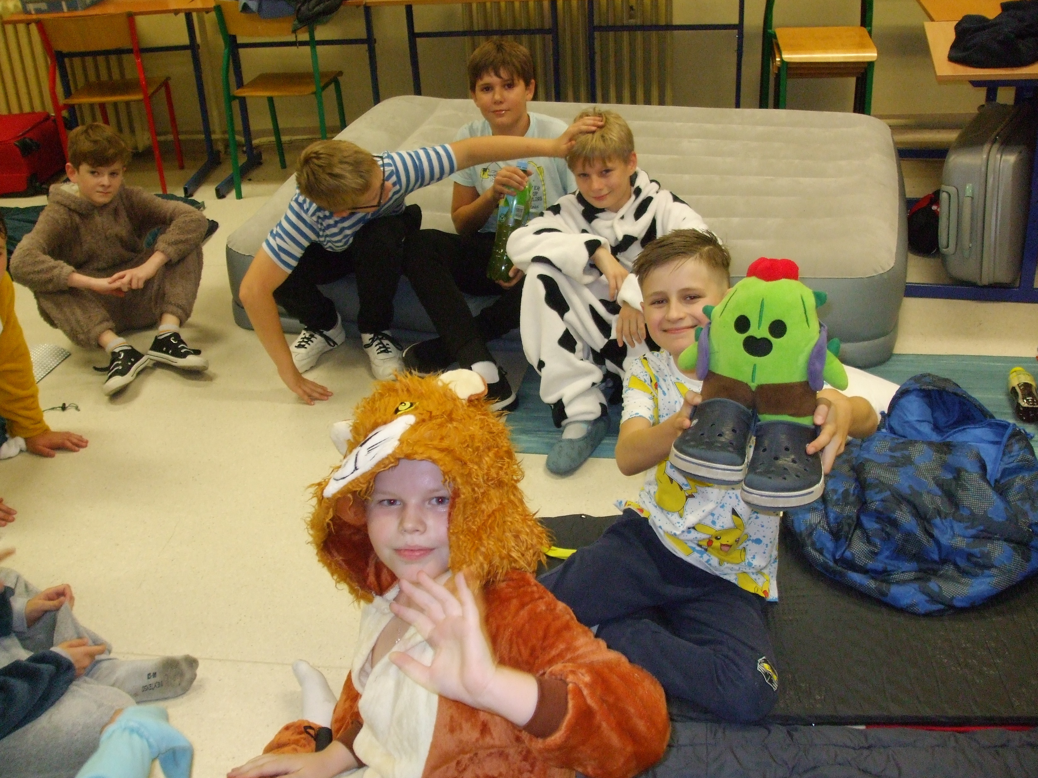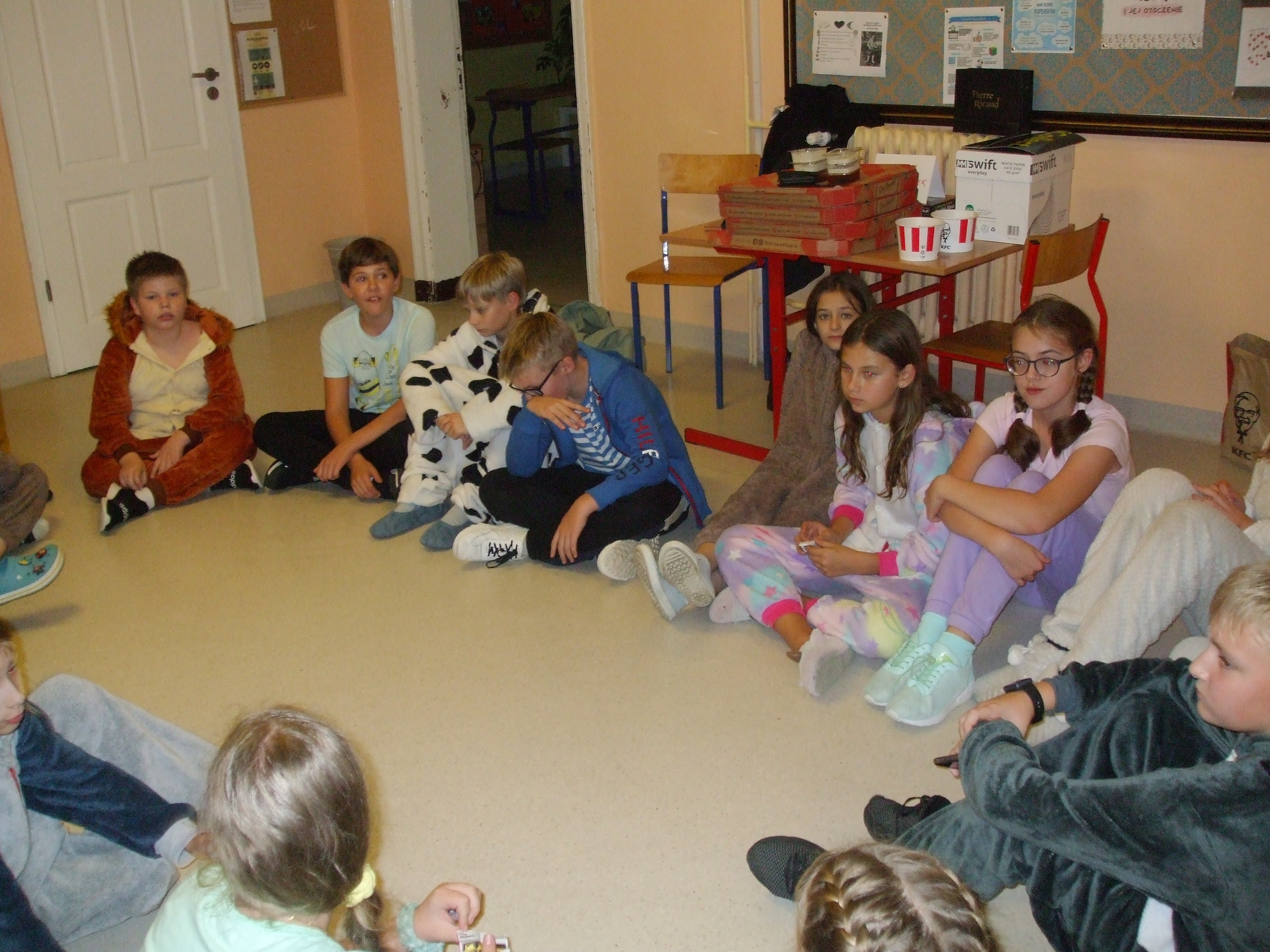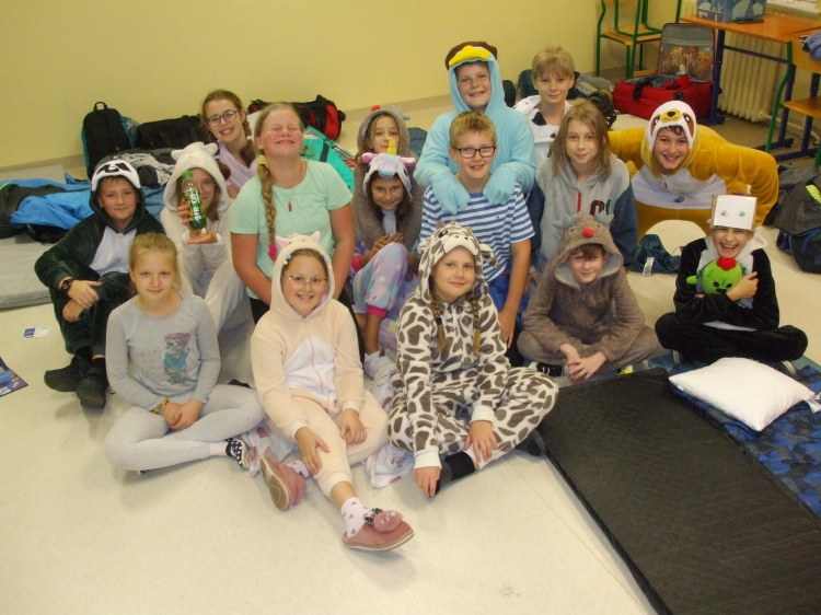 W pewnien piątkowy wieczór, a właściwie piątkową noc klasa 5 nocowała w budynku szkolnym. Impreza była różnorodna: przygotowanie pokoi, sali stołówkowej i wspólnego bufetu, wspólne zjedzenie kolacji, gry integracyjne, zabawa w ciemnego chowanego w ciemnej szkolnej piwnicy - to wszystko zapewniło uczniom i opiekunom niemałą rozrywkę, ale... po cóż się rozpisywać, to trzeba zobaczyć, na zdjęciach :)