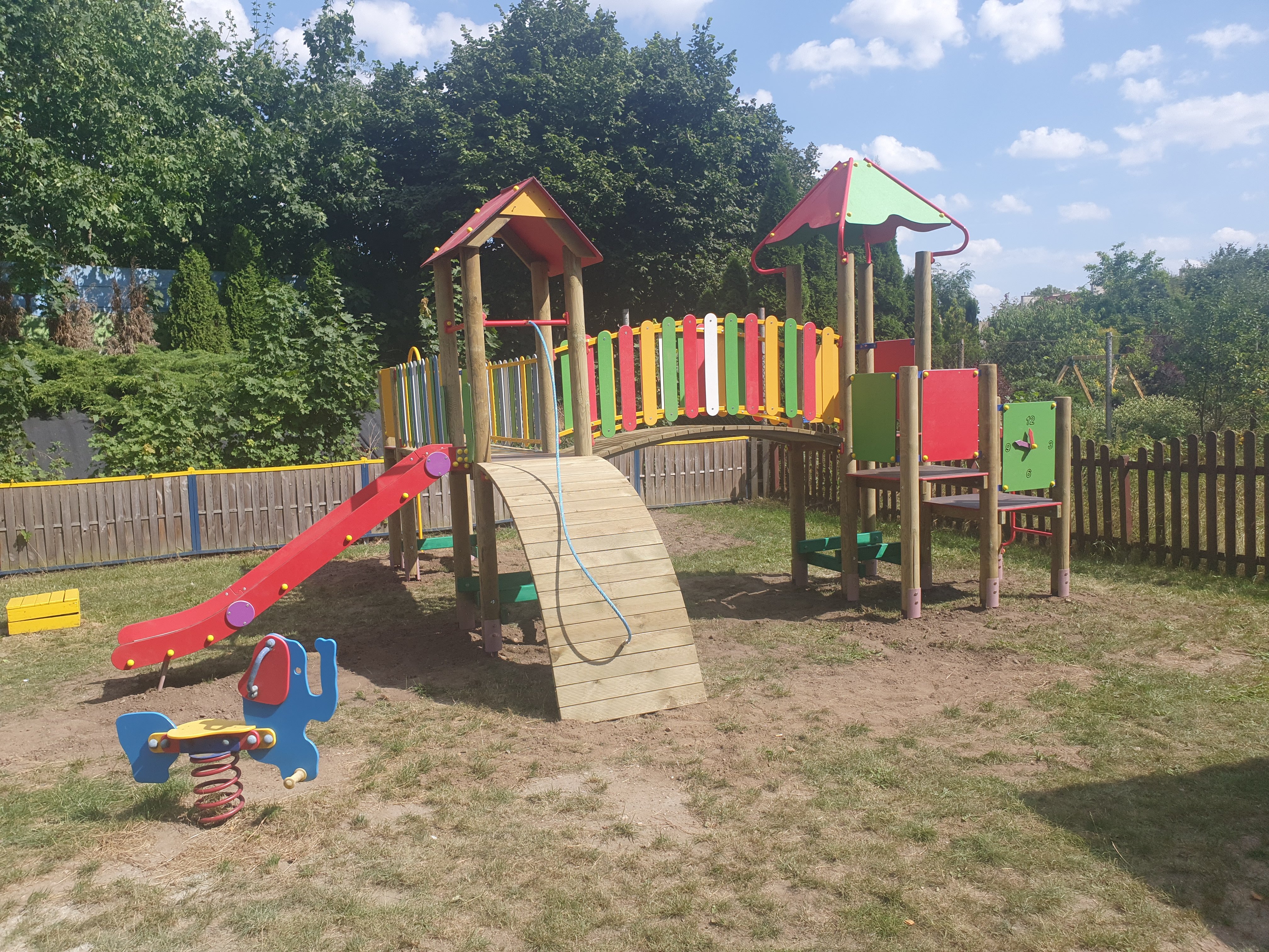 Drugi budynek szkolny jest także wyposażony w nowoczesny i bezpieczny plac zabaw dla dzieci.