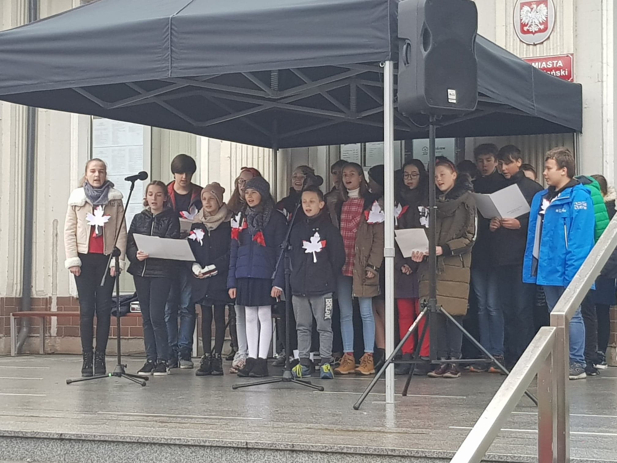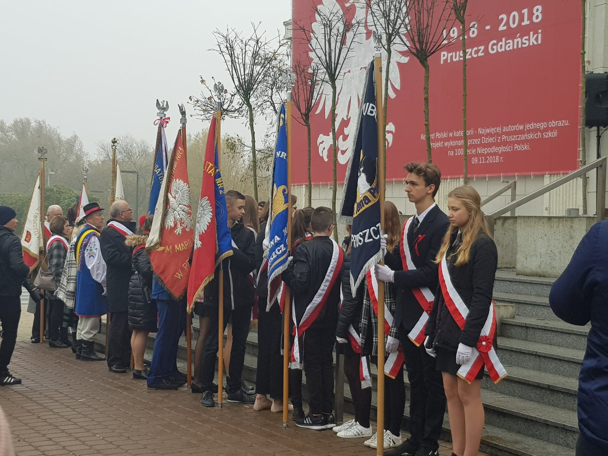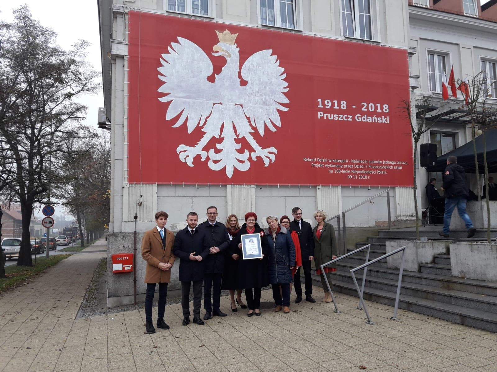 09.11.2018 r. uczniowie naszej szkoły wzięli udział w uroczystych obchodach 100 rocznicy odzyskania Niepodległości pod budynkiem Urzędu Miasta w Pruszczu Gdańskim. Obchody rozpoczęto uroczystym zawieszeniem na budynku Urzędu Miejskiego Godła Rzeczpospolitej Polskiej, namalowanego w deszczowy poranek 26.10.2018 r. przez uczniów pruszczańskich szkół. Wielkie malowanie było jednoczenie próbą pobicia rekordu Guinnessa, którego certyfikat został wręczony podczas dzisiejszych obchodów. O godzinie 11:11, uczniowie KNSP wzięli udział w akcji "Rekord dla Niepodległej" i wspólnie z uczniami z innych pruszczańskich szkół zaśpiewaliśmy 4-zwrotkowy hymn narodowy.