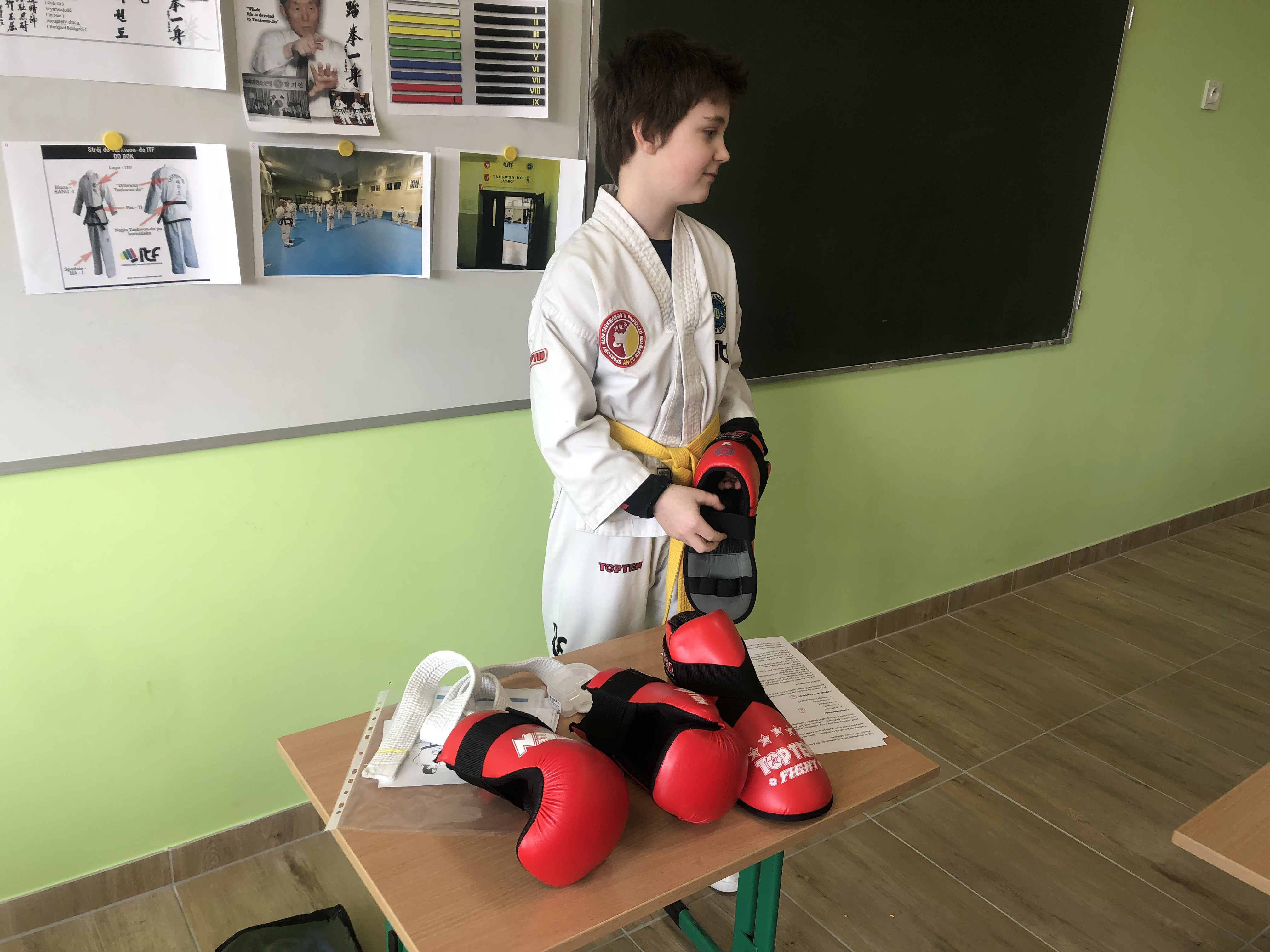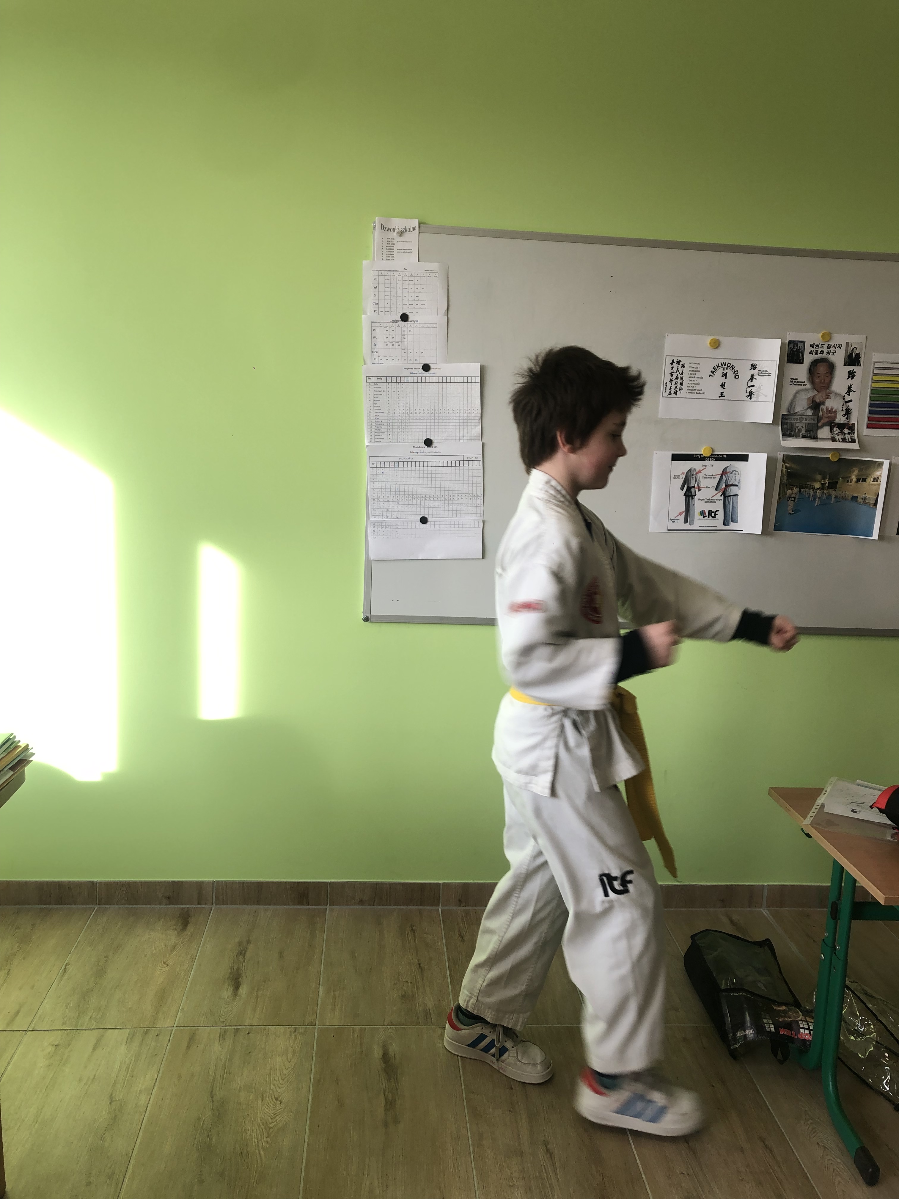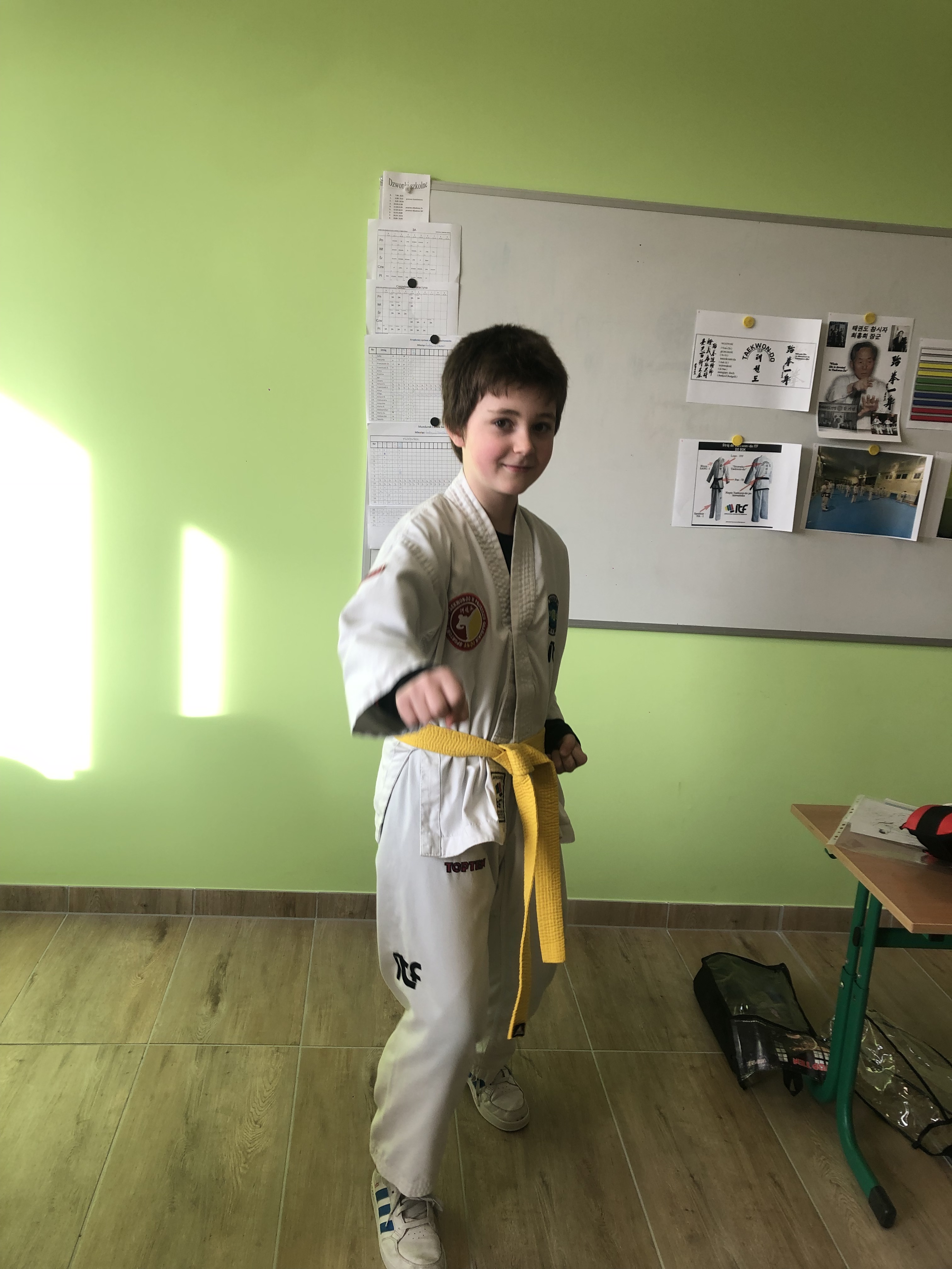 Olek, uczeń klasy III w ostatni piątek poprowadził dla swoich koleżanek i kolegów z klasy profesjonalnie przygotowaną lekcję o swojej pasji taekwondo.