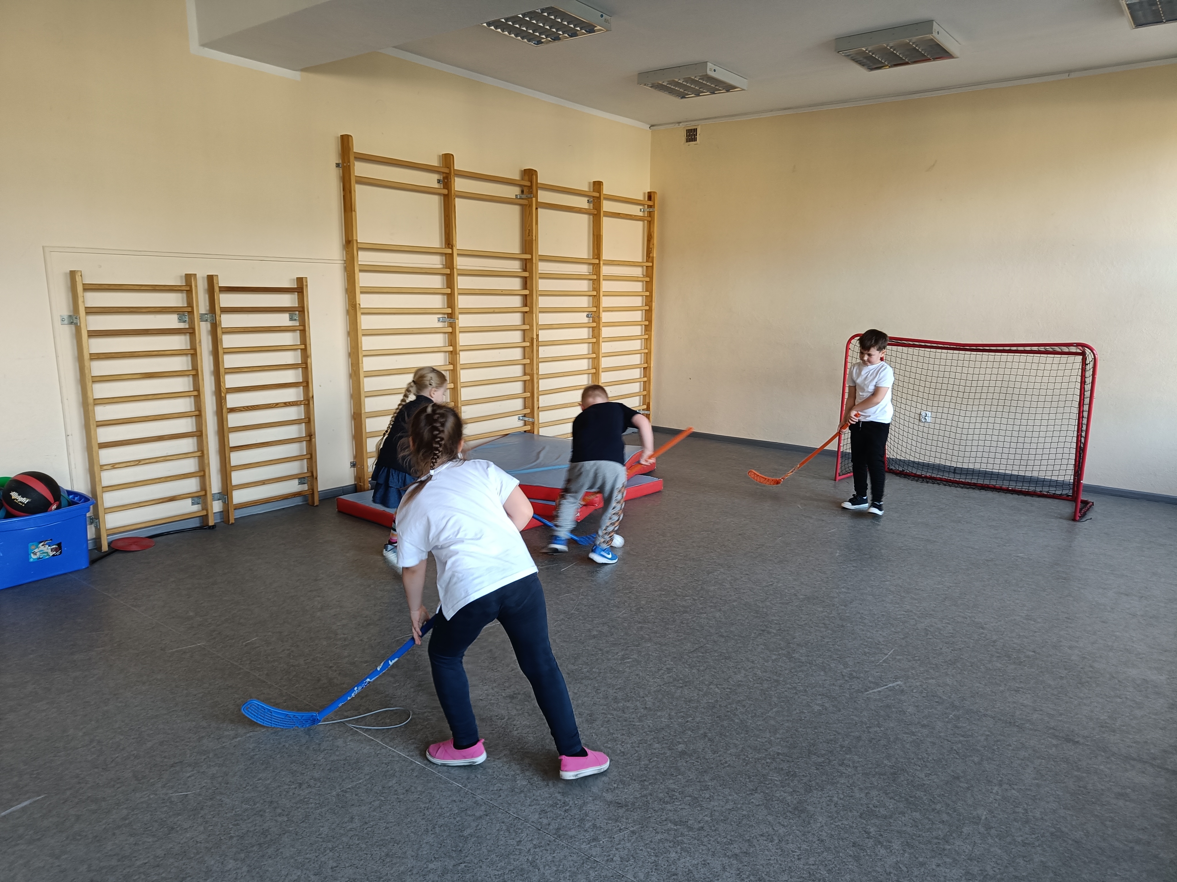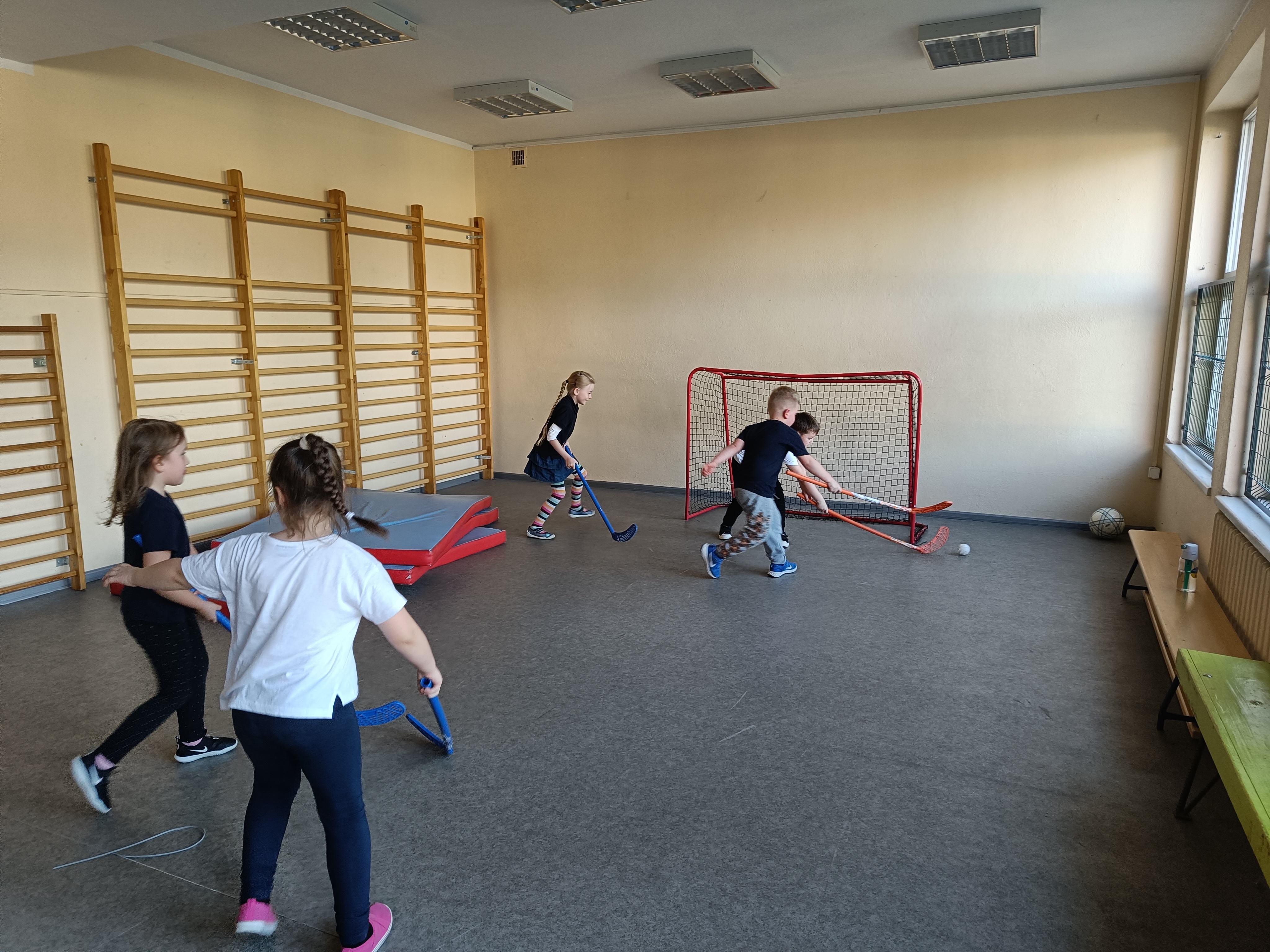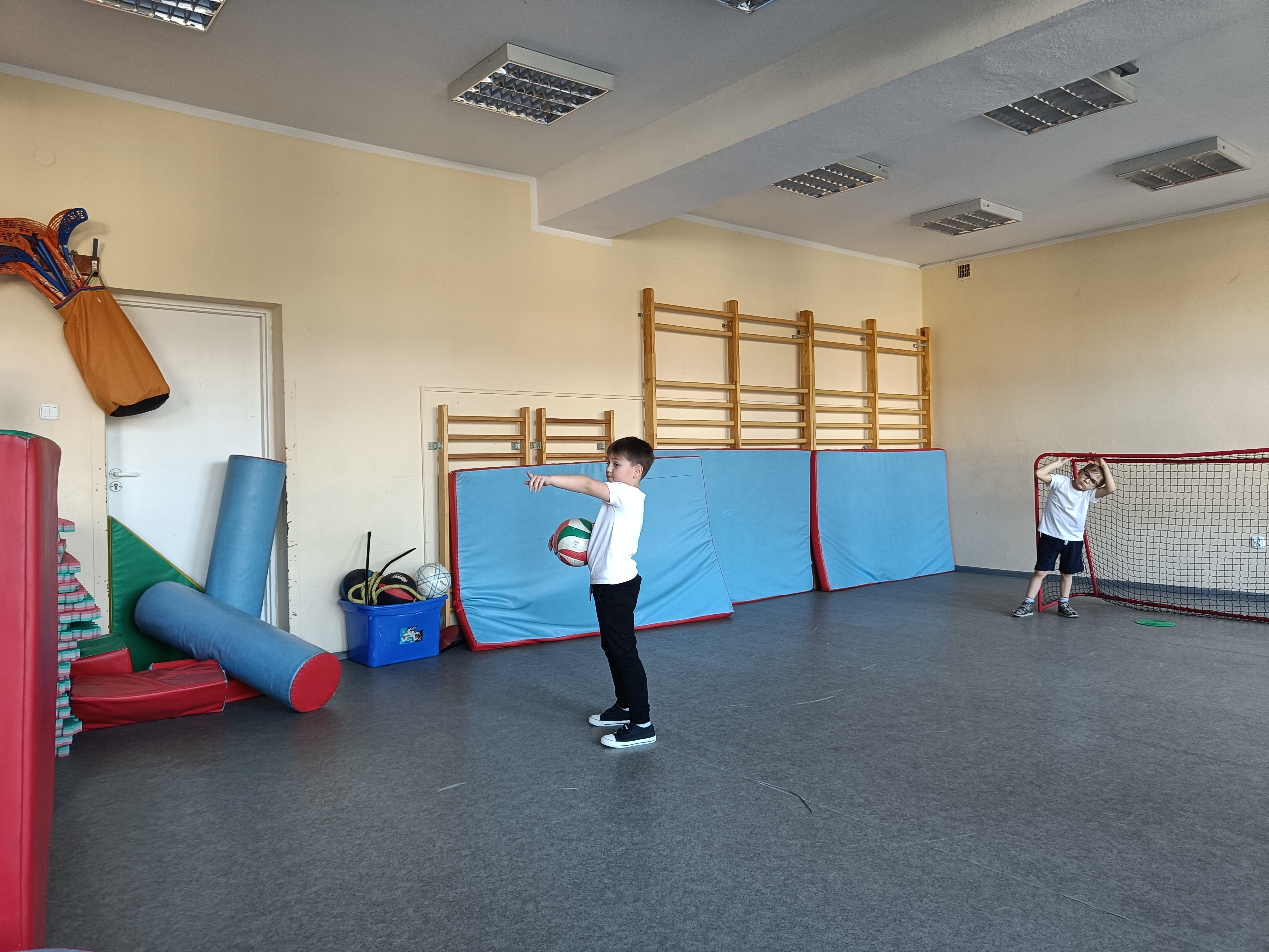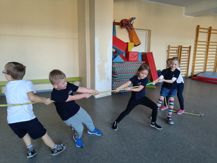 Piotruś wcielił się w rolę nauczyciela i poprowadził lekcję wf-u. Podczas tej lekcji zaprosił dzieci do gry w piłkę nożną z przeszkodami :) , nastepnie było przeciąganie liny i na koniec gra w unihokeja. Piotrka lekcja spodobała się wszystkim dzieciom.