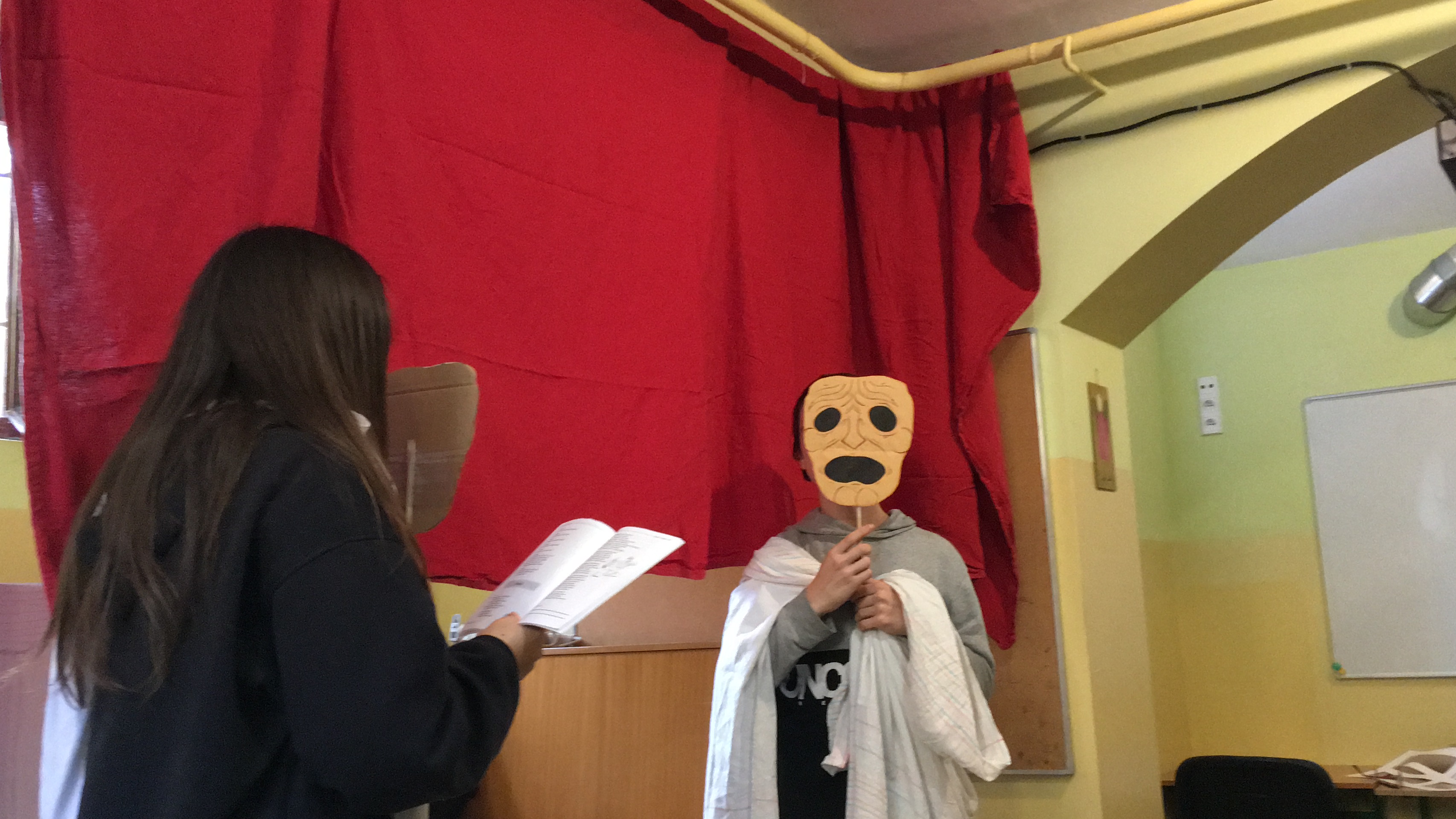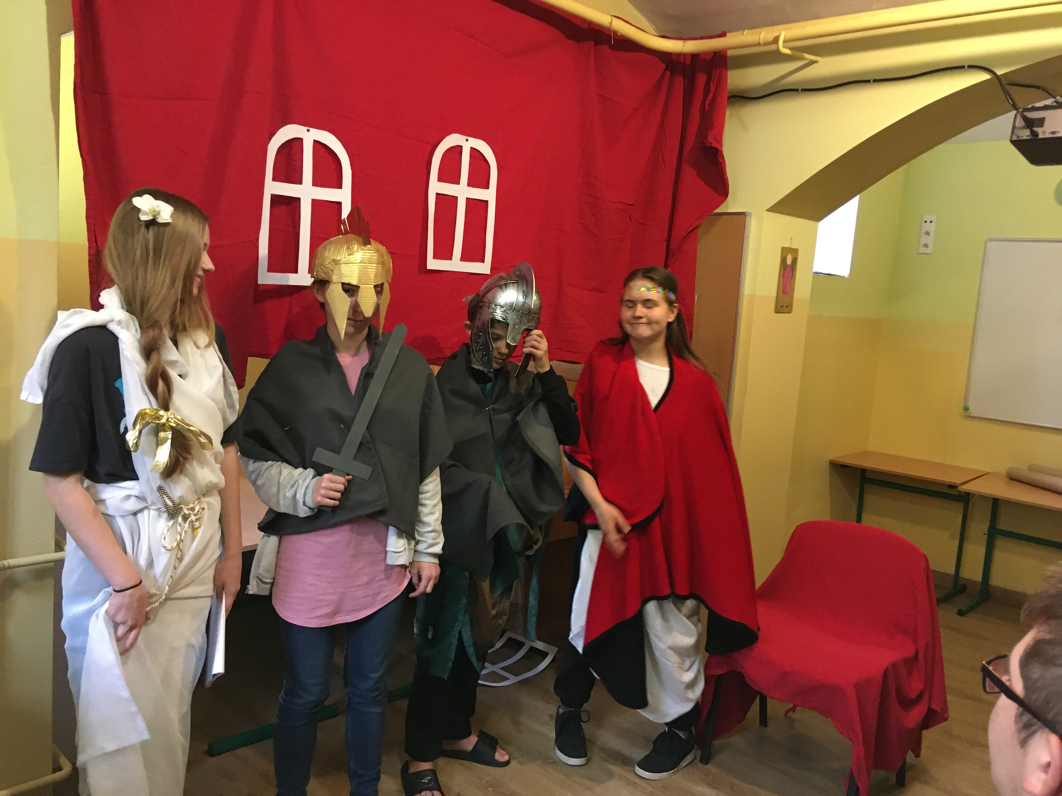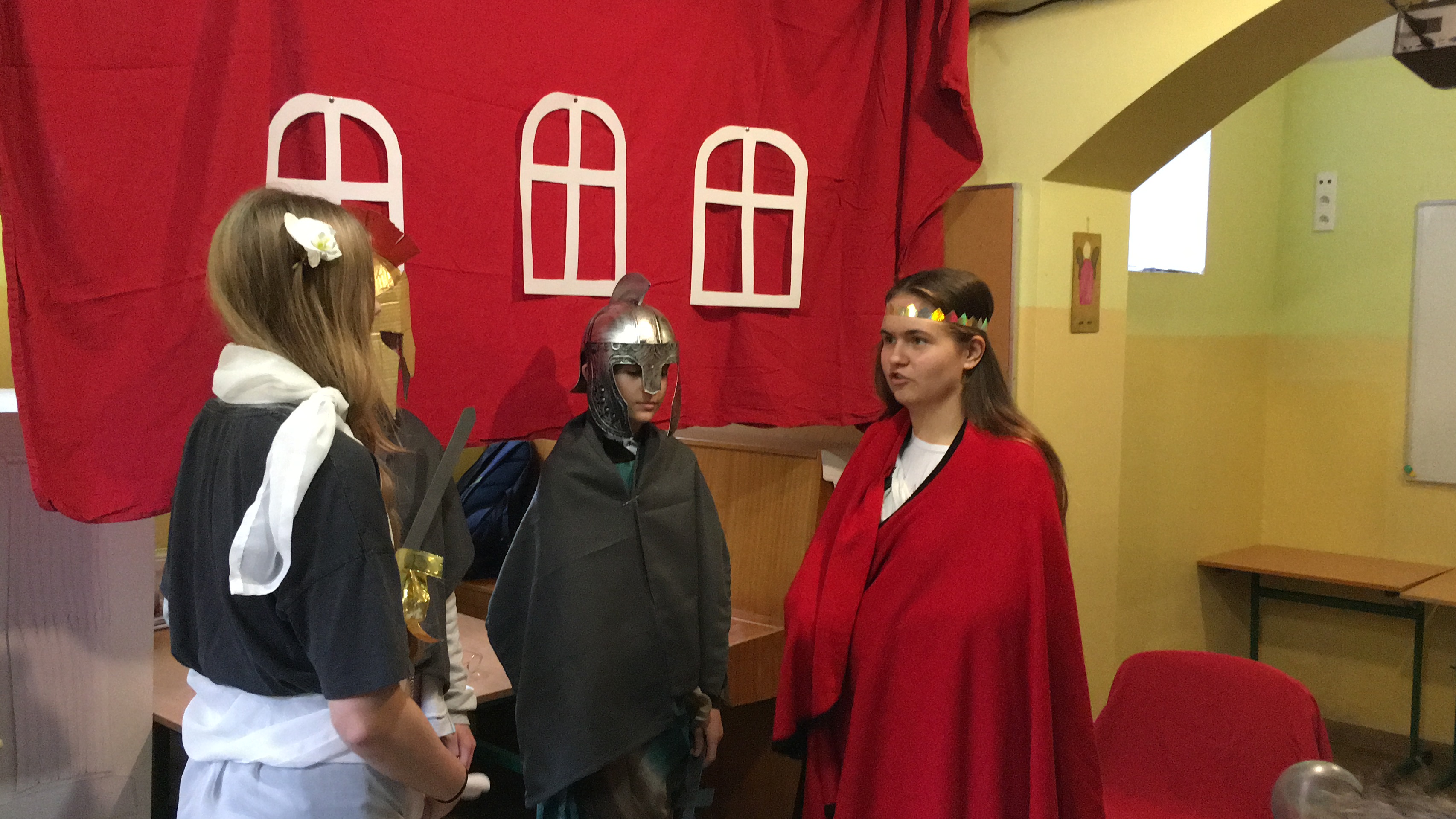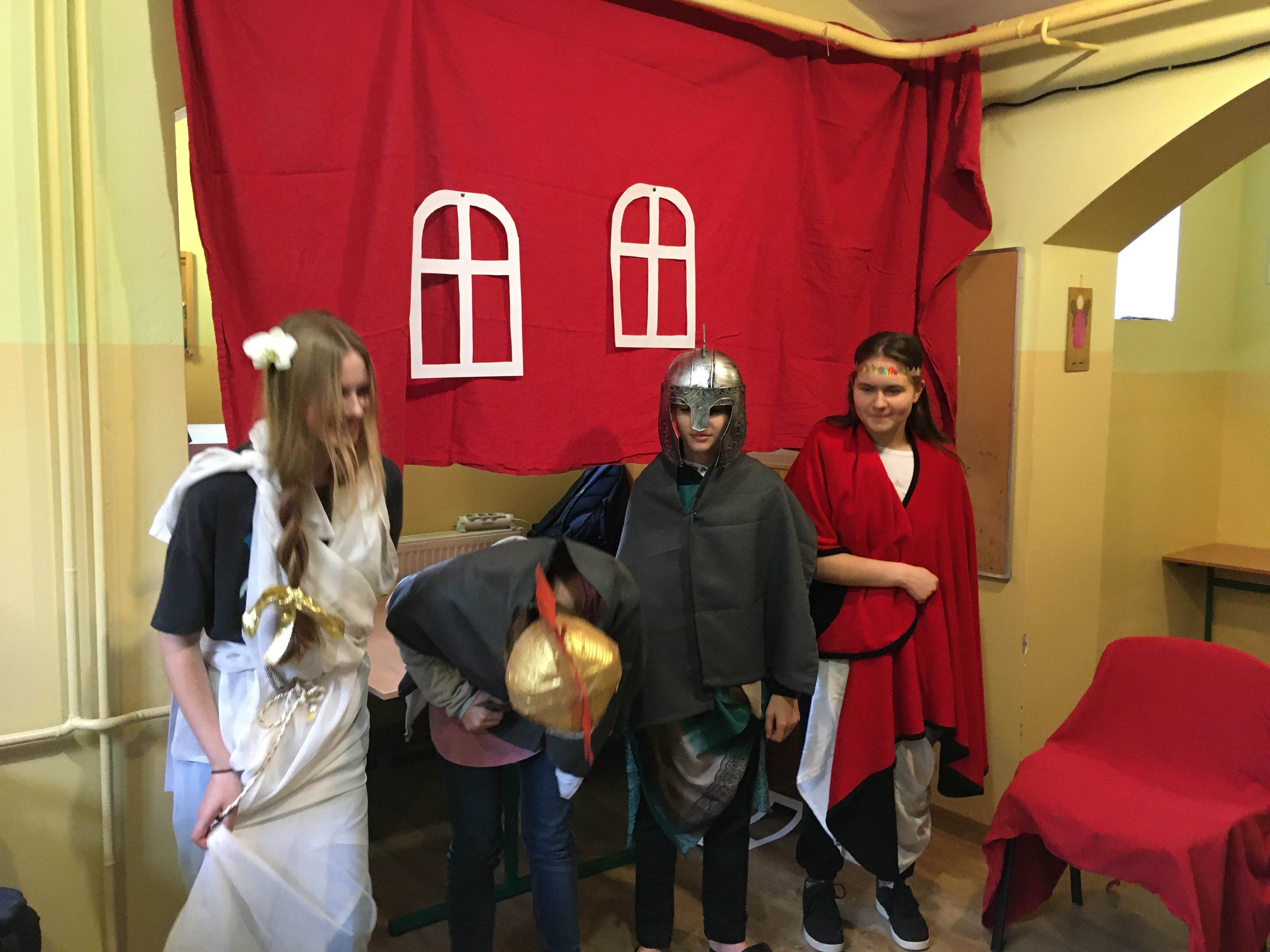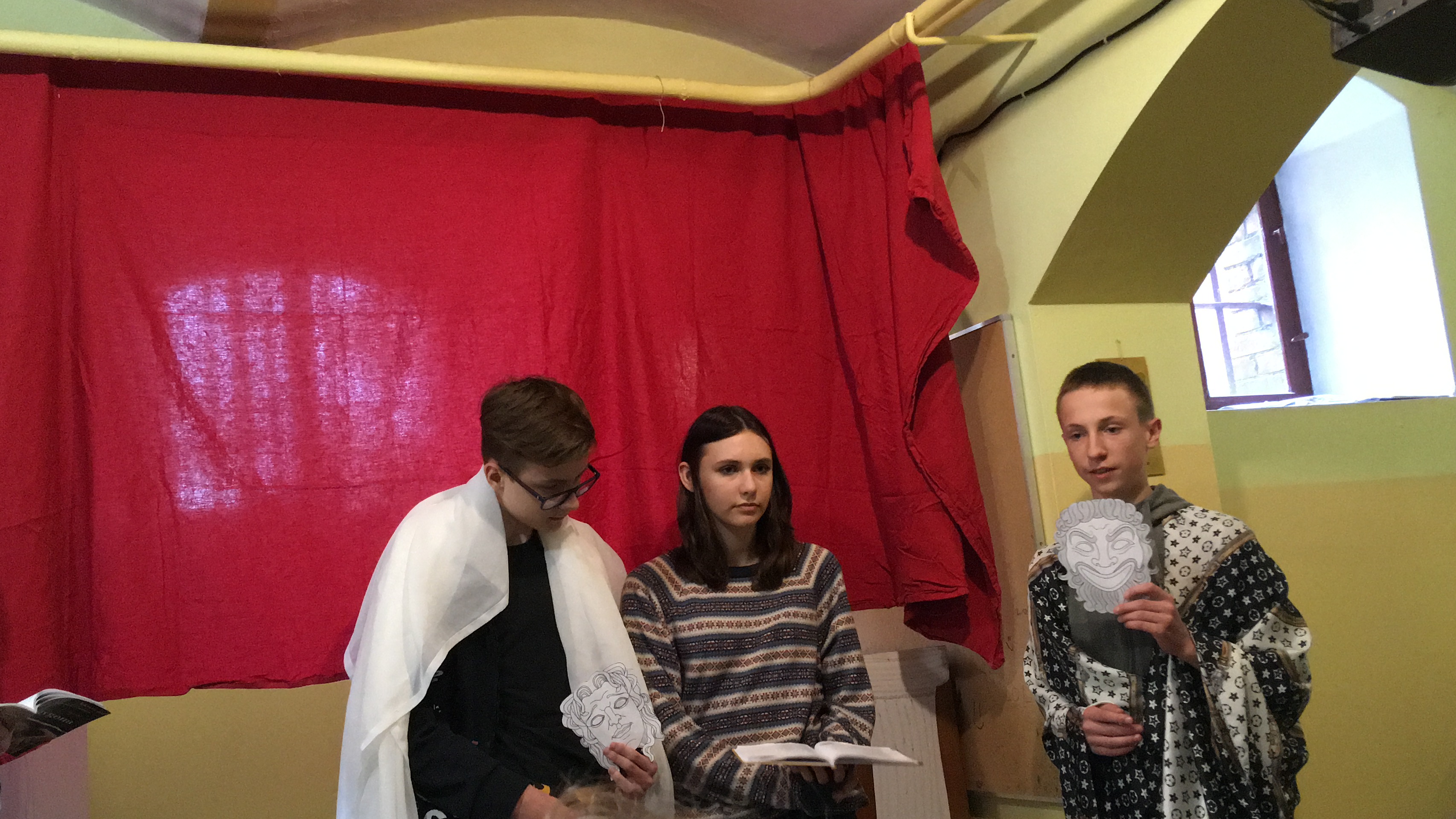 W ubiegły czwartek (27.10.) uczniowie klasy 1 LO prezentowali swoje zdolności teatralne i aktorskie. Ich zadaniem było odegranie wybranej sceny z "Antygony" Sofoklesa, którą klasa jakiś czas temu omawiała na lekcjach.