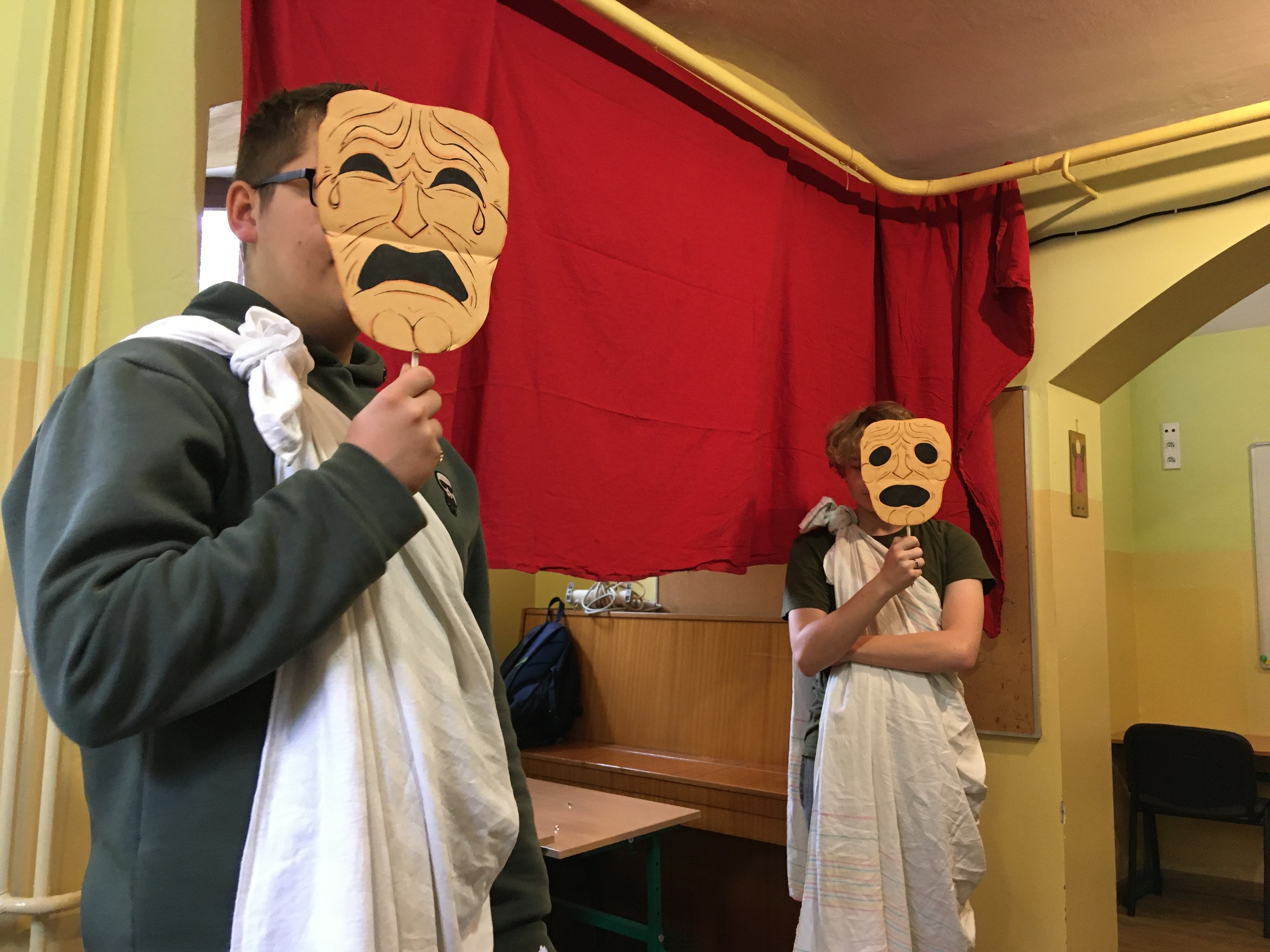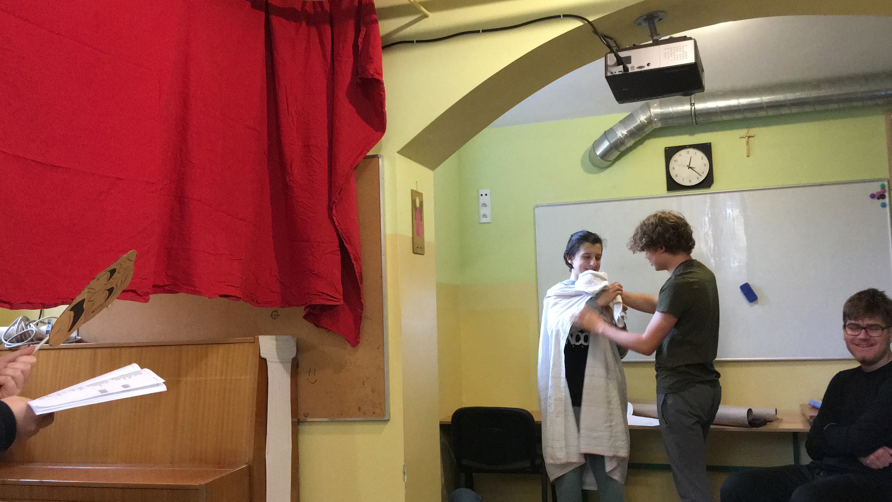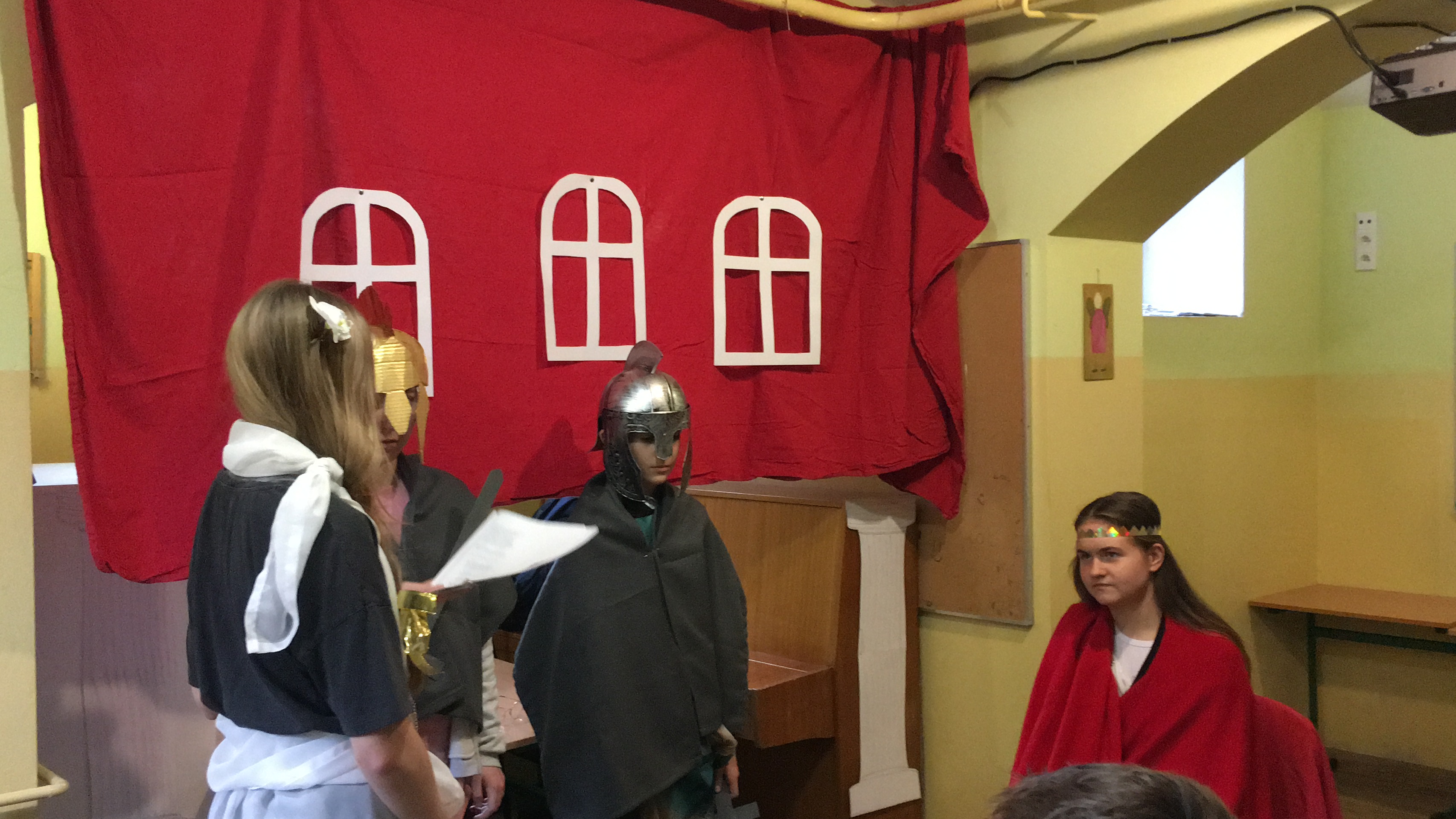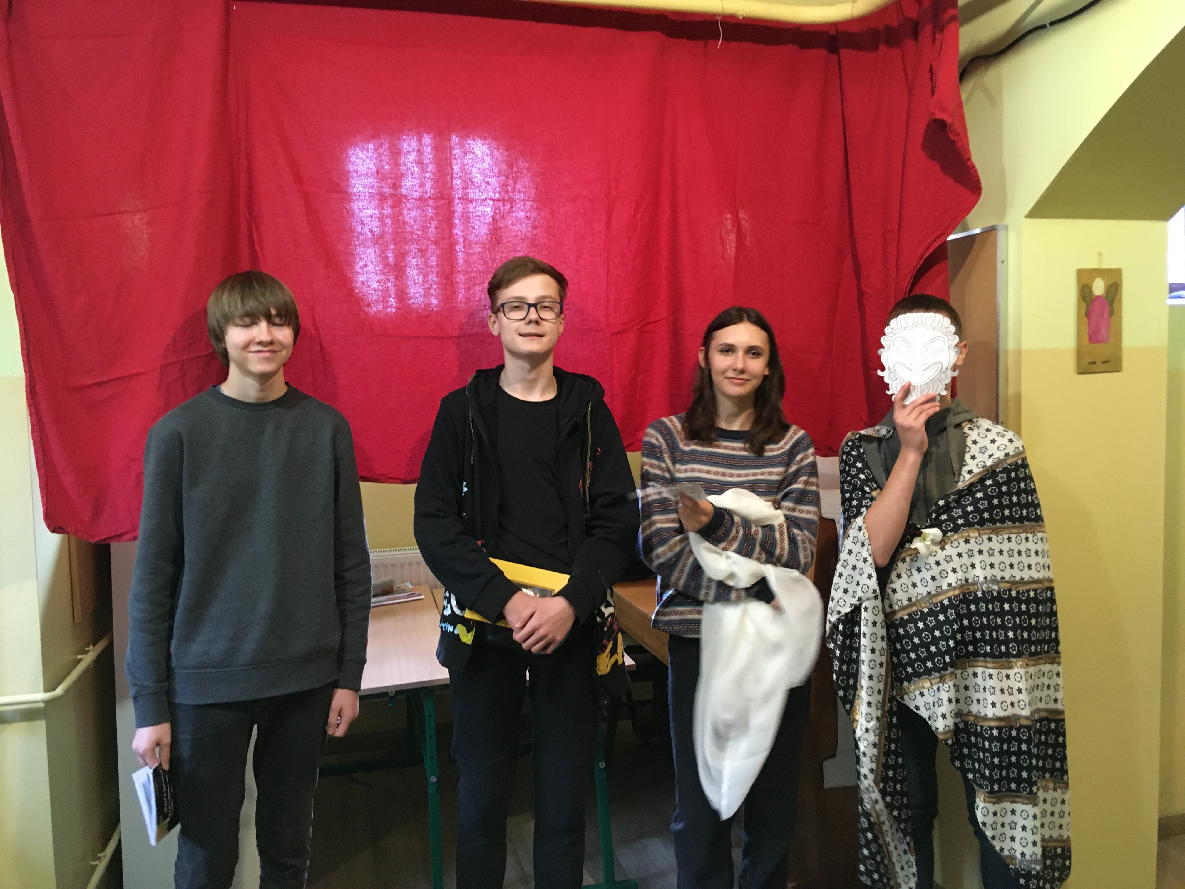 W ubiegły czwartek (27.10.) uczniowie klasy 1 LO prezentowali swoje zdolności teatralne i aktorskie. Ich zadaniem było odegranie wybranej sceny z "Antygony" Sofoklesa, którą klasa jakiś czas temu omawiała na lekcjach.