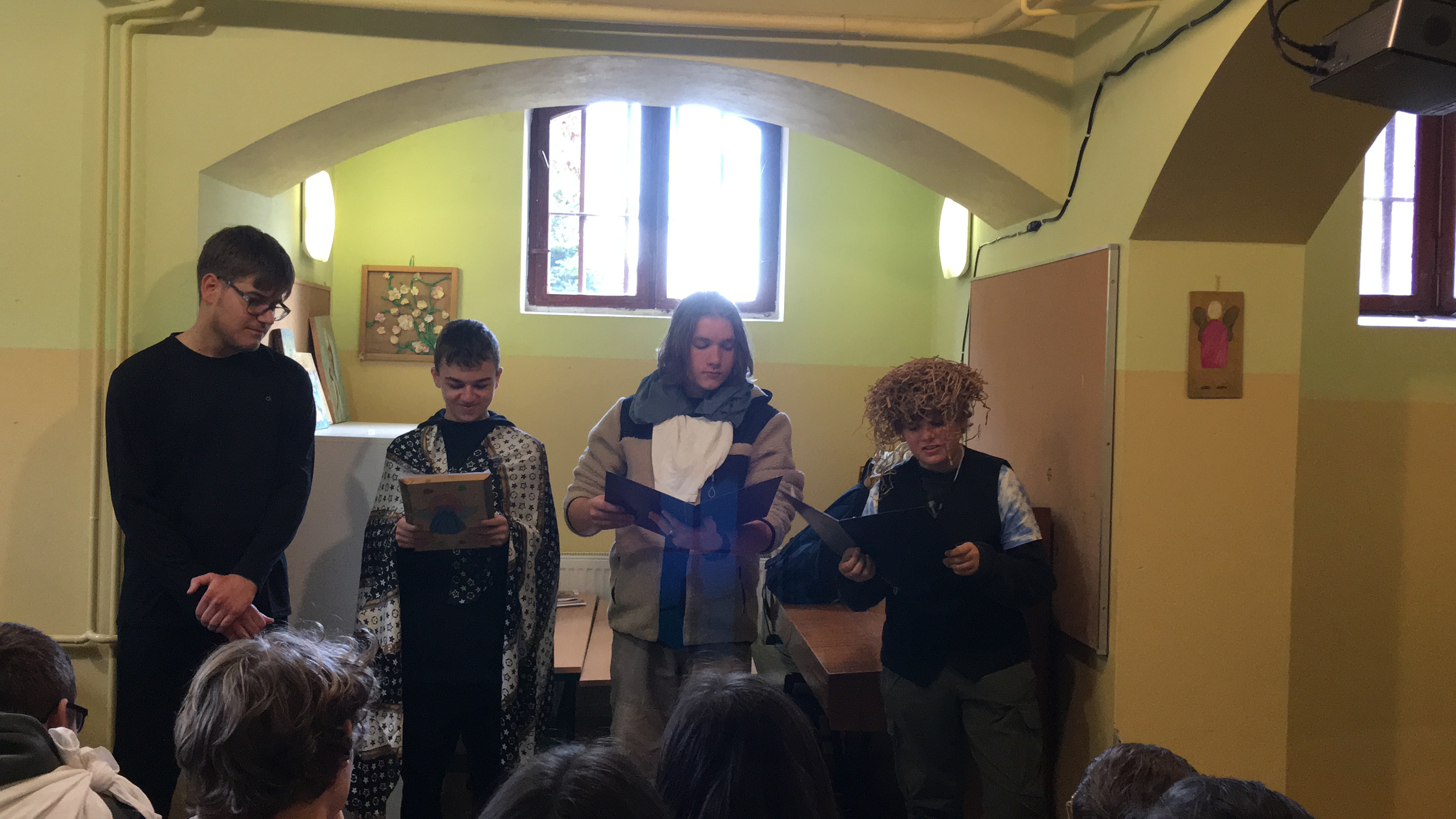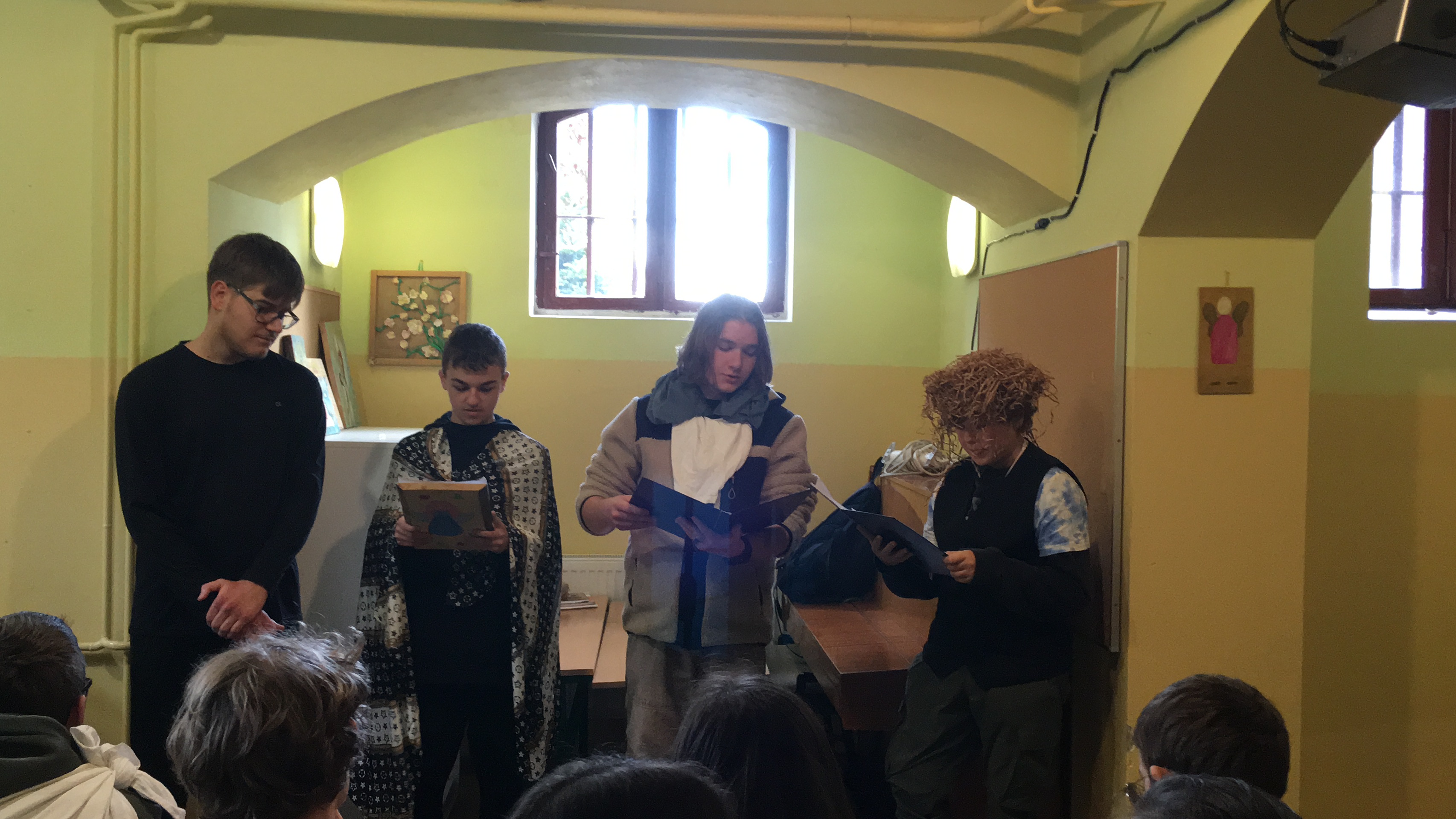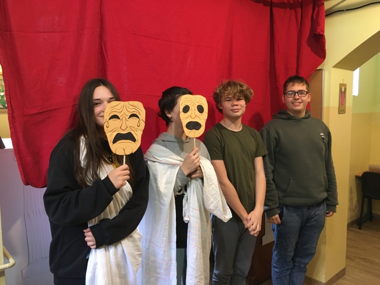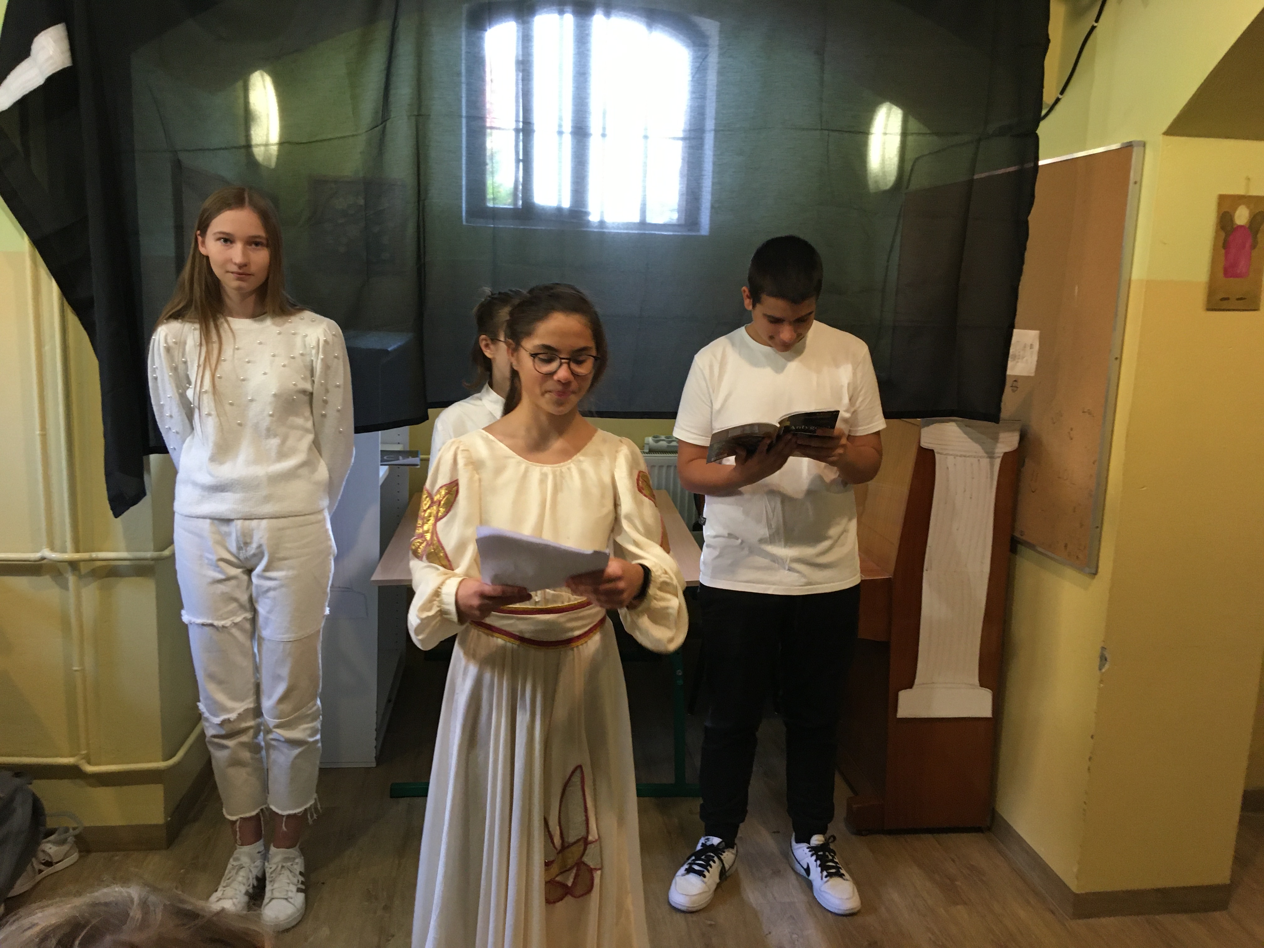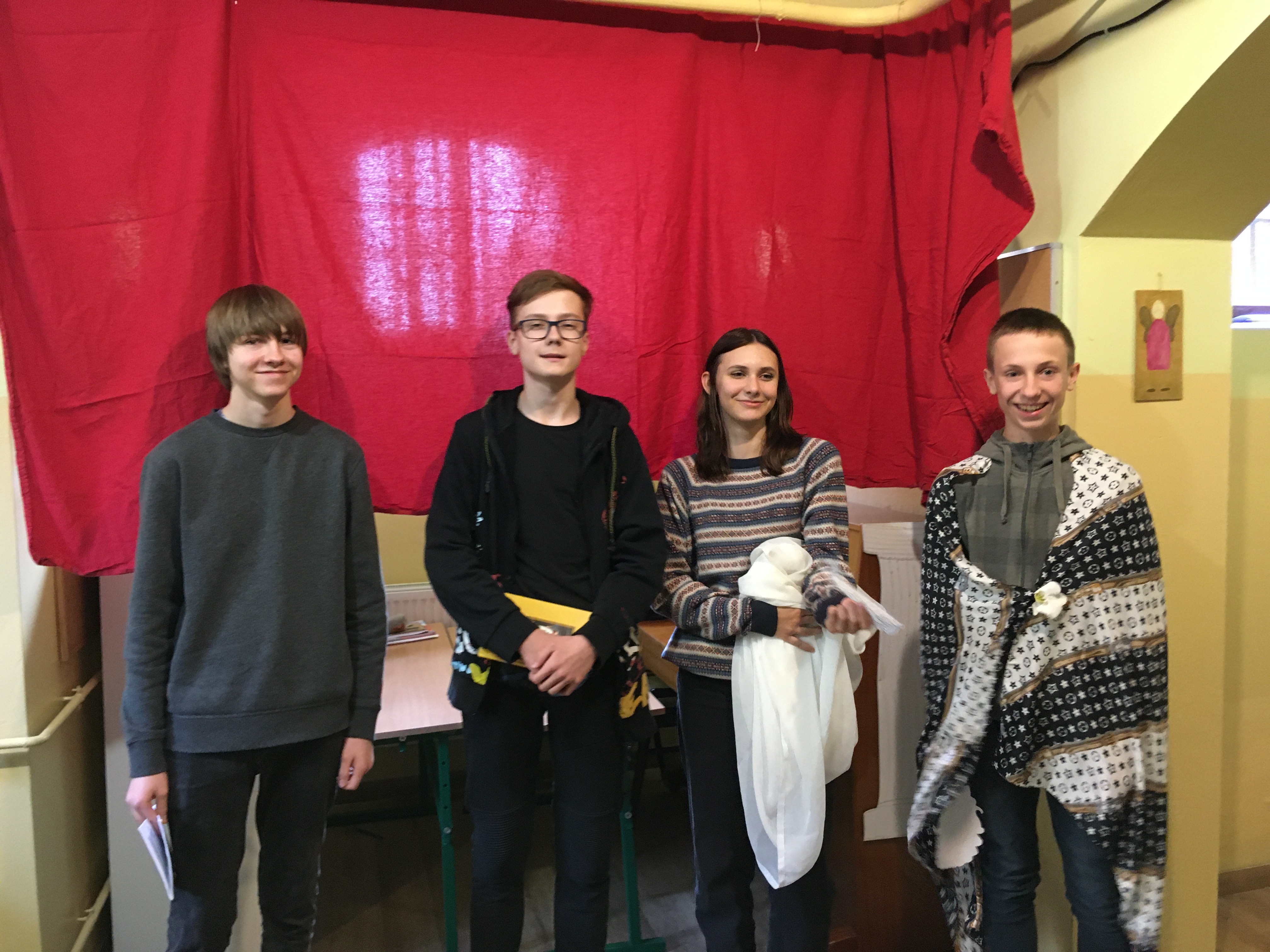 W ubiegły czwartek (27.10.) uczniowie klasy 1 LO prezentowali swoje zdolności teatralne i aktorskie. Ich zadaniem było odegranie wybranej sceny z "Antygony" Sofoklesa, którą klasa jakiś czas temu omawiała na lekcjach.