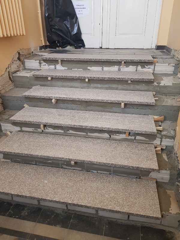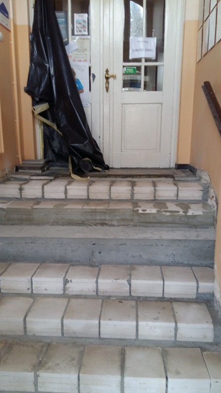 Remont schodów w wejściu do budynku szkoły idzie pełną parą. Stare, nierówne stopnie z lastryko zamieniliśmy na piękny kamień... Już widać zmianę!