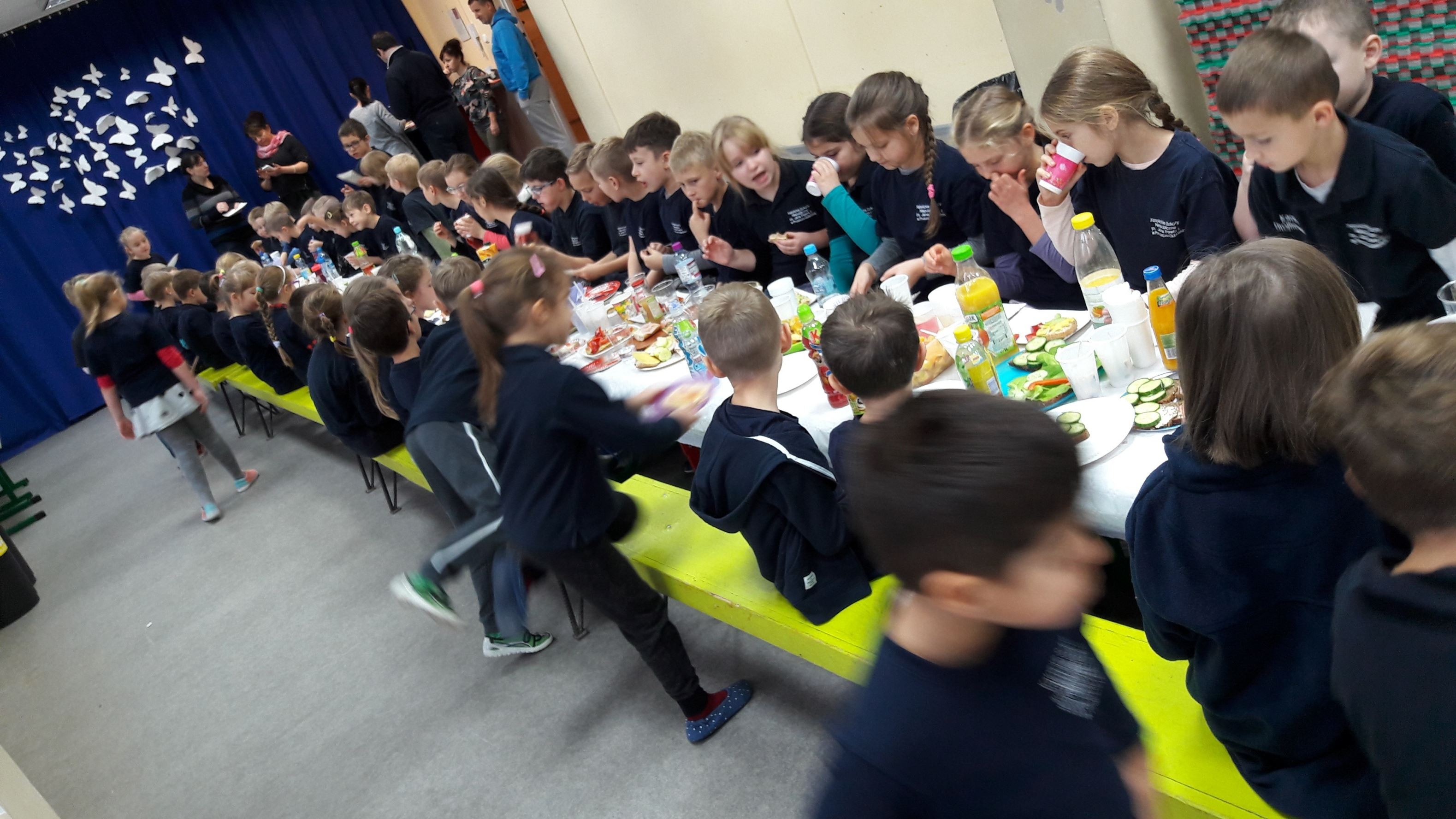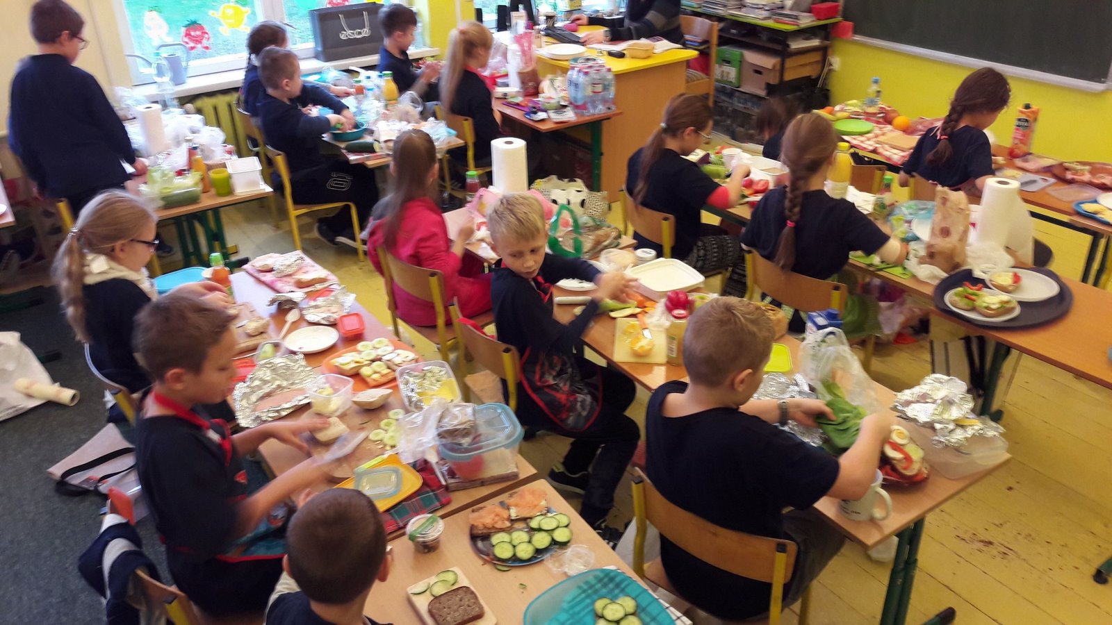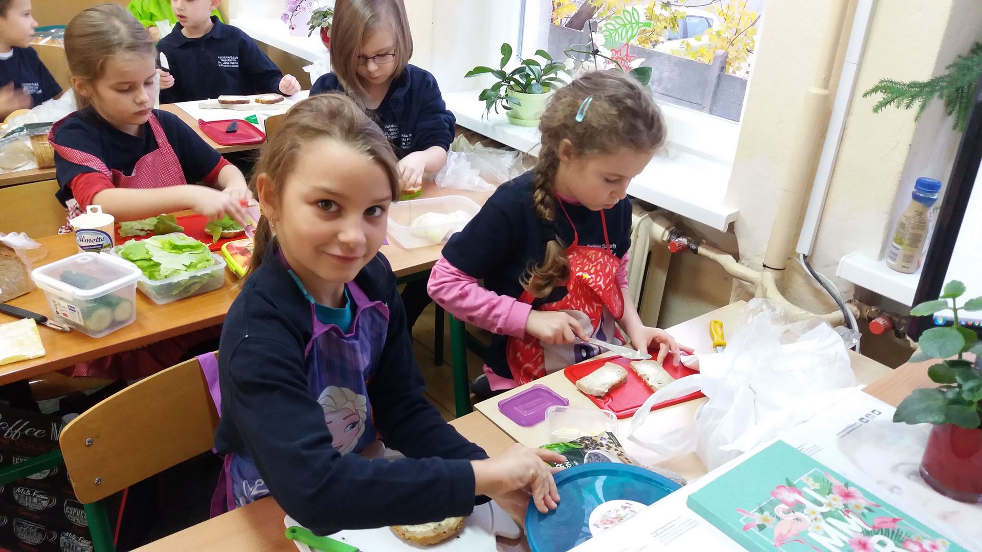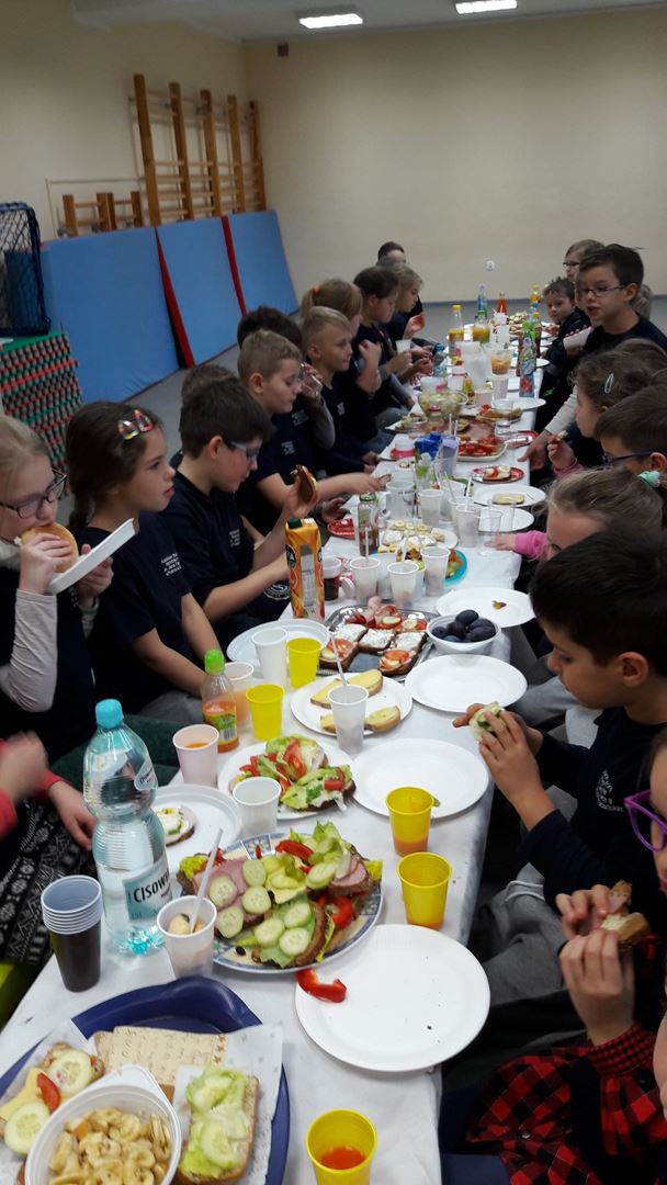 Tego dnia dzieci przyniosły do szkoły wszystko to, co jest niezbędne, aby przygotować „zdrowe śniadanie” tzn. świeże warzywa i owoce, masło, sery, ciemne pieczywo, soki, itp. Pamiętając o higienie i bezpieczeństwie, uczniowie każdej klasy, pod kontrolą swoich wychowawców, przygotowali swoje drugie śniadanie. Były to zdrowe, kolorowe i apetyczne kanapki, sałatki owocowe i koktajle. O godz. 10.00 dzieci klas 0-III przystąpiły do wspólnej degustacji przygotowanych przez siebie zdrowych śniadań. Zrobione własnoręcznie, smakowały wyjątkowo.