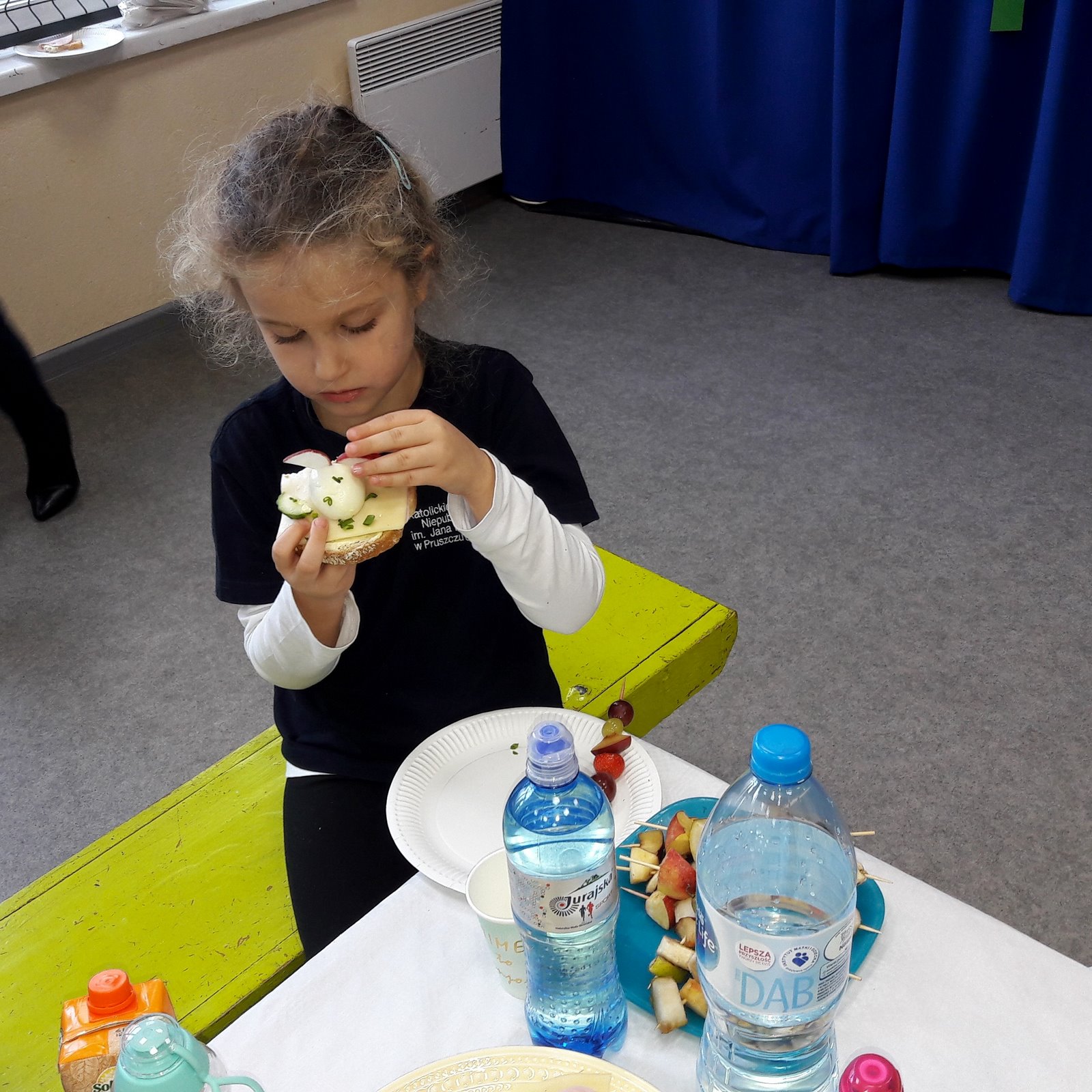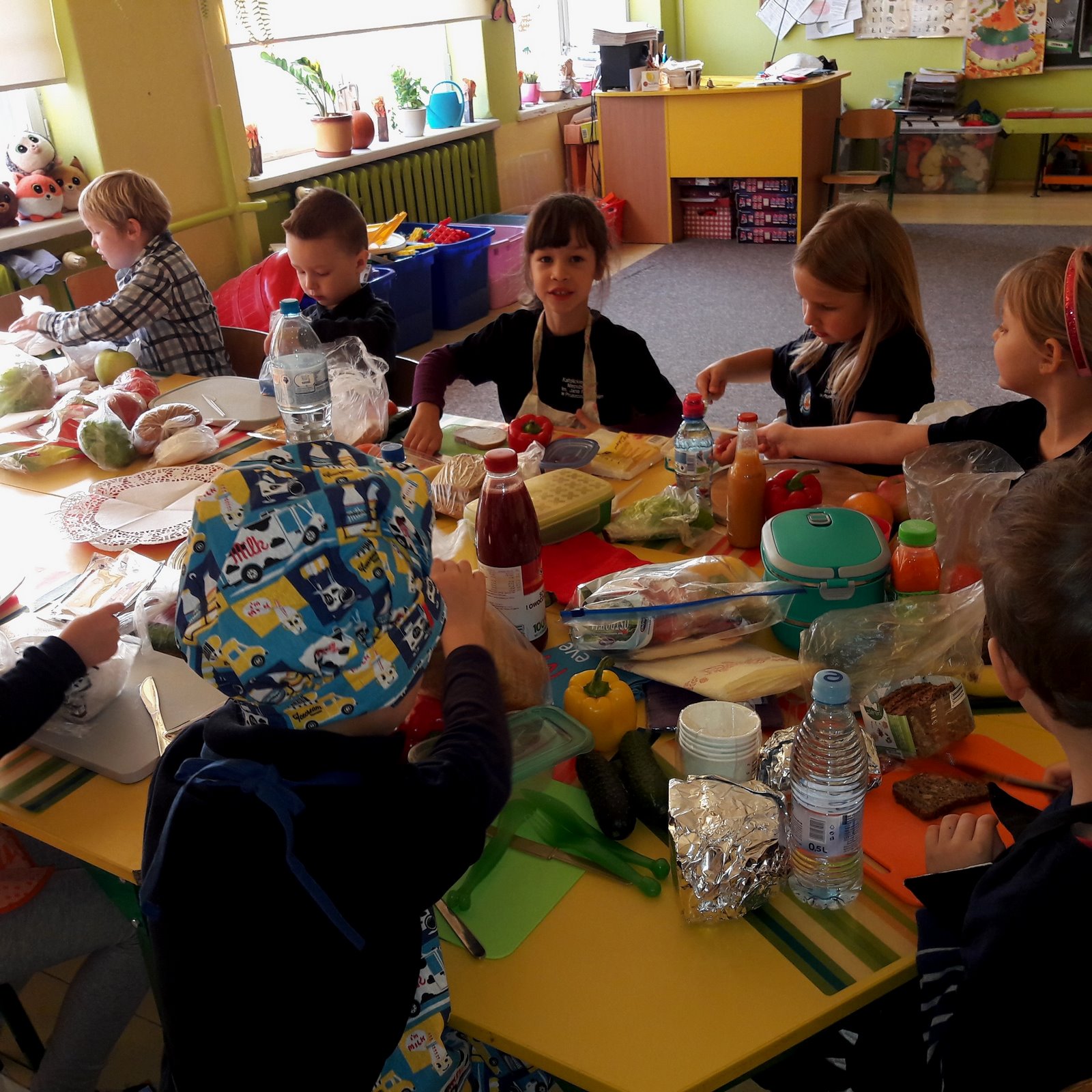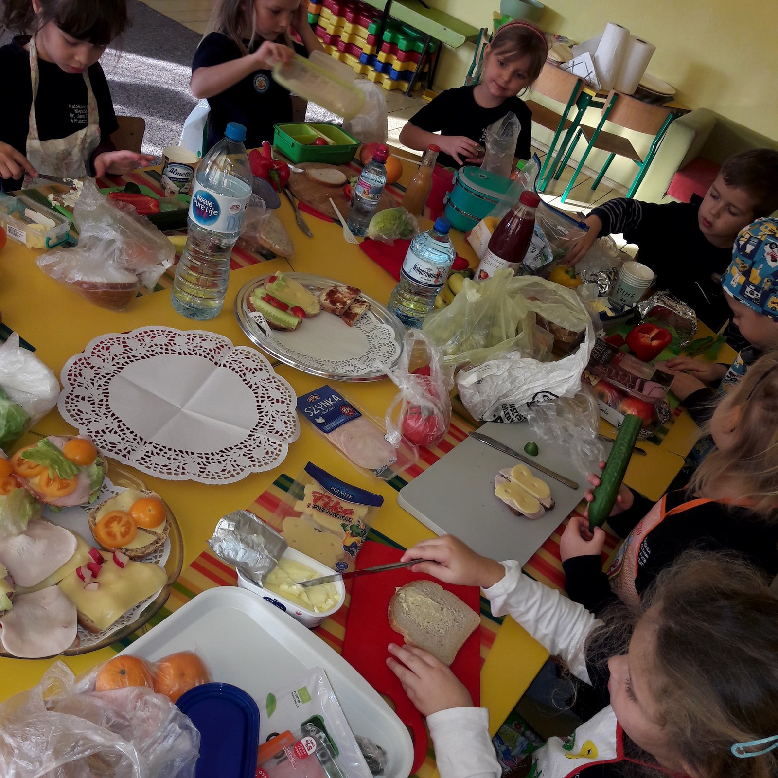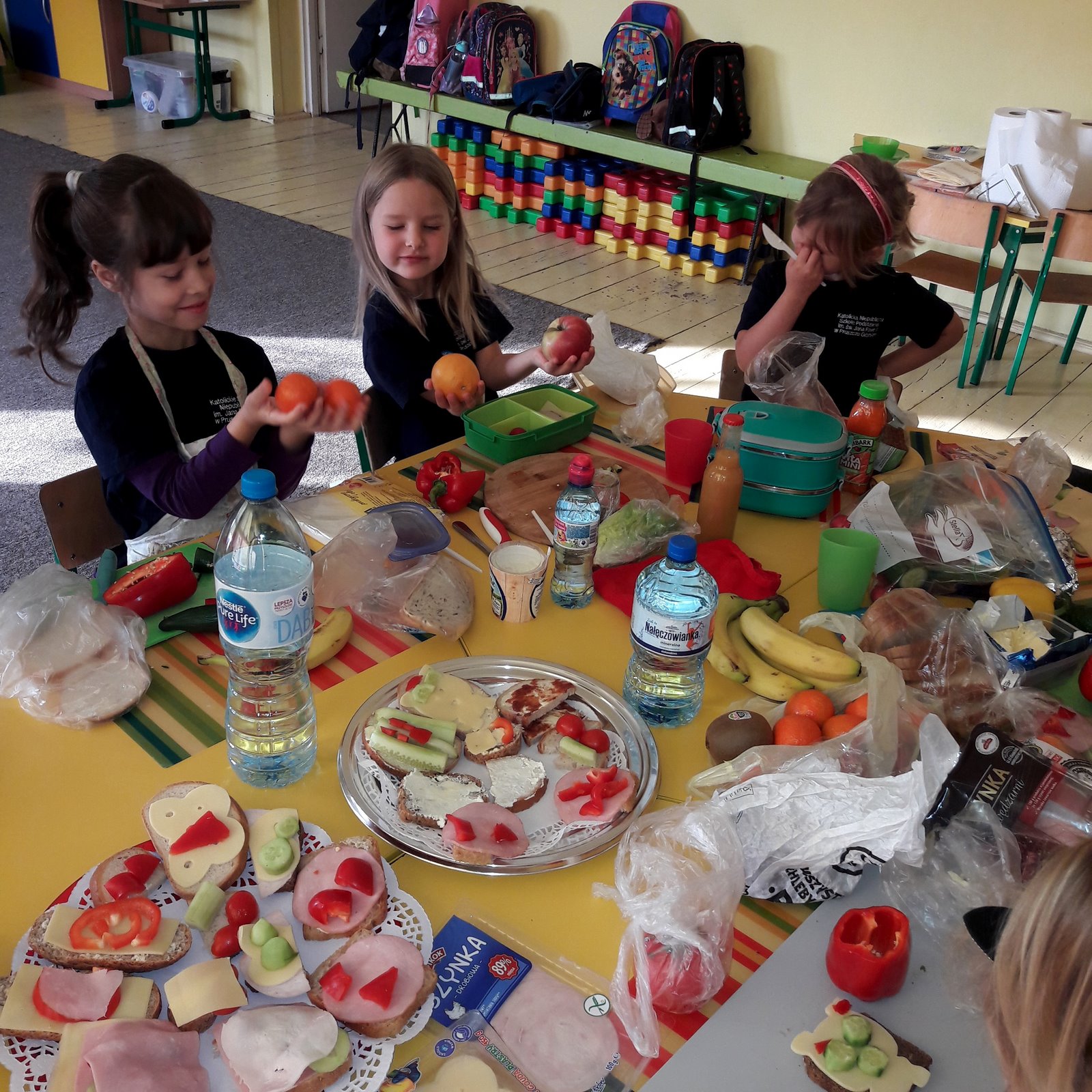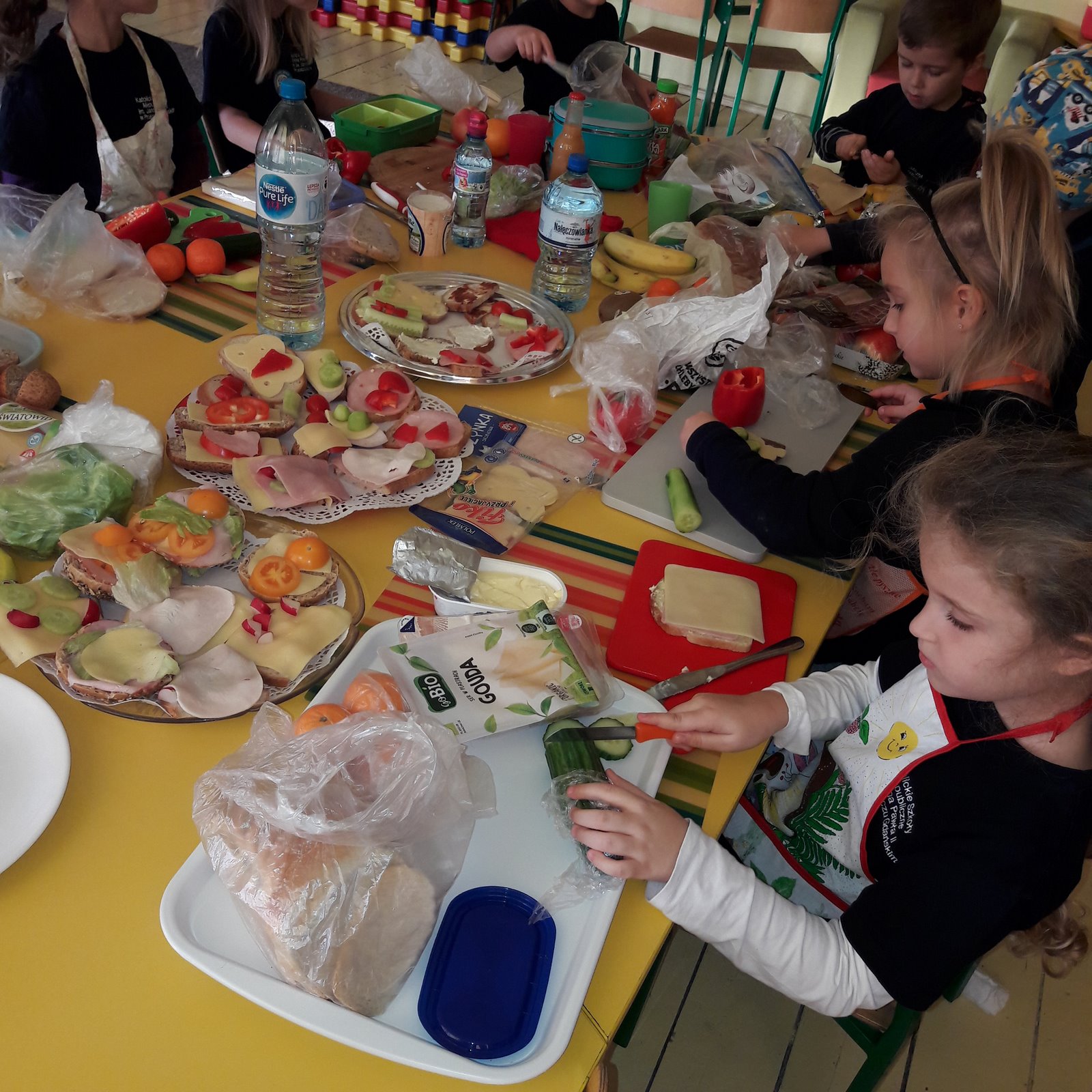 W związku z tym przeprowadzone zostały zajęcia podczas których dzieci dowiedziały się jak zdrowo odżywiać się i jak przygotować najważniejszy posiłek dnia. Zwieńczeniem zajęć było przygotowanie kanapek, które stanowiły wspólny posiłek wszystkich klas na sali gimnastycznej. To był zdrowy i pracowity dzień.