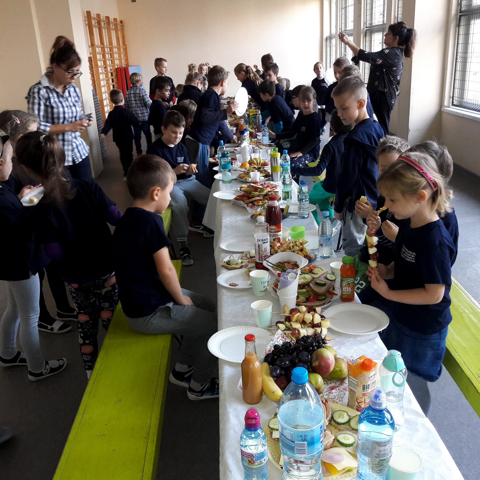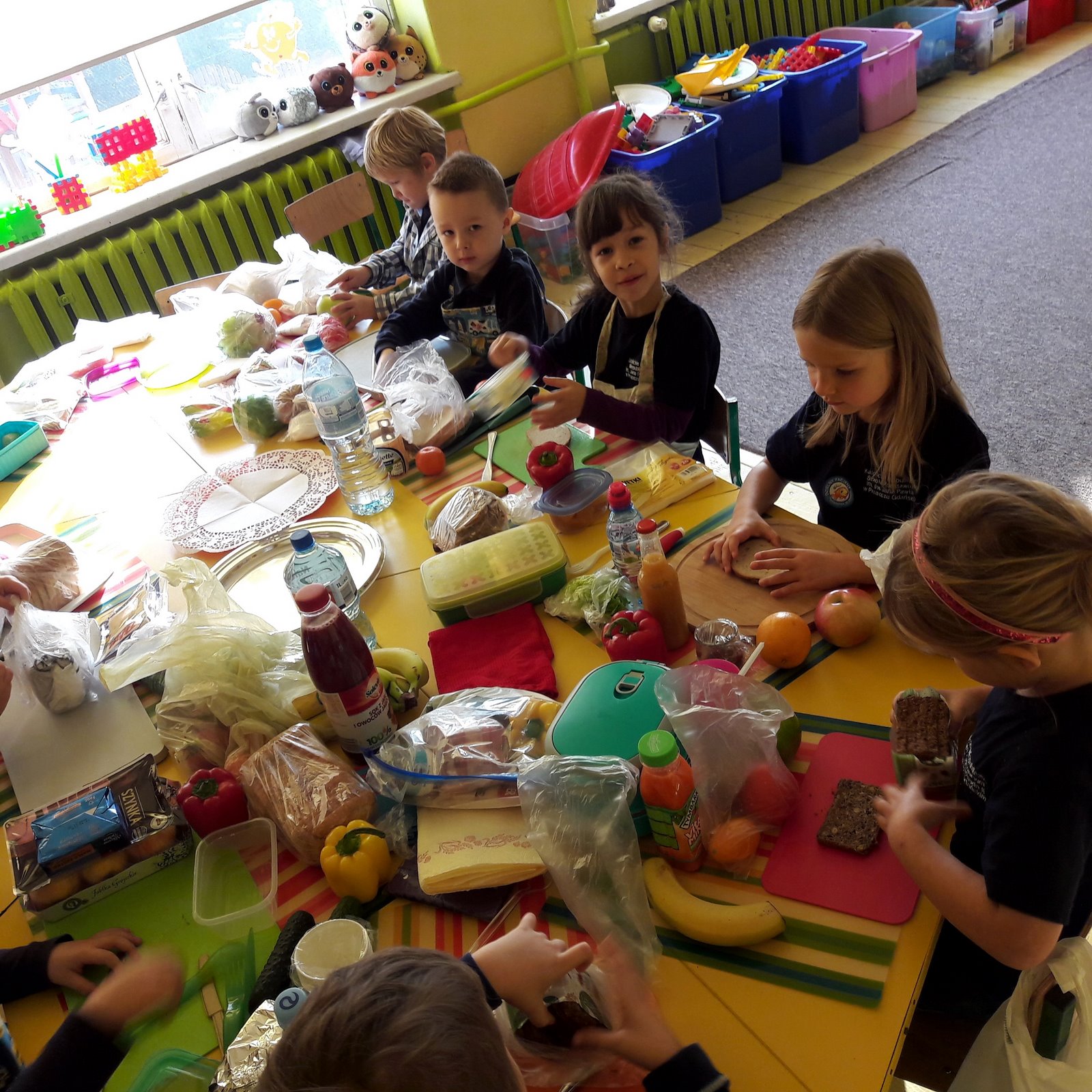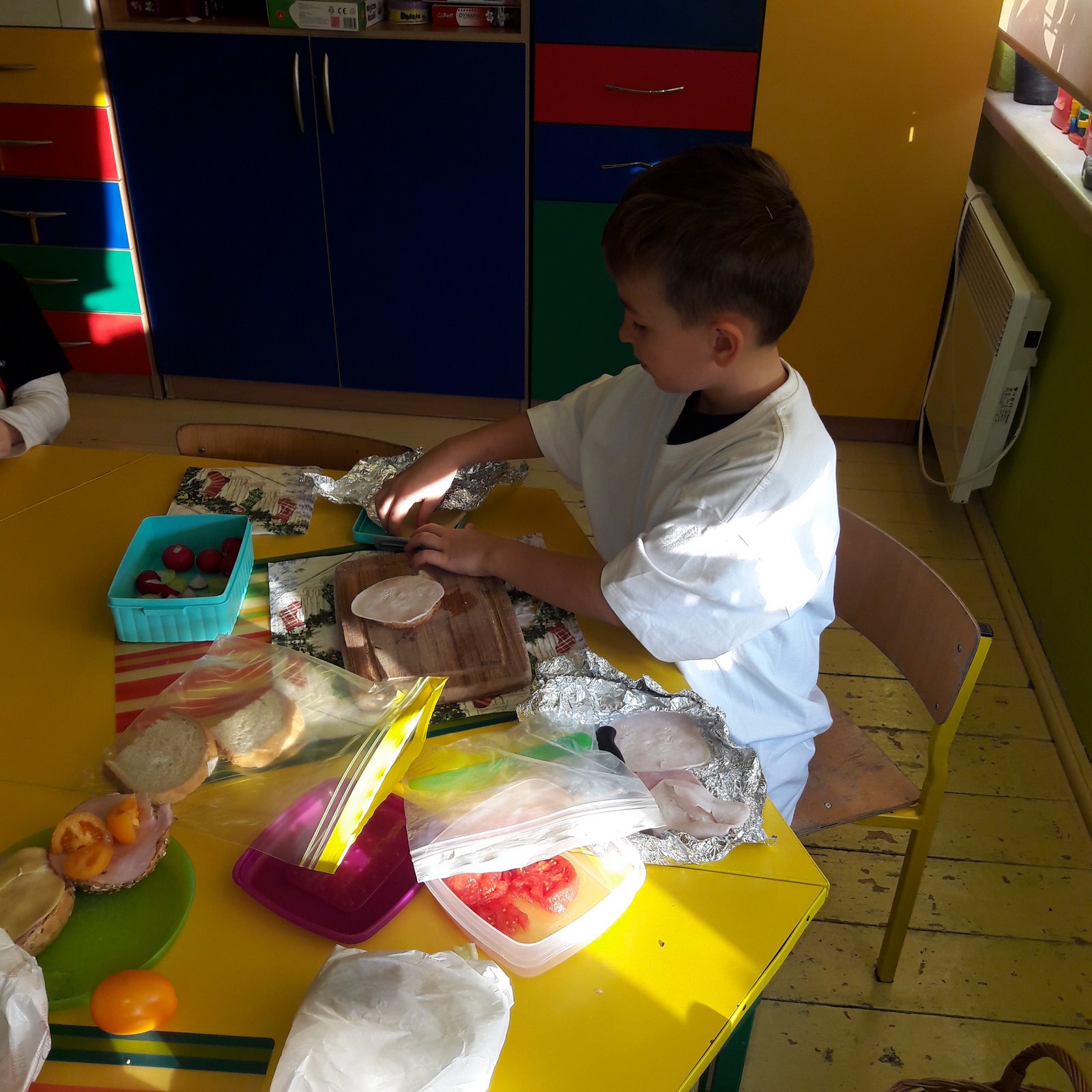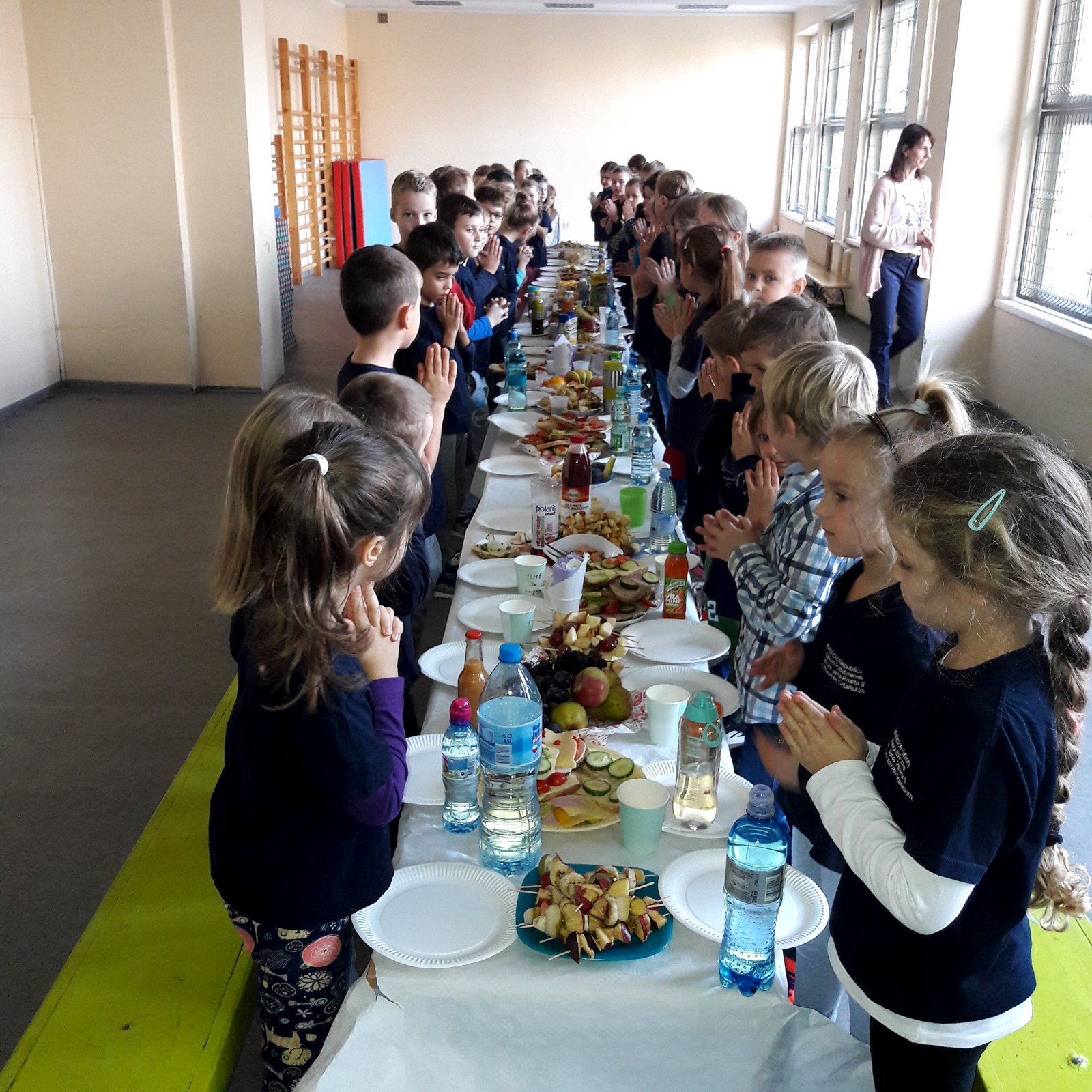 W związku z tym przeprowadzone zostały zajęcia podczas których dzieci dowiedziały się jak zdrowo odżywiać się i jak przygotować najważniejszy posiłek dnia. Zwieńczeniem zajęć było przygotowanie kanapek, które stanowiły wspólny posiłek wszystkich klas na sali gimnastycznej. To był zdrowy i pracowity dzień.