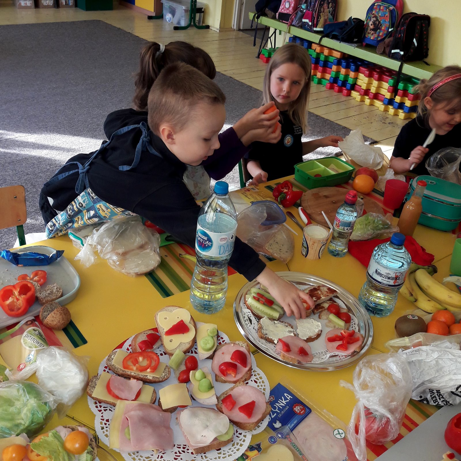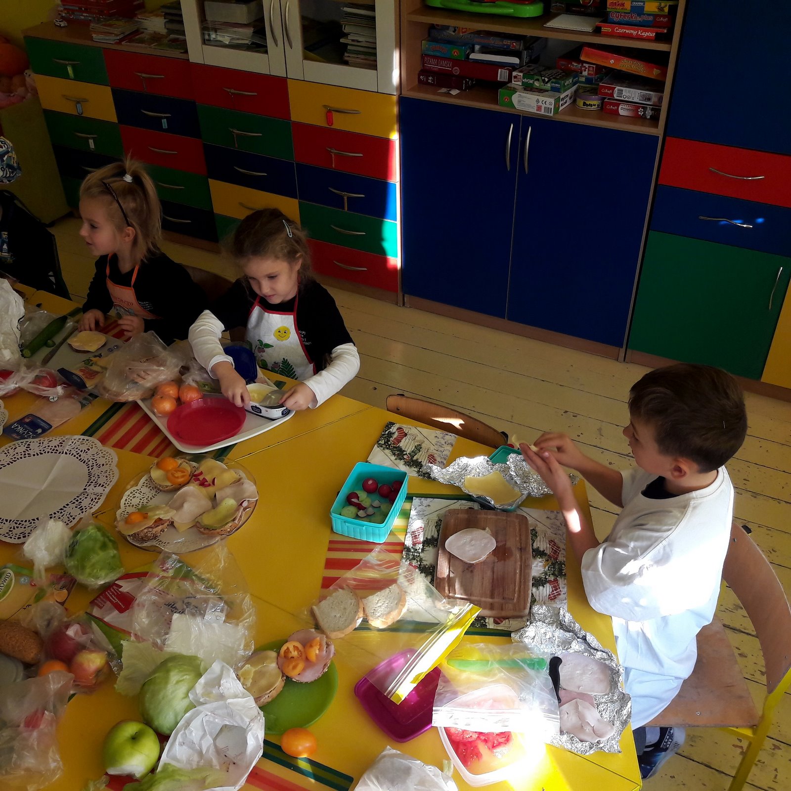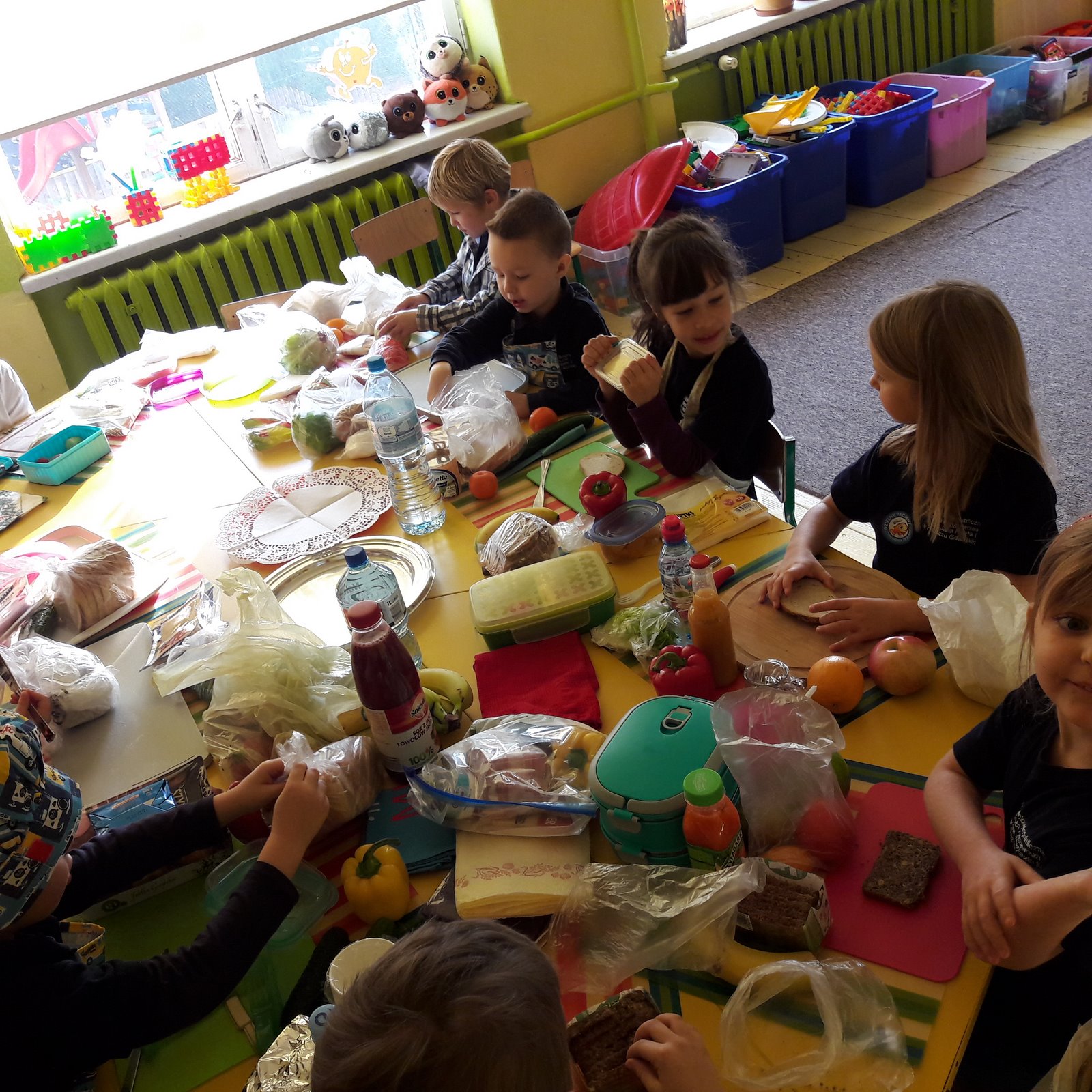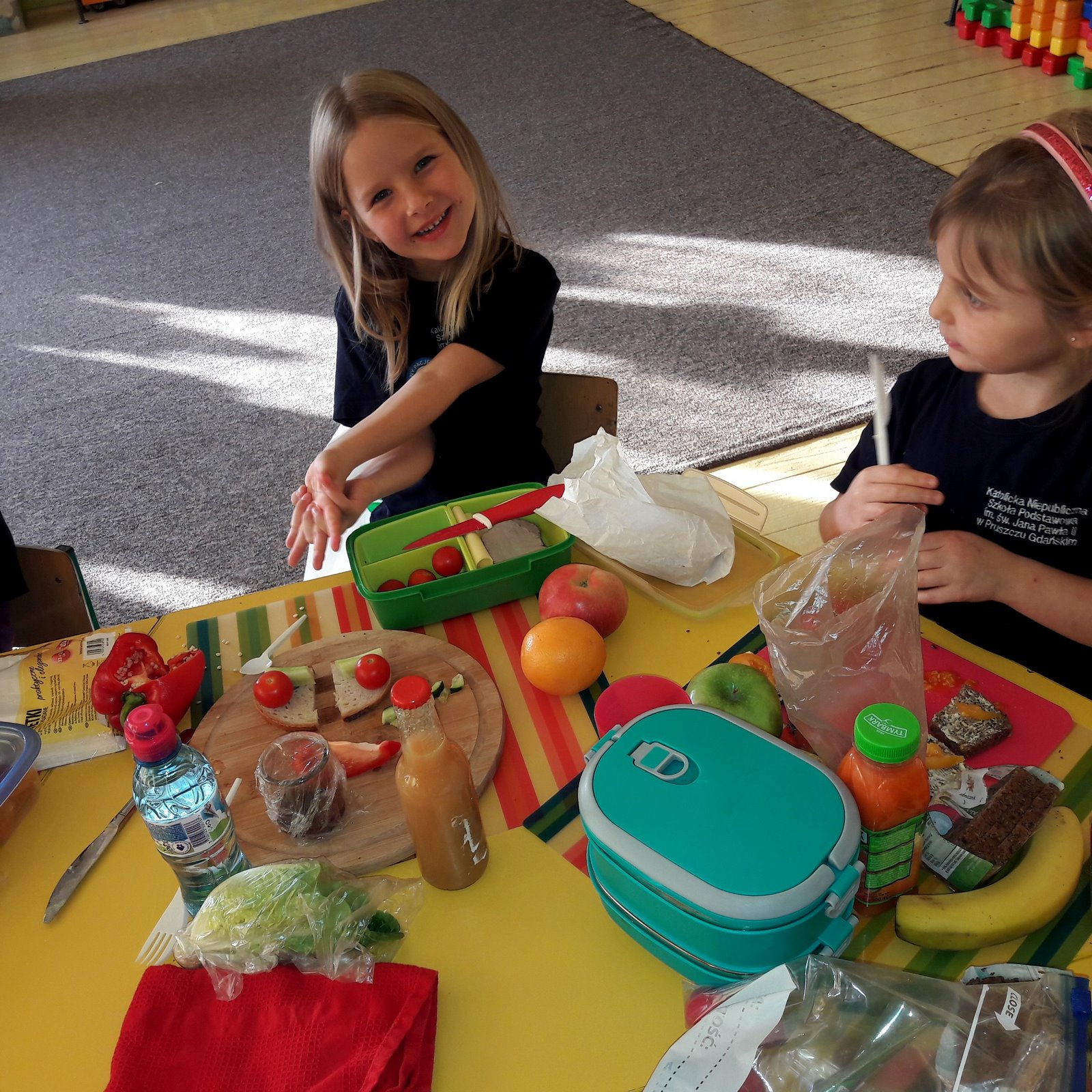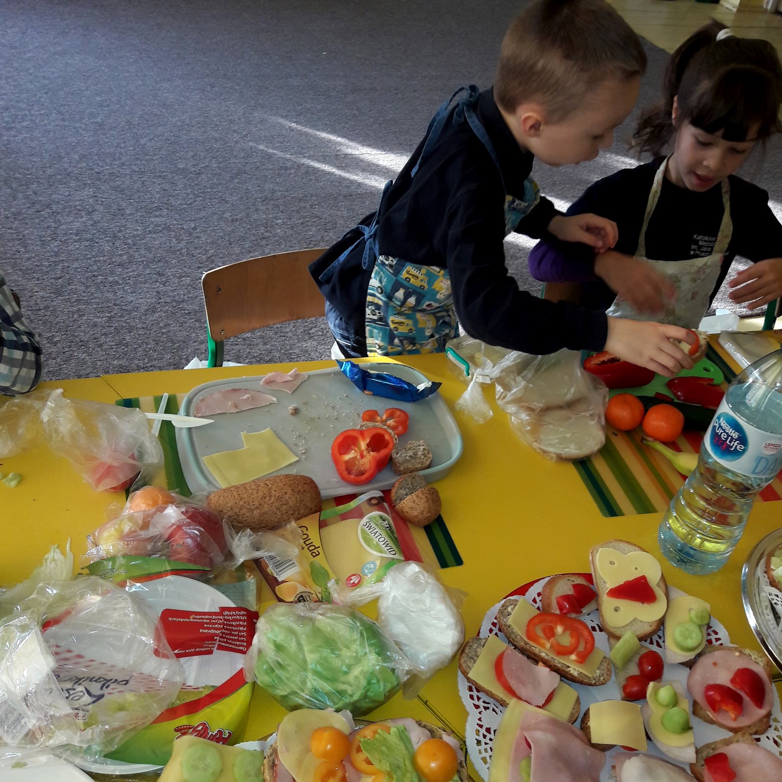 W związku z tym przeprowadzone zostały zajęcia podczas których dzieci dowiedziały się jak zdrowo odżywiać się i jak przygotować najważniejszy posiłek dnia. Zwieńczeniem zajęć było przygotowanie kanapek, które stanowiły wspólny posiłek wszystkich klas na sali gimnastycznej. To był zdrowy i pracowity dzień.