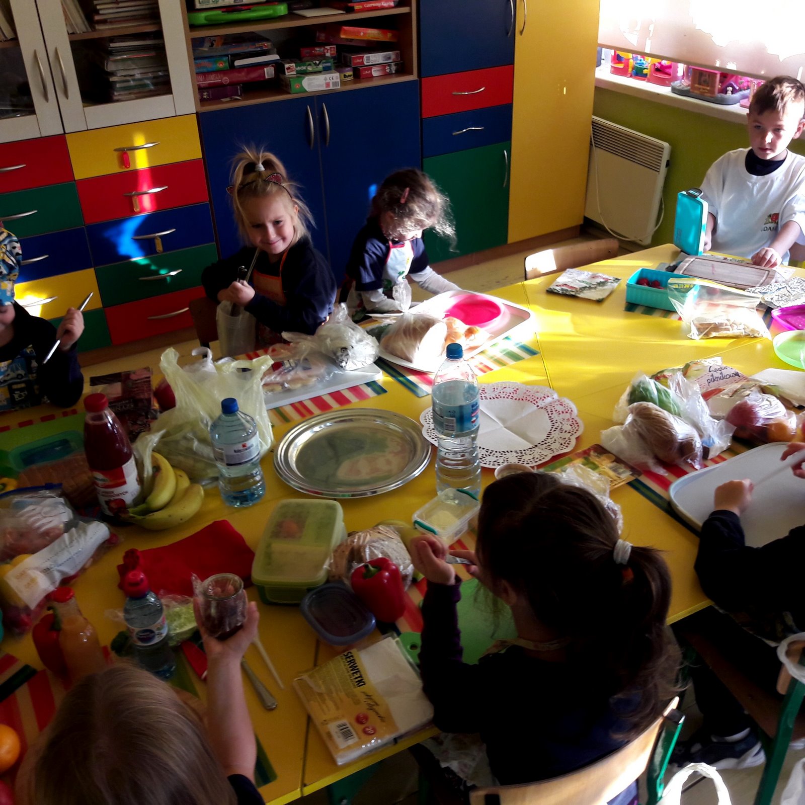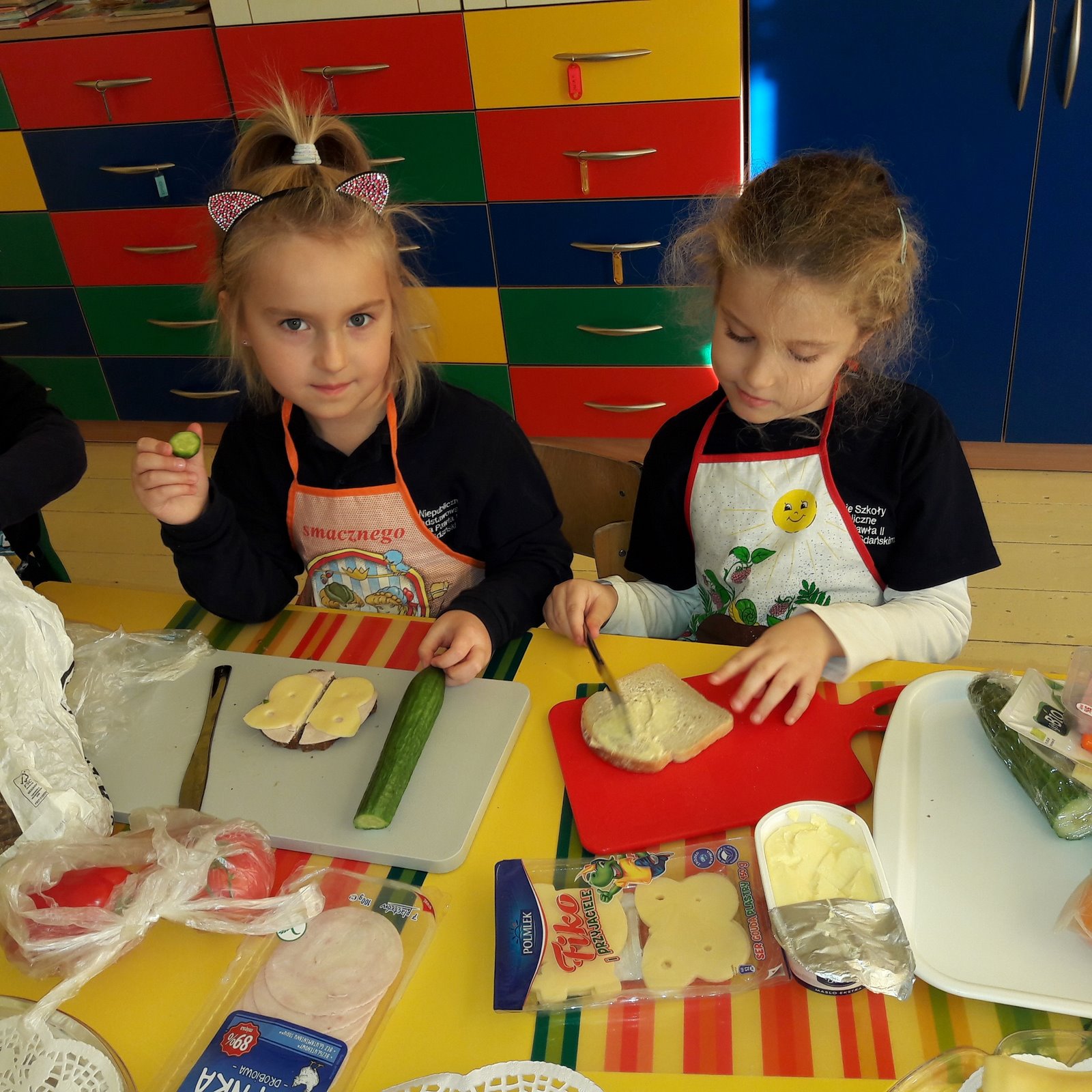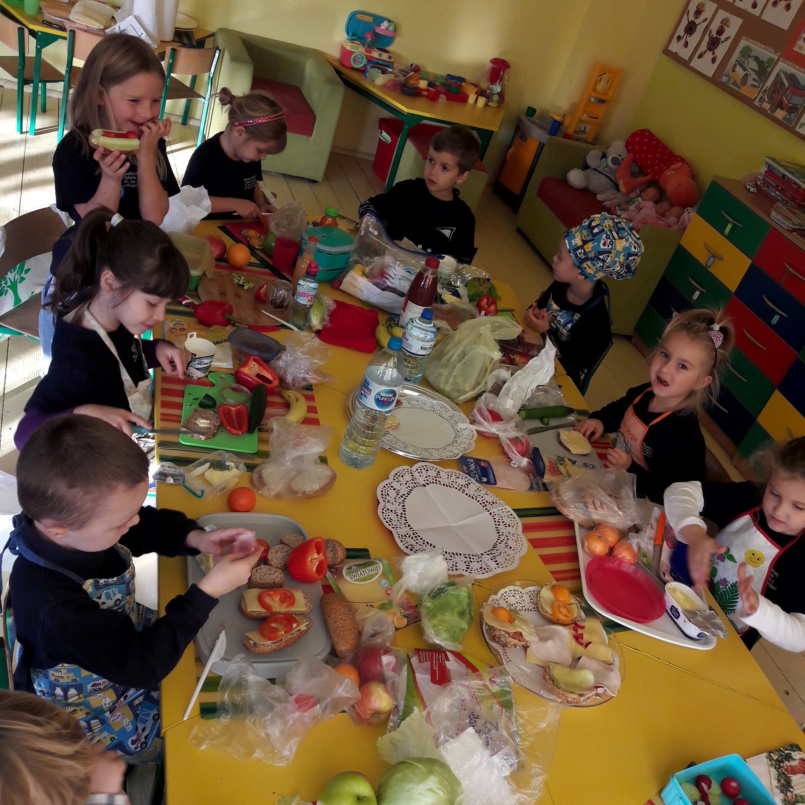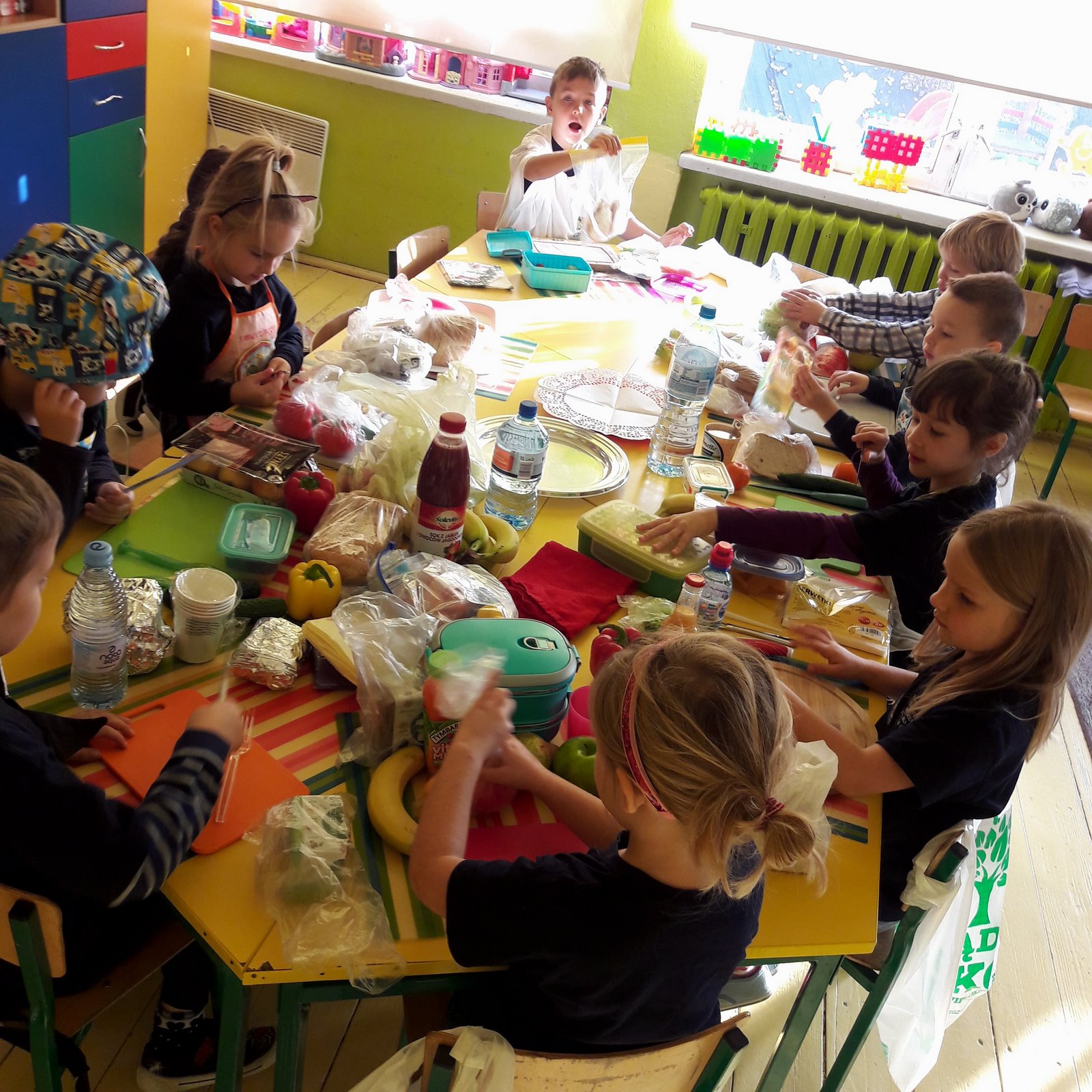 W związku z tym przeprowadzone zostały zajęcia podczas których dzieci dowiedziały się jak zdrowo odżywiać się i jak przygotować najważniejszy posiłek dnia. Zwieńczeniem zajęć było przygotowanie kanapek, które stanowiły wspólny posiłek wszystkich klas na sali gimnastycznej. To był zdrowy i pracowity dzień.