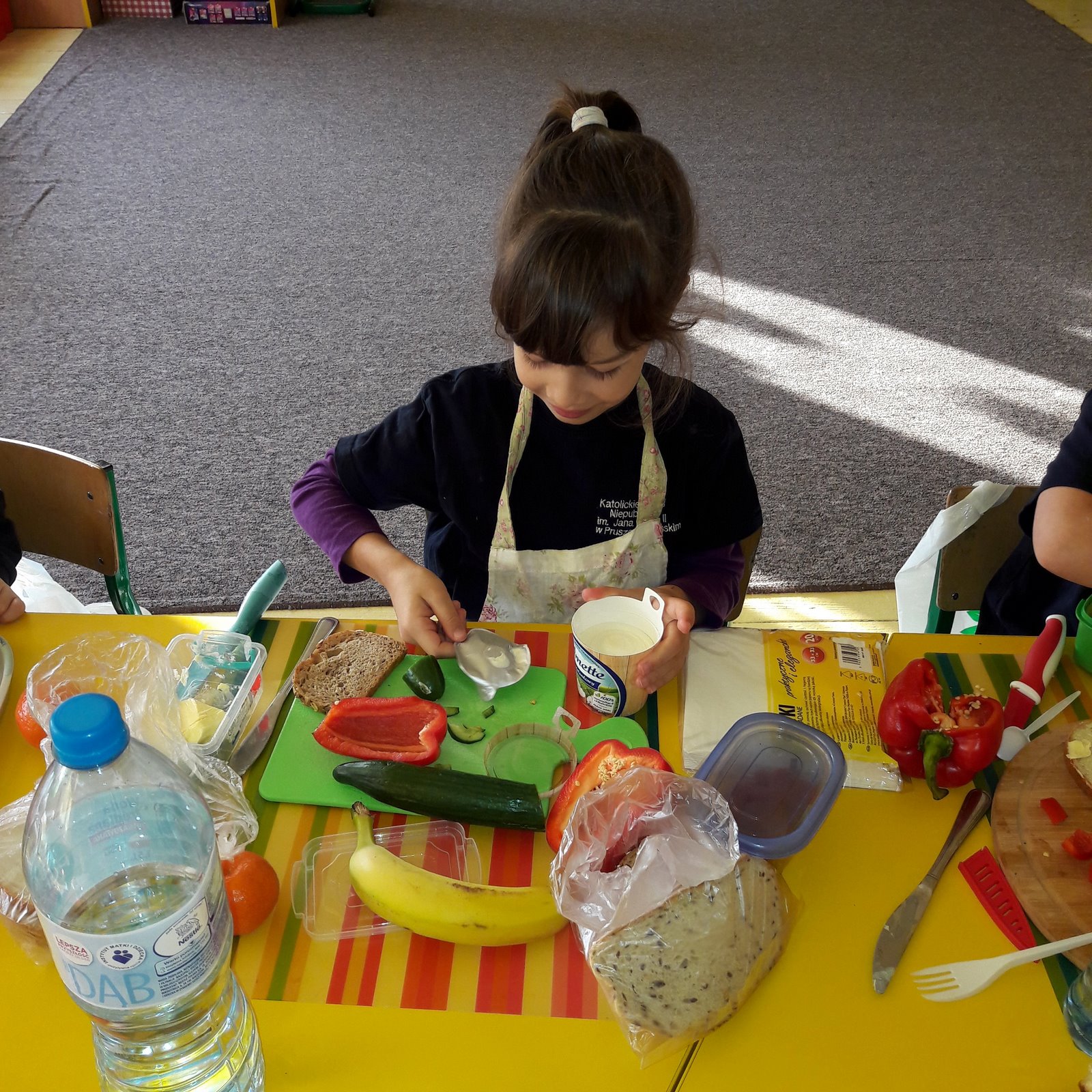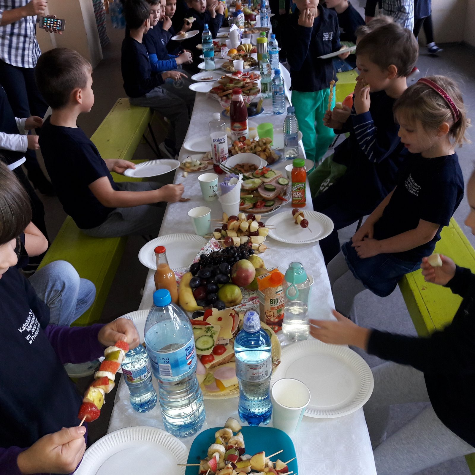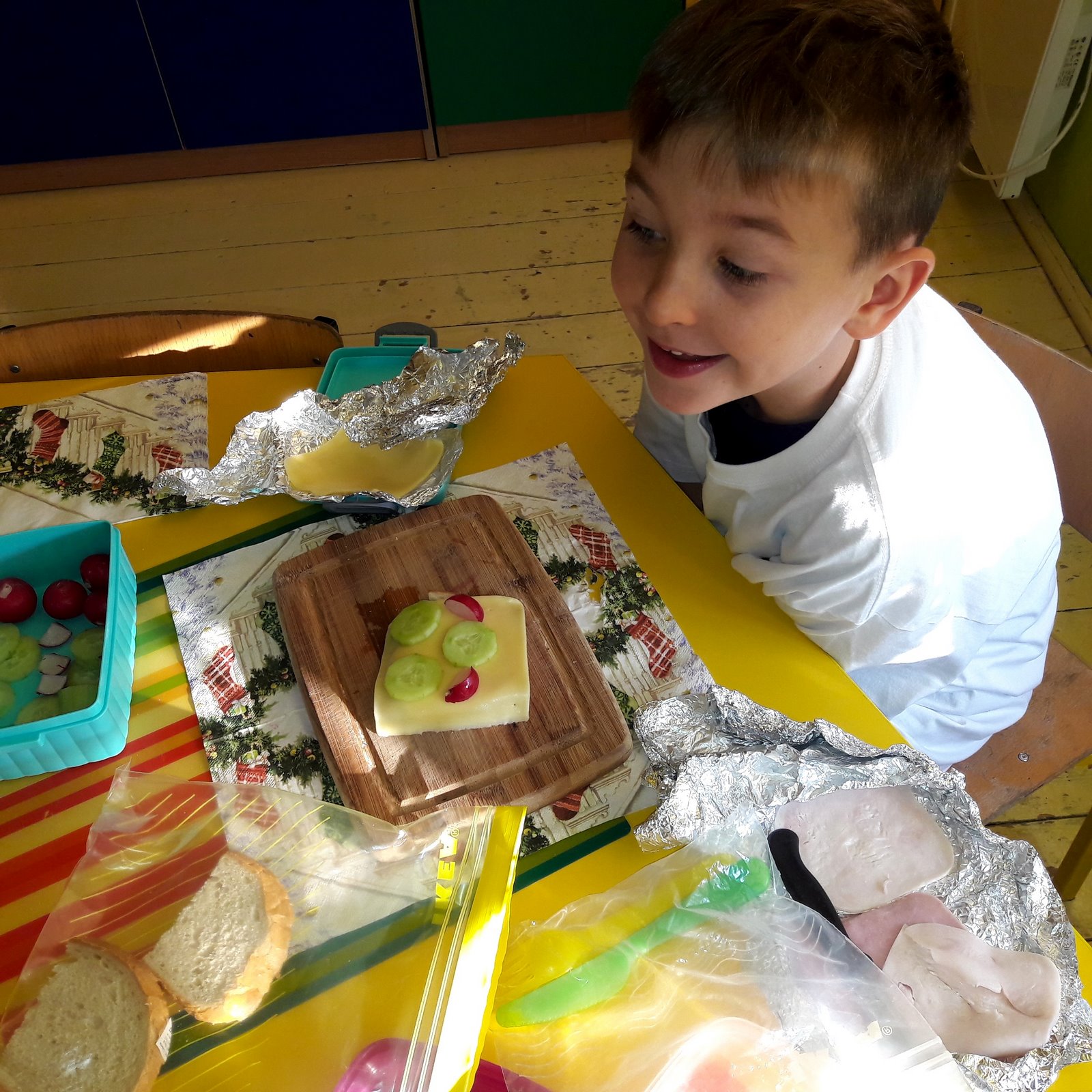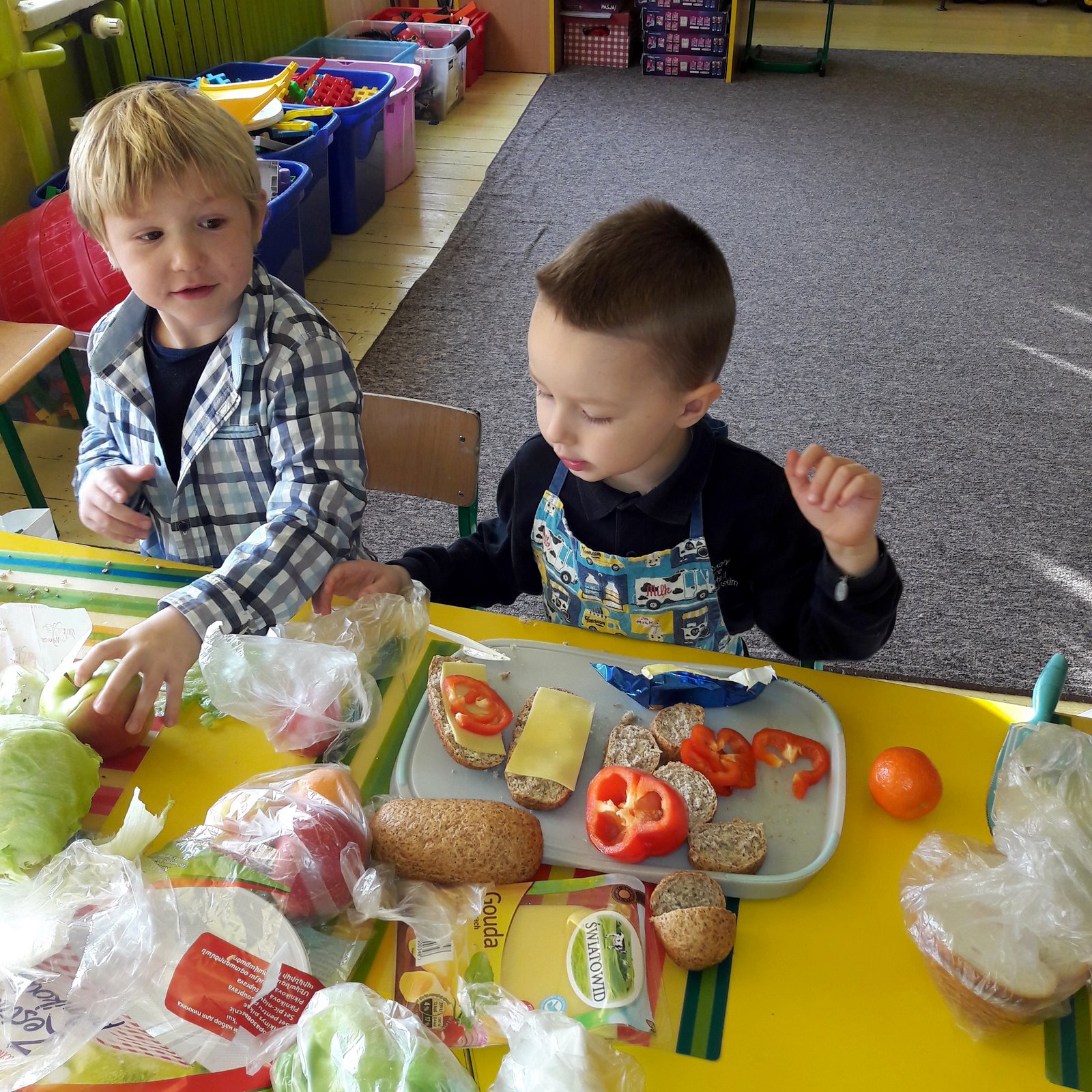 W związku z tym przeprowadzone zostały zajęcia podczas których dzieci dowiedziały się jak zdrowo odżywiać się i jak przygotować najważniejszy posiłek dnia. Zwieńczeniem zajęć było przygotowanie kanapek, które stanowiły wspólny posiłek wszystkich klas na sali gimnastycznej. To był zdrowy i pracowity dzień.