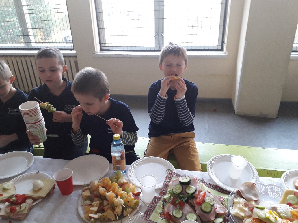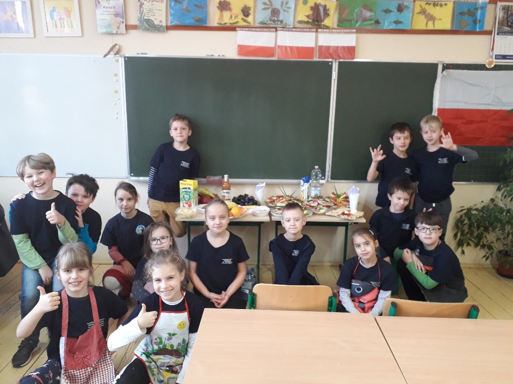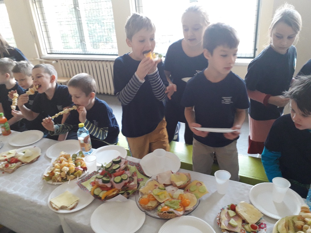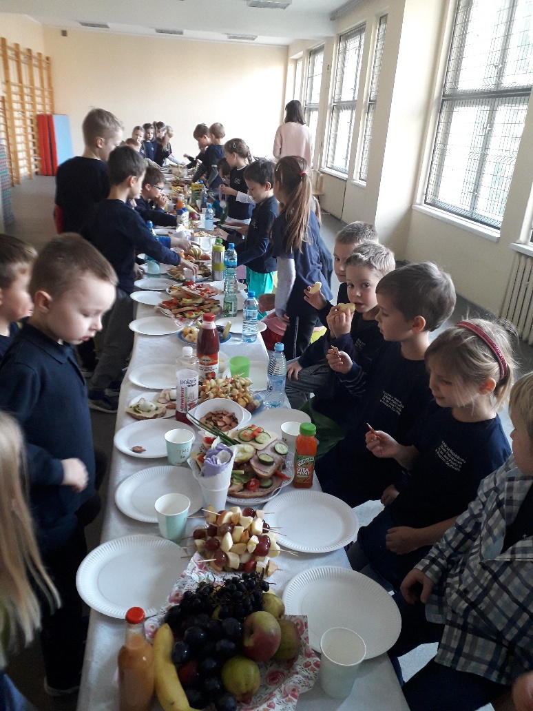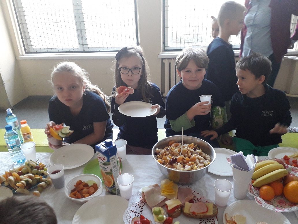 Już kolejny rok bierzemy udział w projekcie "Śniadanie daje moc". Od rana wszyscy z uśmiechem na twarzy zabraliśmy się do pracy. Przygotowaliśmy kolorowe i zdrowe kanapki. Następnie spotkaliśmy się z klasami 0-II na sali gimnastycznej, gdzie czekał na nas pięknie udekorowany stół. Każda klasa przyniosła inna potrawę, którą wspólnie spożywaliśmy.