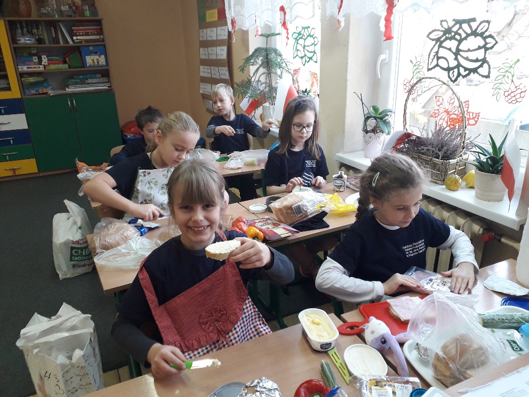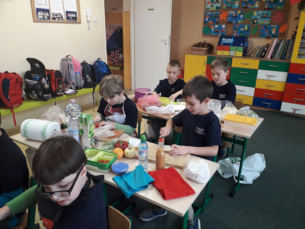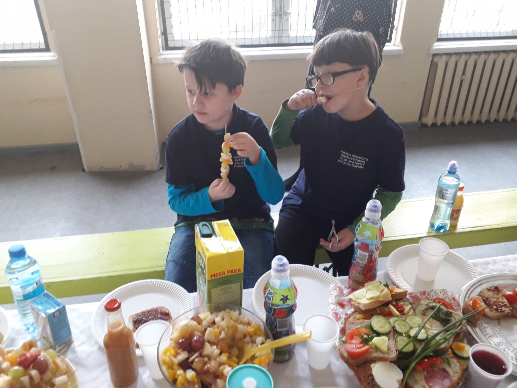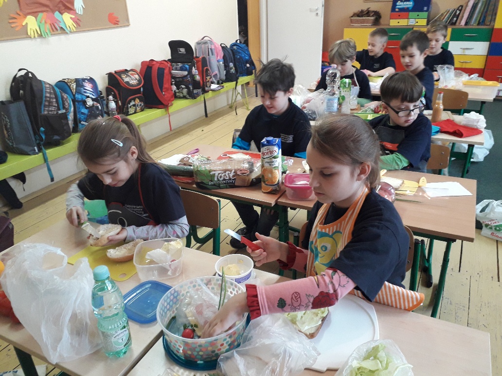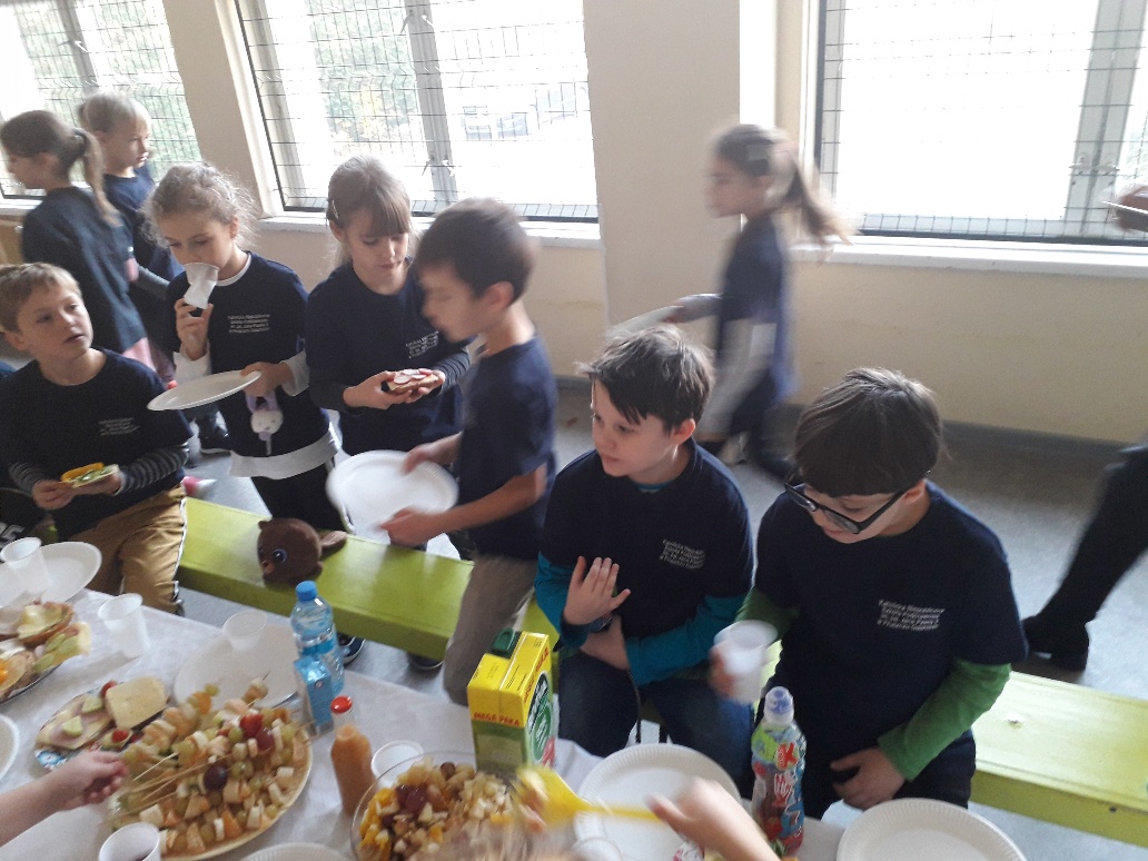 Już kolejny rok bierzemy udział w projekcie "Śniadanie daje moc". Od rana wszyscy z uśmiechem na twarzy zabraliśmy się do pracy. Przygotowaliśmy kolorowe i zdrowe kanapki. Następnie spotkaliśmy się z klasami 0-II na sali gimnastycznej, gdzie czekał na nas pięknie udekorowany stół. Każda klasa przyniosła inna potrawę, którą wspólnie spożywaliśmy.