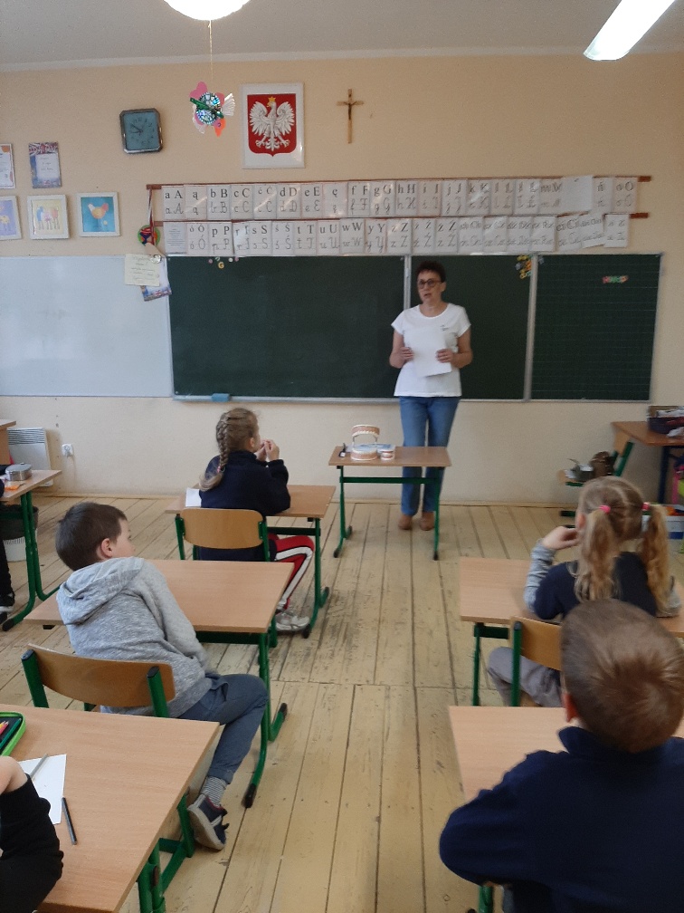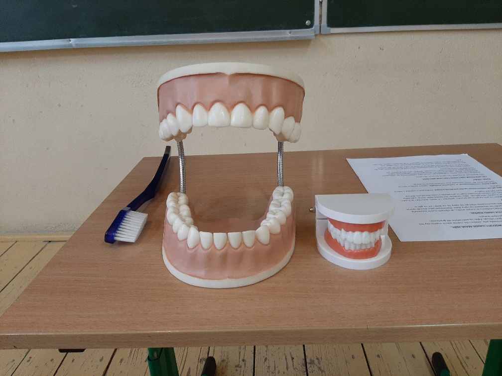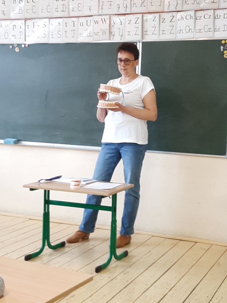 Uczniowie klasy drugiej uczestniczyli w prowadzonych przez szkolną panią pielęgniarkę w zajęciach profilaktycznych na temat higieny zębów.