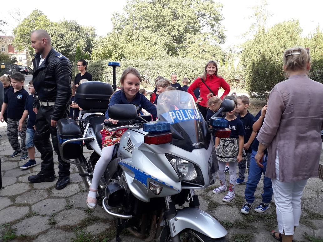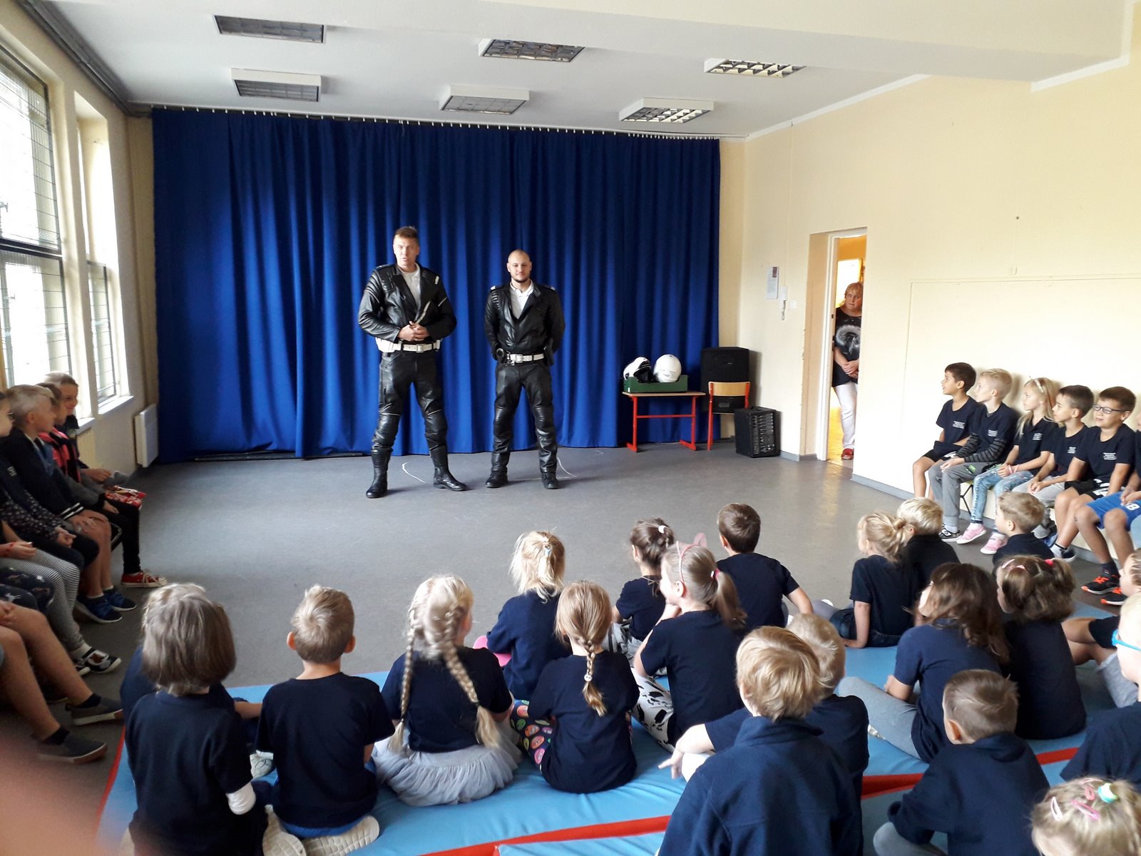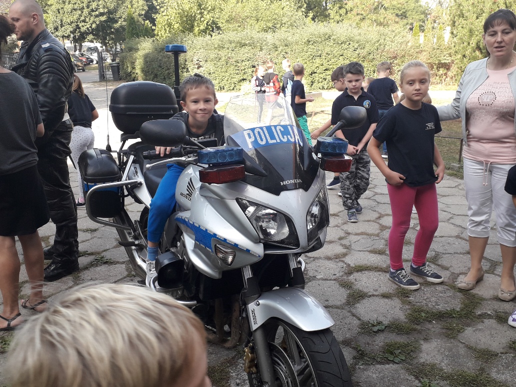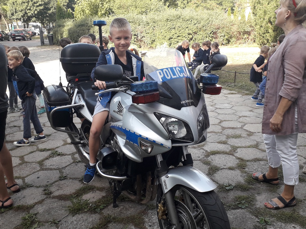 W naszej szkole było dzisiaj wielkie wydarzenie. Przyjechali policjanci na motorach. Najpierw była pogawędka na temat bezpiecznego poruszania się po drogach, a nastepnie każdy uczeń mógł poczuć się jak prawdziwy policjant: wsiąść na motor, obejrzeć kajdanki, zapoznać się z obsługą sygnalizacji świetlnej i dźwiękowej. Spotkanie zakończyło się zrobieniem wspólnego zdjęcia z funkcjonariuszami.