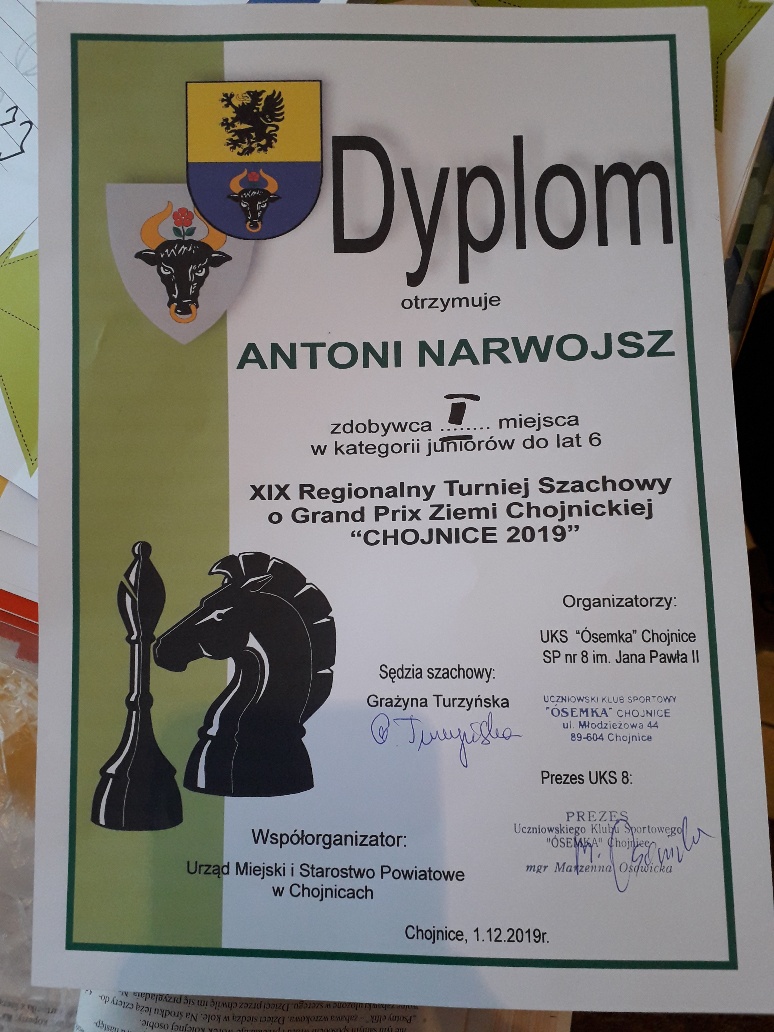 1 grudnia 2019 roku Antoś Narwojsz uczeń klasy 0 zdobył I miejsce w kategorii juniorów do lat 6 w XIX Regionalnym Turnieju Szachowym o Grand Prix Ziemi Chojnickiej "Chojnice 2019". Gratulujemy i życzymy dalszych sukcesów.