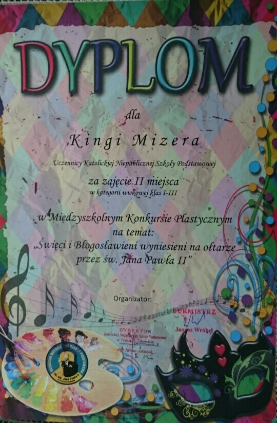Uczennica klasy III, Kinga Mizera zajęła II miejsce na poziomie kl. I-III w Międzyszkolnym Konkursie Plastycznym na temat: „Święci i Błogosławieni wyniesieni na ołtarze przez św. Jana Pawła II”.
