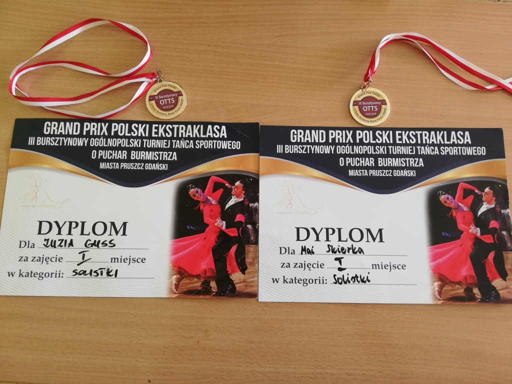 Z przyjemnością informujemy, że nasze pierwszoklasistki - Maja Skierka i Zuzanna Guss zajęły pierwsze miejsca w kategorii solistek w III Bursztynowym Ogólnopolskim Turnieju Tańca Sportowego o Puchar Burmistrza Miasta Pruszcz Gdański. Gratulujemy naszym utalentowanym tancerkom!
