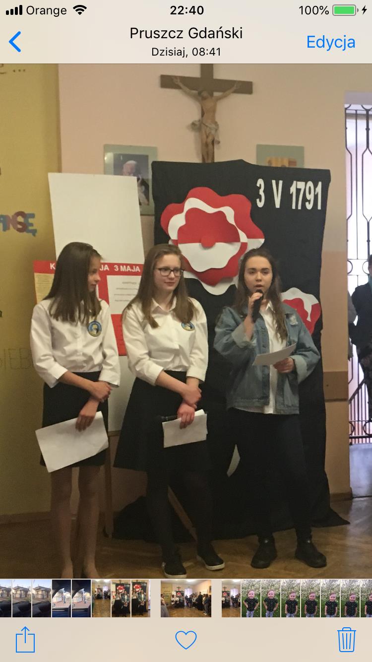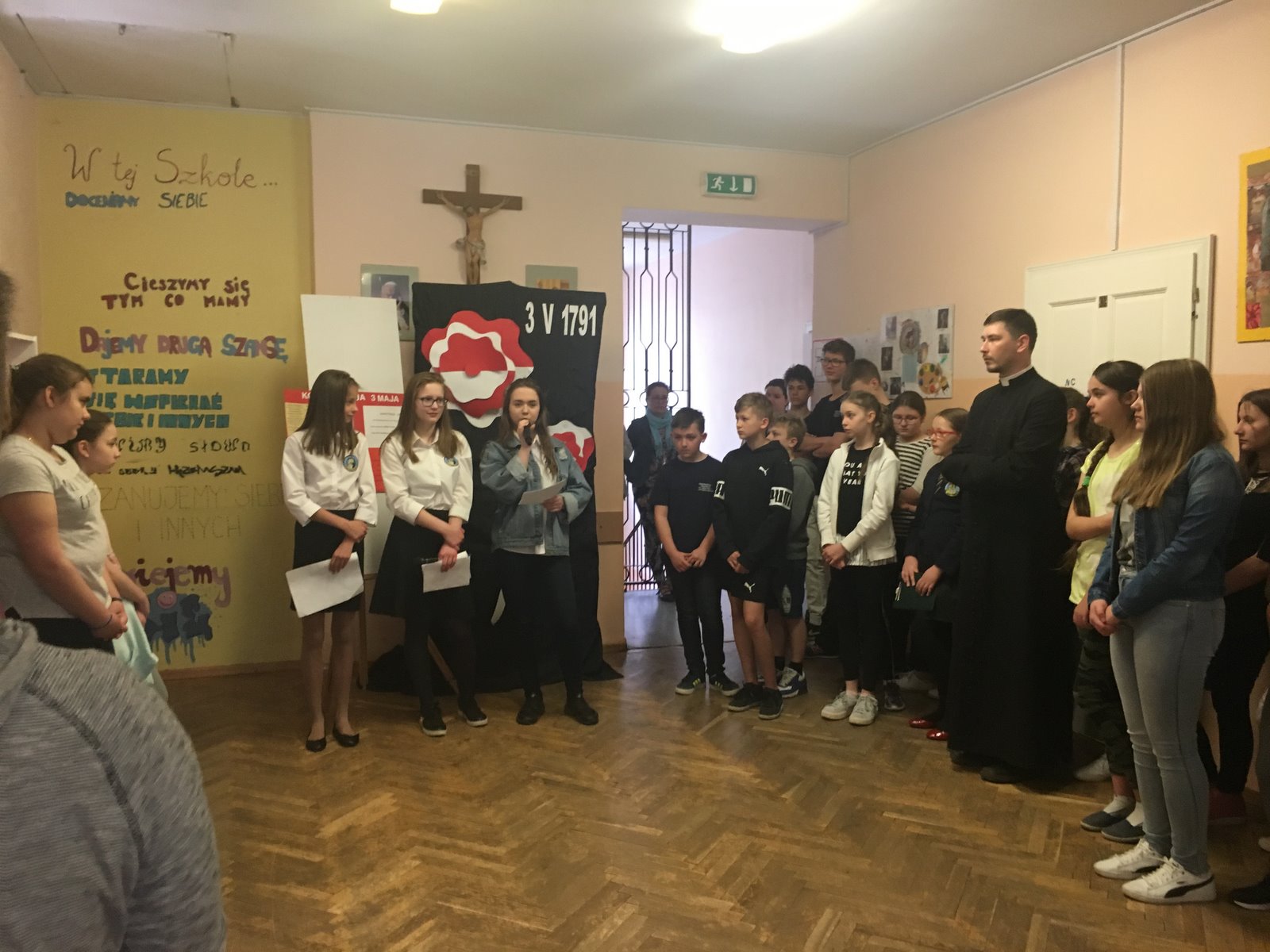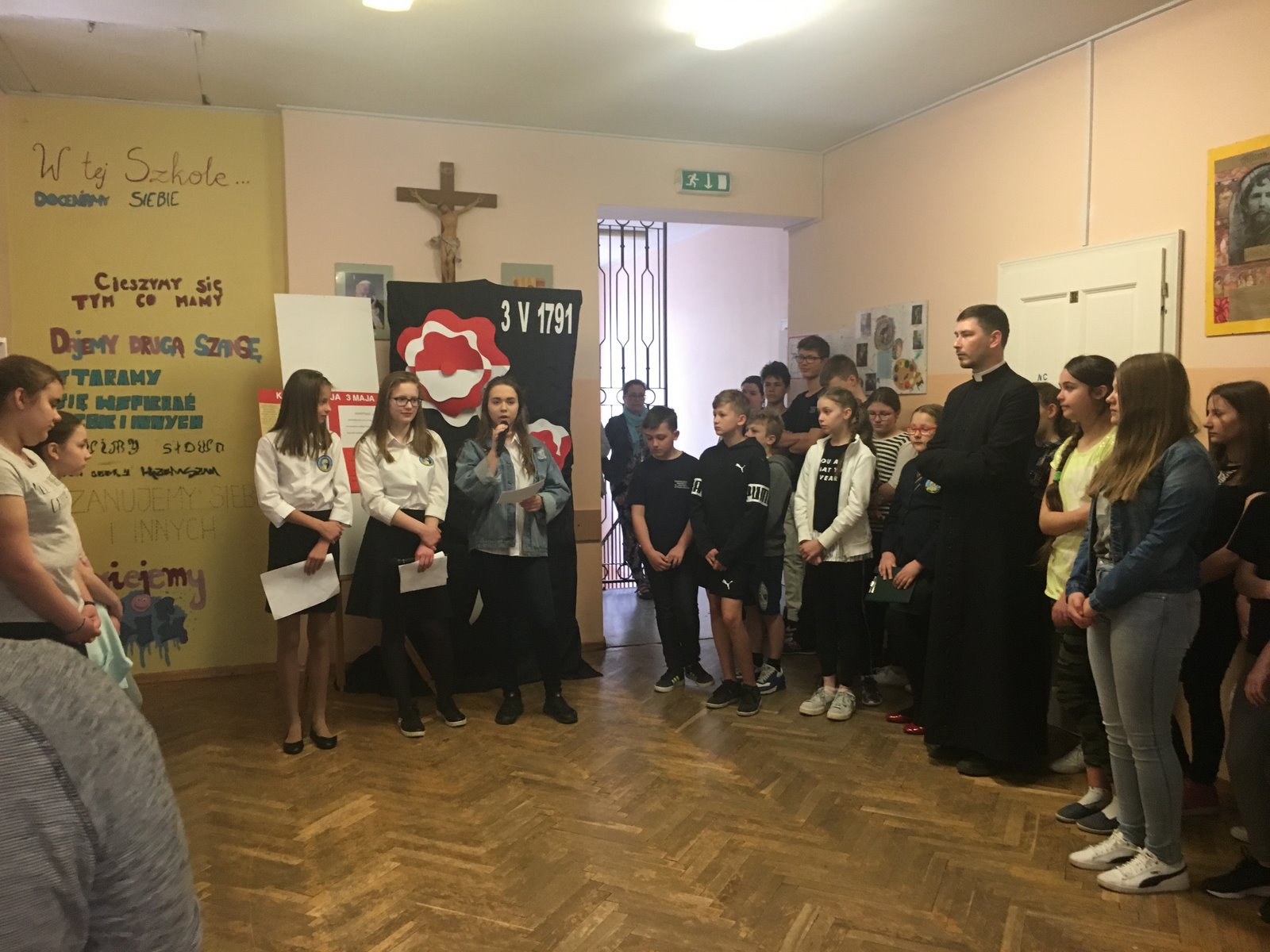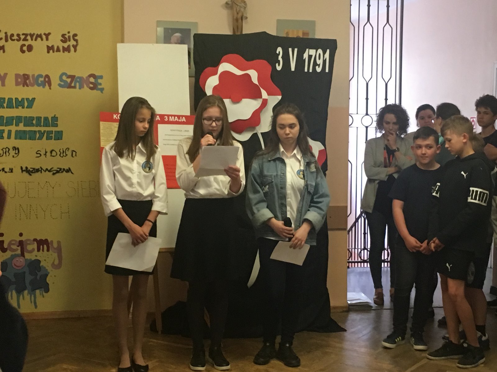 30 KWIETNIA 2018 roku W NASZEJ SZKOLE OBYŁA SIĘ UROCZYSTA AKADEMIA Z OKAZJI 227 ROCZNICY UCHWALENIA KONSTYTUCJI 3 MAJA. BYŁA TO PIERWSZA W EUROPIE, A DRUGA NA ŚWIECIE USTAWA REGULUJĄCA ZAKRES DZIAŁANIA WŁADZ PAŃSTWOWYCH ORAZ PRAW OBYWATELSKICH. UCZNIOWIE KLASY 2B GIMNAZJUM PRZYPOMNIELI WYDARZENIA I NAZWISKA SŁAWNYCH PATRIOTÓW Z JAKIMI WIĄŻE SIĘ DATA 3 MAJA 1791 roku. NIE ZABRAKŁO AKCENTÓW SYMBOLICZNYCH: BIAŁO-CZERWONEJ FLAGI, GODŁA I "MAZURKA DĄBROWSKIEGO". PO APELU WSZYSTKIE KLASY WZIĘŁY UDZIAŁ W PRZYGOTOWANYCH QUIZACH DOTYCZĄCYCH UROCZYSTOŚCI.
