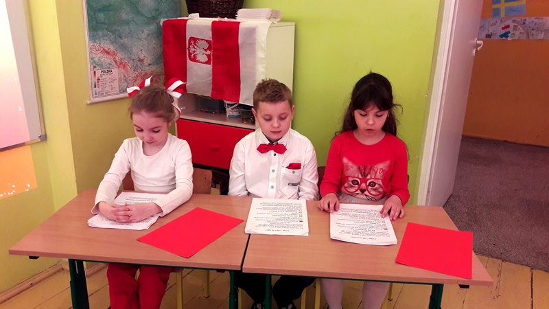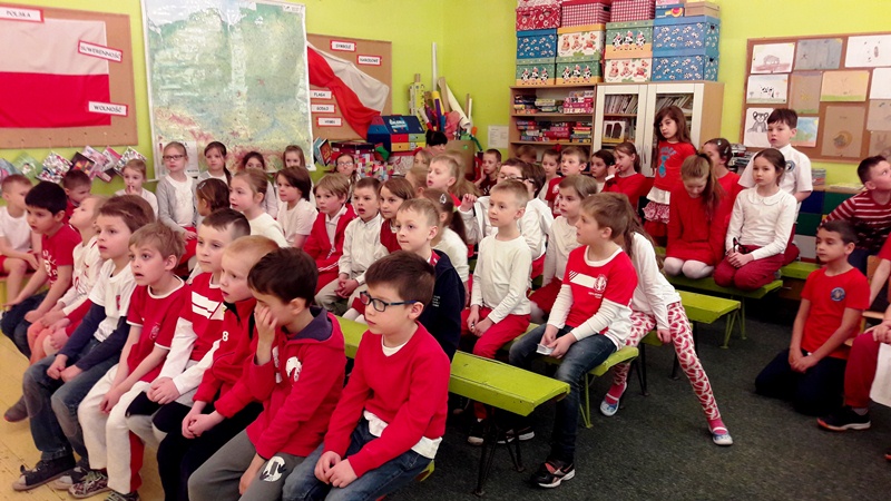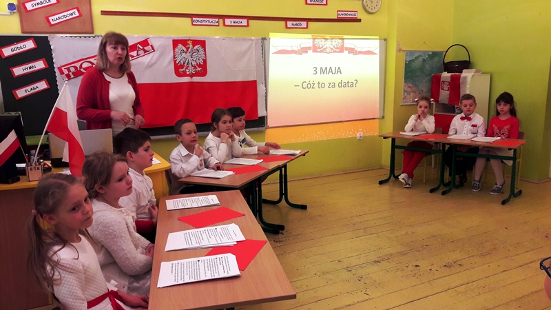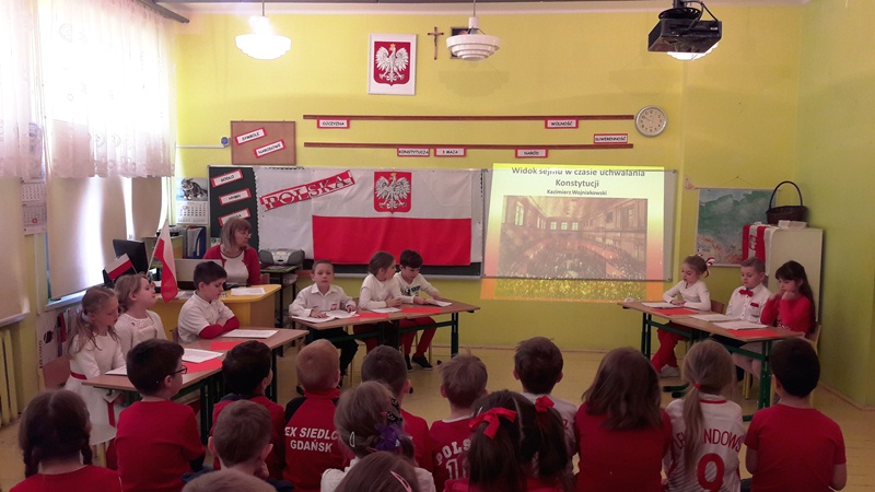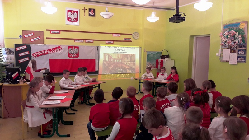 Uczniowie klasy II edukacji wczesnoszkolnej zaprezentowali dla klas 0-3 SP najważniejsze wydarzenia związane z obradami Sejmu Wielkiego i Konstytucją 3 Maja. Przygotowali prezentację, wystawę tematyczną oraz zaśpiewali „Majową Jutrzenkę”. Nie zabrakło też biało – czerwonych symboli i każdy uczeń otrzymał małą polską flagę.