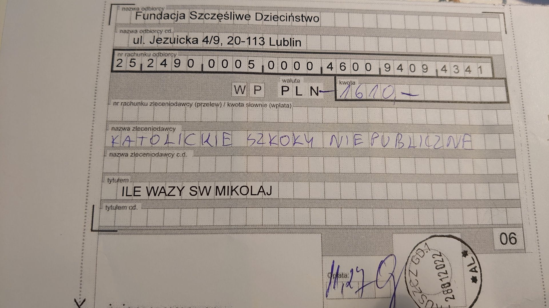 Darowizna została przekazana Fundacji Szczęśliwe Dzieciństwo, która prowadzi ośrodki wsparcia dziennego, w których dzieci rozwijają swoje talenty i pasje, przygotowując się do dorosłego życia pod okiem prawdziwych wychowawców.