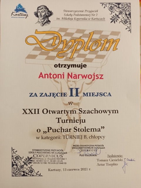 Uczeń klasy pierwszej - Antoś Narwojsz nadal w doskonałej formie. Zdobył II miejsce w XXII Otwartym Szachowym Turnieju o " Puchar Stolema" w kategorii B, chłopcy.