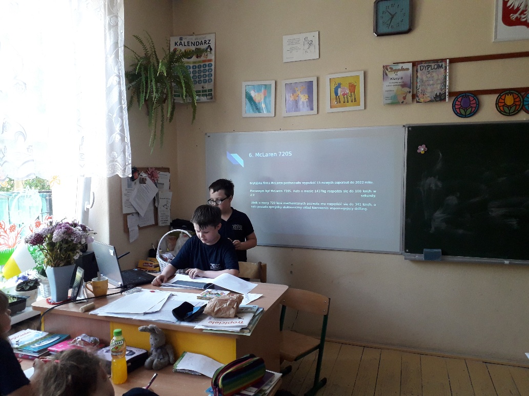 Adam i Kuba z klasy III przygotowali ciekawą lekcję pt. "Najszybsze samochody świata". Na początku zajęć zaprezentowali nam prezentację 6 najszybszych aut. Następnie był quiz dla uczniów i oczywiście nagrody dla najlepszych.