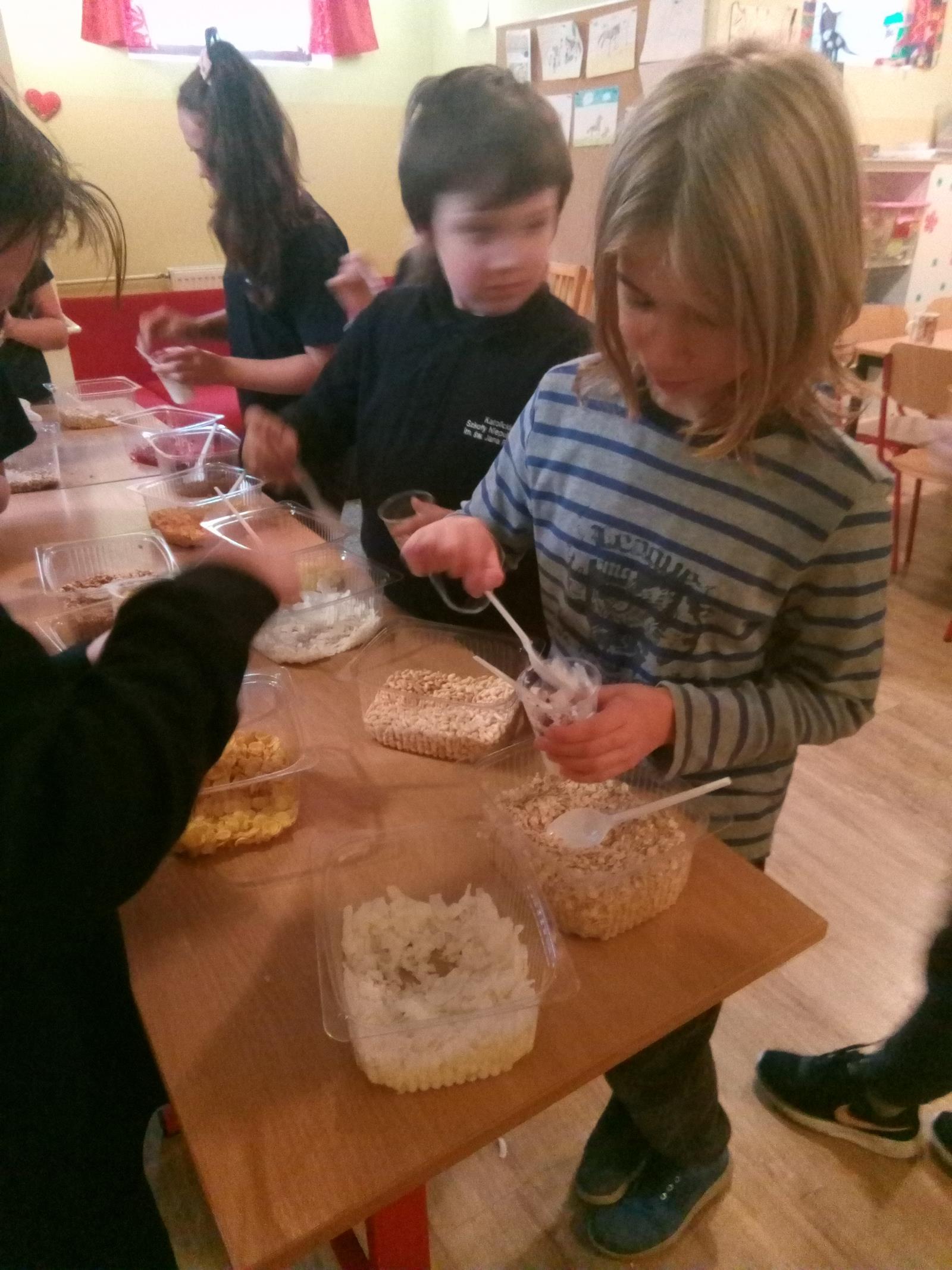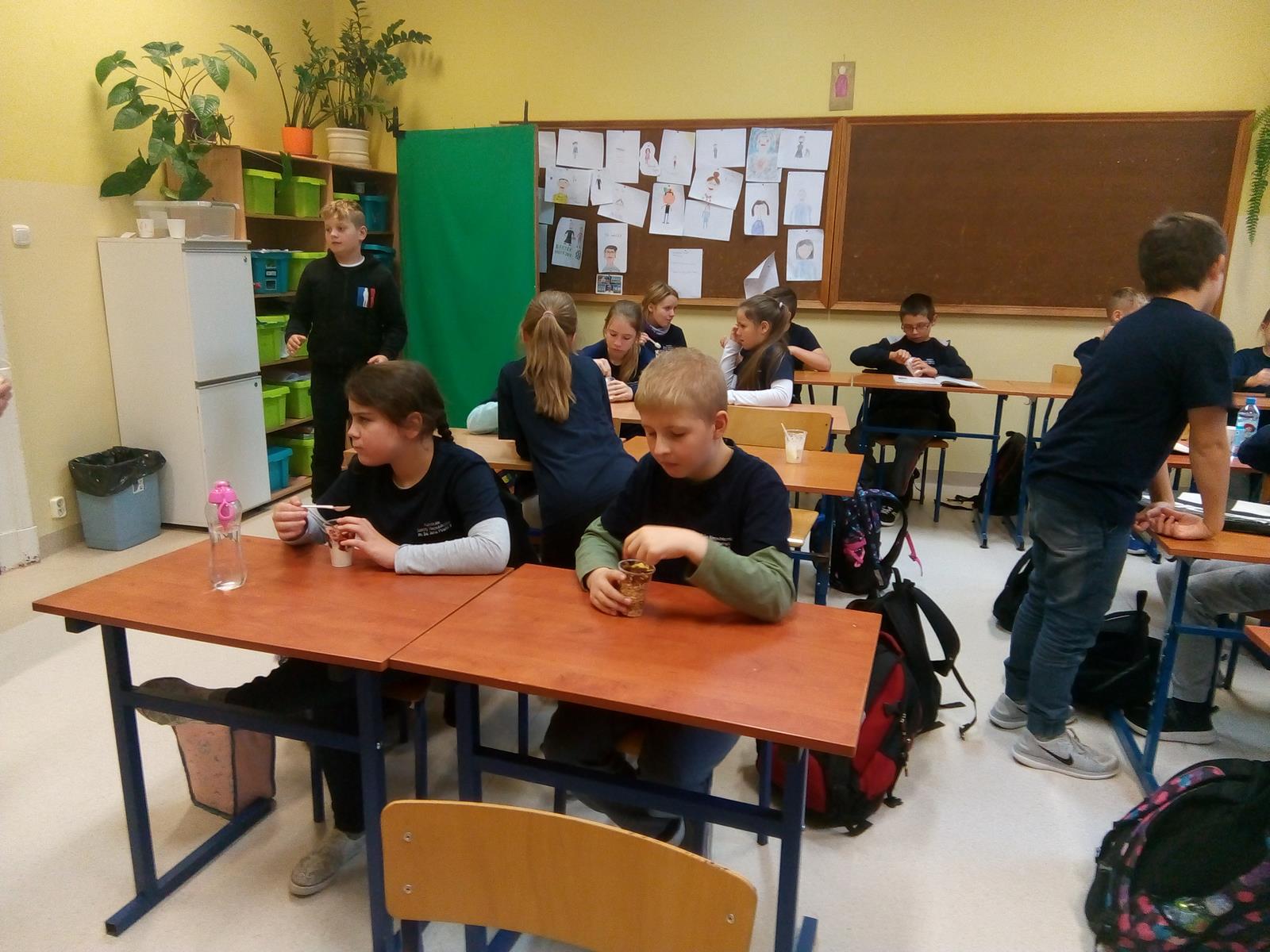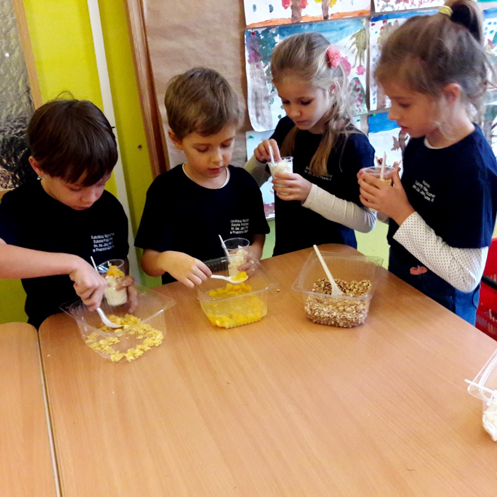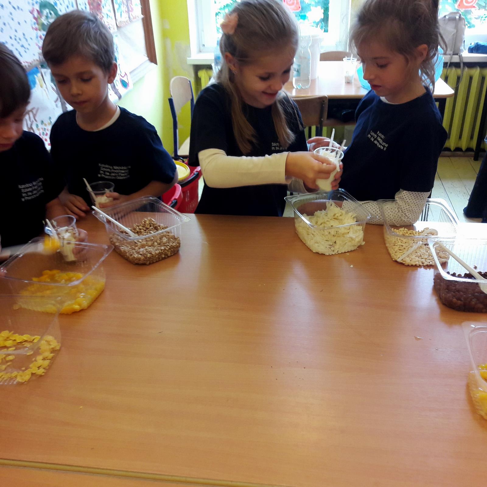 W dniu dzisiejszym, tj. 08.10.2019 r. gościliśmy w naszej szkole Panie z firmy Salvit-Prima. Celem spotkania były warsztaty dotyczące zdrowego żywienia. Panie opowiedziały uczniom o sposobie odżywiania, polegającym na przyjmowaniu substancji korzystnych dla zdrowia w celu zapewnienia lub poprawy zdrowia. Poruszony został także temat o produktach, które przez wieki nauczyliśmy się spożywać. Dzieci dowiedziały się, że jedne z nich są zdrowe, innych natomiast warto unikać. Bez względu na to, jaką dietę wybierzemy, powinniśmy przede wszystkim pamiętać o tym, by spożywać jak najwięcej owoców i warzyw, szczególnie surowych. Wybierając produkty zbożowe, warto decydować się szczególnie na te pełnoziarniste, które dostarczają naszym organizmom najlepsze składniki i są najlepiej przez nas przyswajane. Po wykładzie teoretycznym uczniowie sami przygotowali drugie śniadanie na bazie jogurtu naturalnego i dodatków, które samodzielnie dobierali.