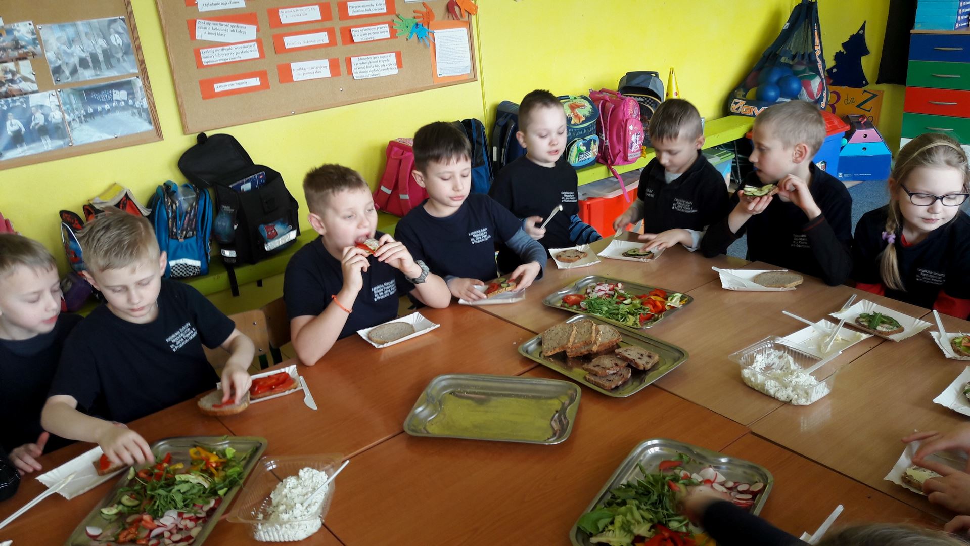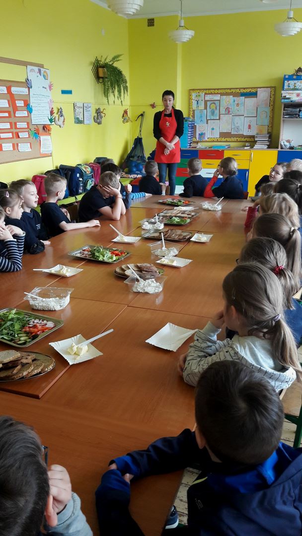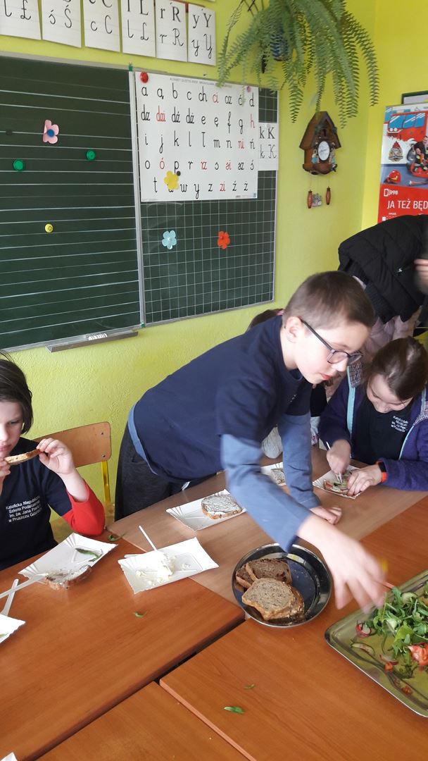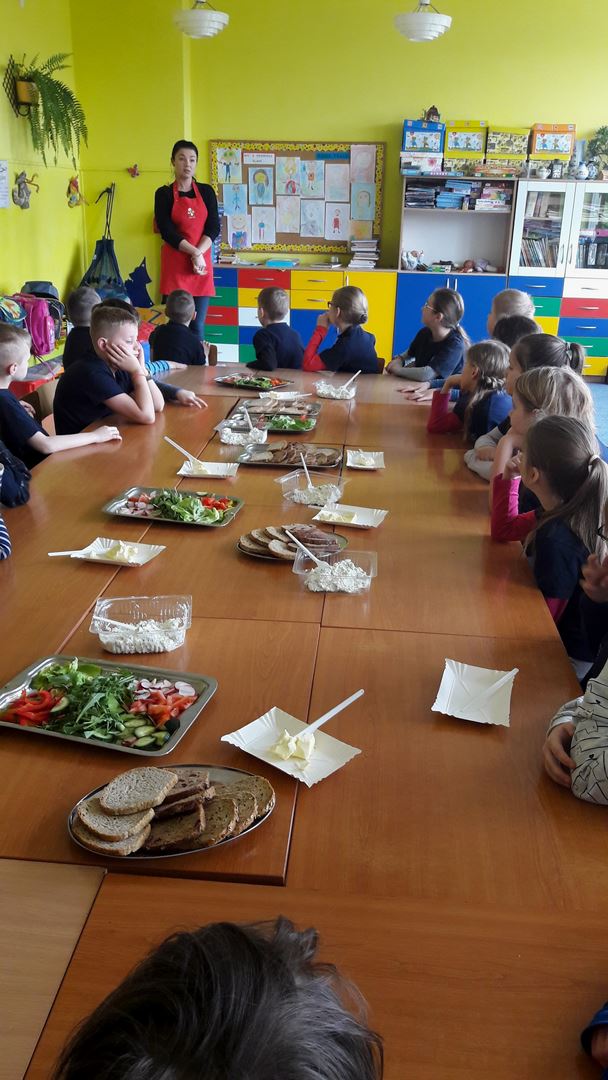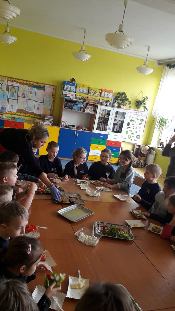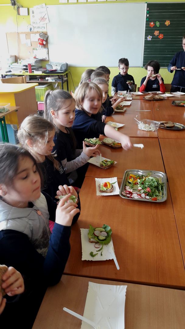 15 marca dla uczniów edukacji wczesnoszkolnej odbyły się Warsztaty Zdrowego Żywienia. Celem warsztatów było kreowanie właściwych nawyków żywieniowych oraz wyrabianie nawyku sięgania po zdrową i ekologiczną żywność. Na zajęciach poruszano również temat wartości odżywczych warzyw i owoców. Po prelekcji uczniowie przeszli do działań praktycznych. Było smacznie i zdrowo.